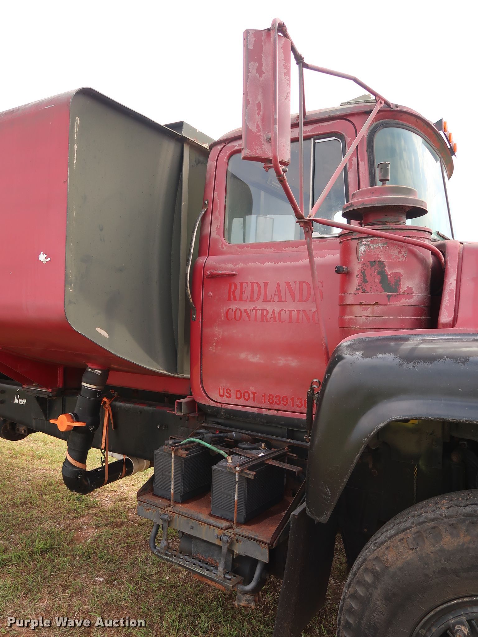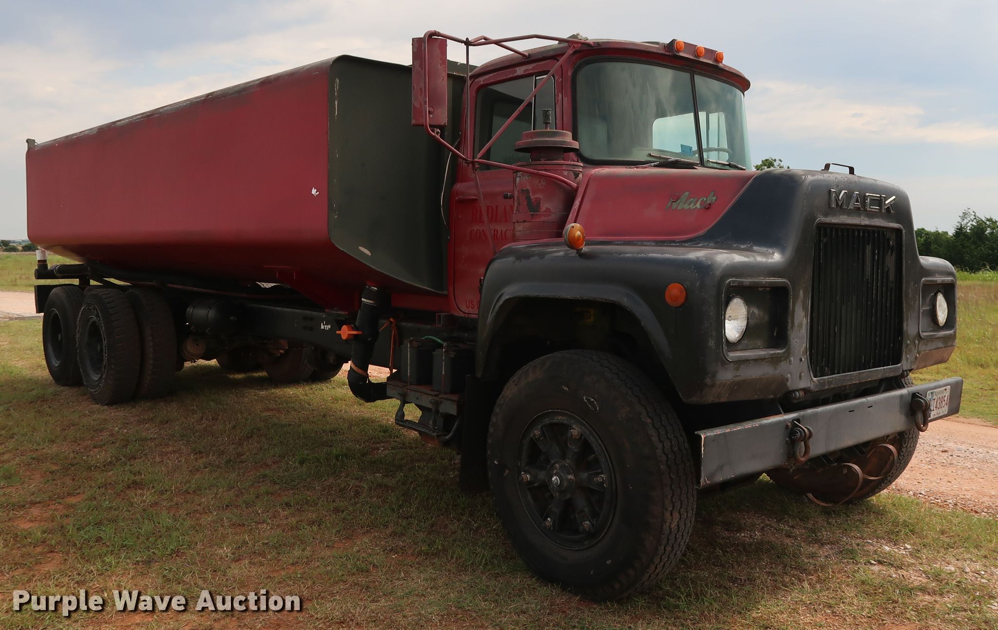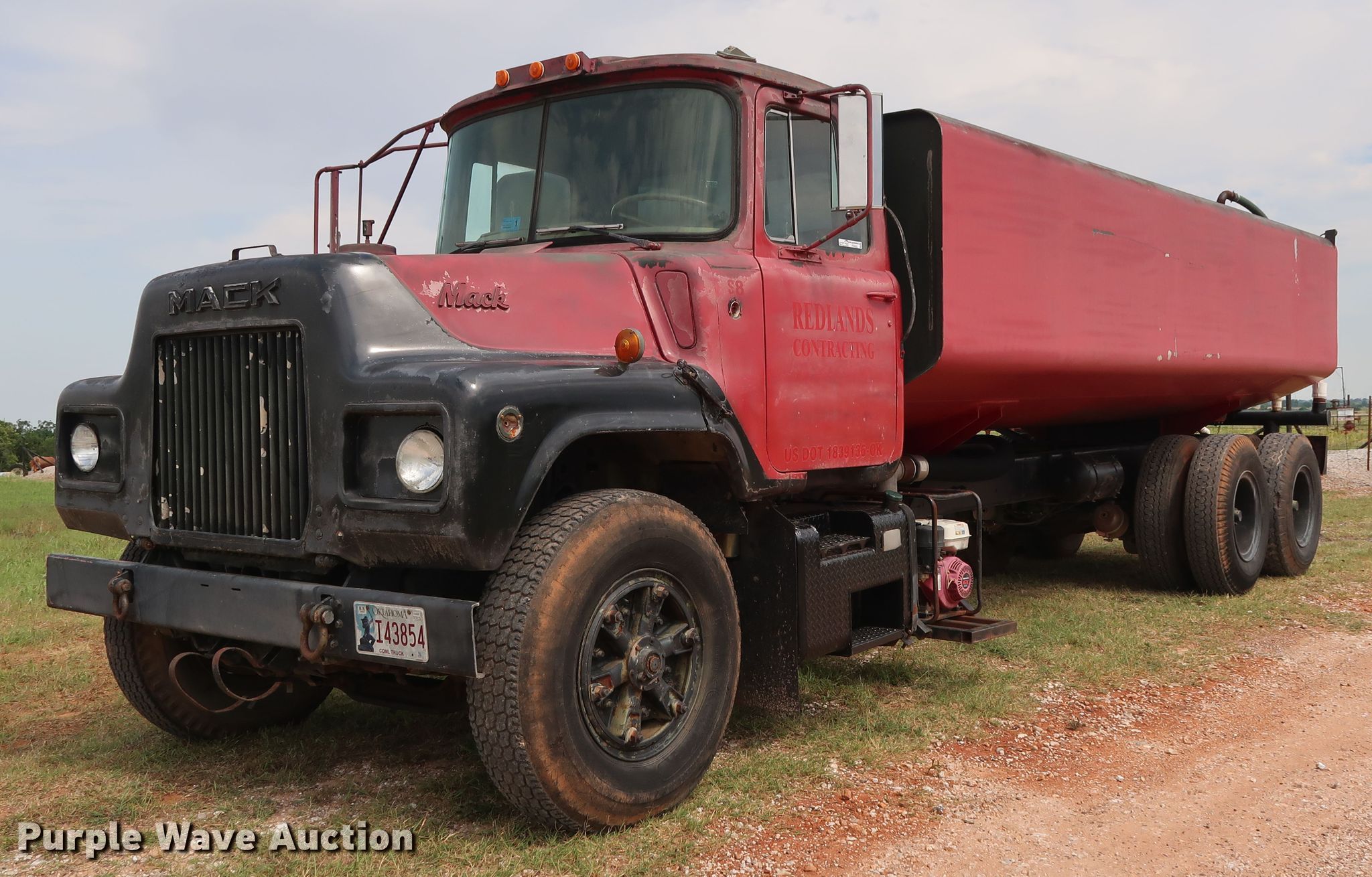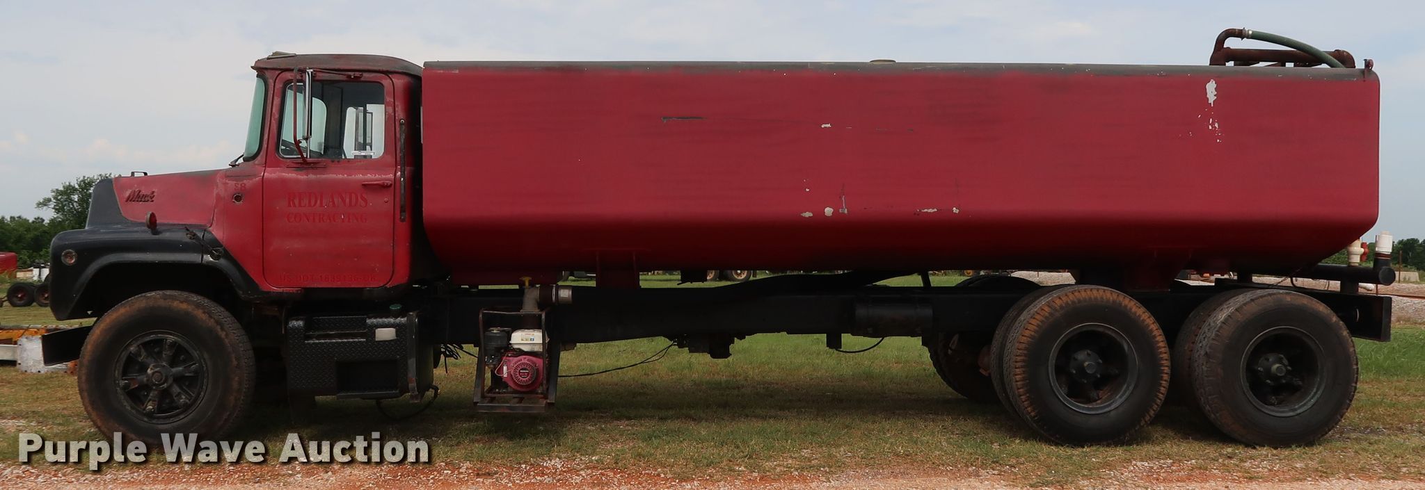 Purple Wave is selling a used Tank Truck or Water Truck in Oklahoma. This item is a 1982 Mack DM492S tank truck with the following: 111,463 miles on odometer, Caterpillar 3208 10.4L V8 diesel engine, 210 HP, Automatic transmission, TAndem axle, Heat, PTO, Kovatch K-500 tank, 20'L, 5,000 gallon capacity, Honda GX240 gas engine, Hale pump, Rear spray bar, Side discharge, Serial KM-221, 258" wheelbase, Camelback suspension, Air brakes, 11.00-20 tires, GVWR 58,000 lbs