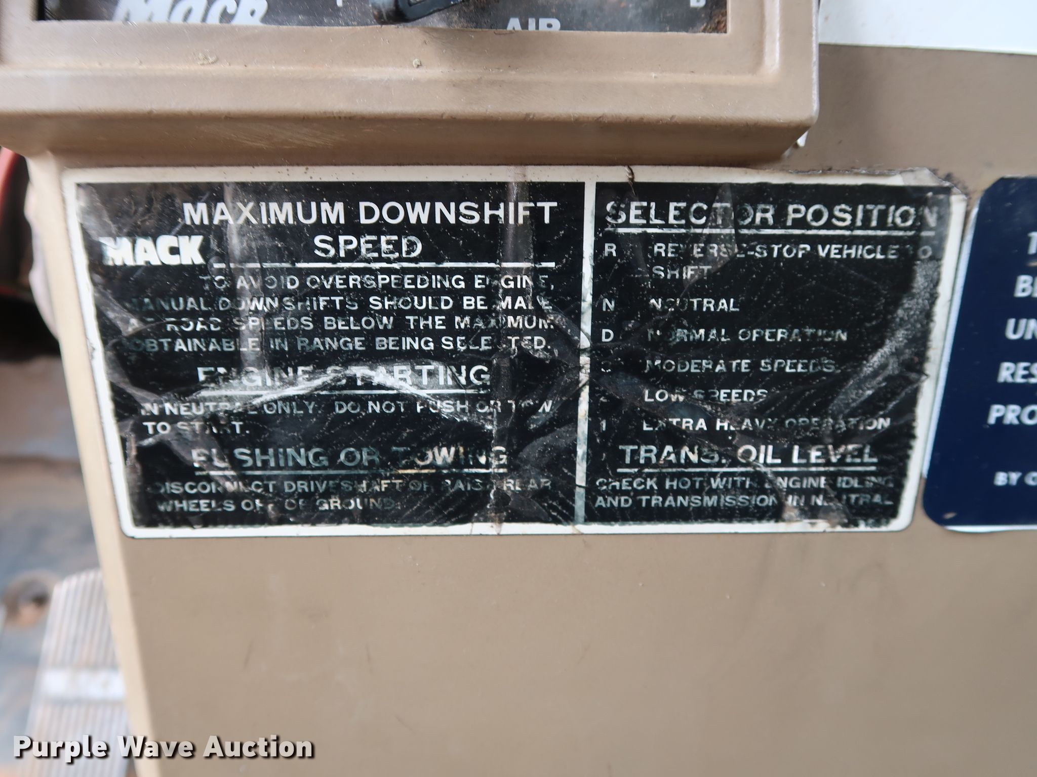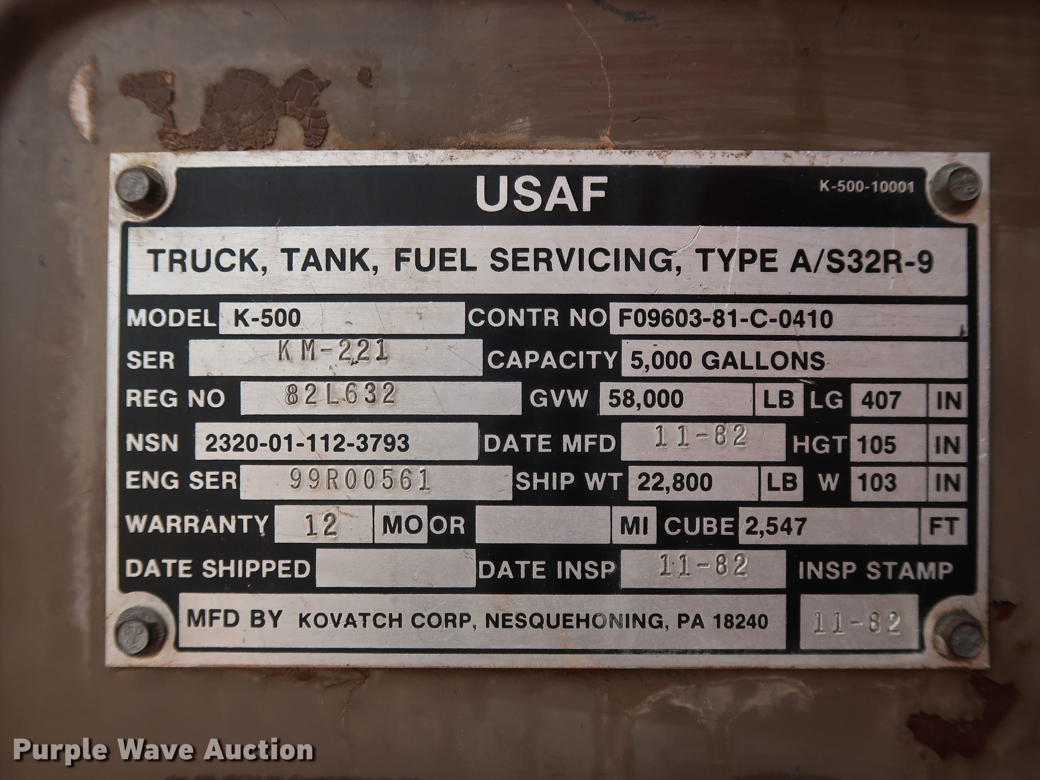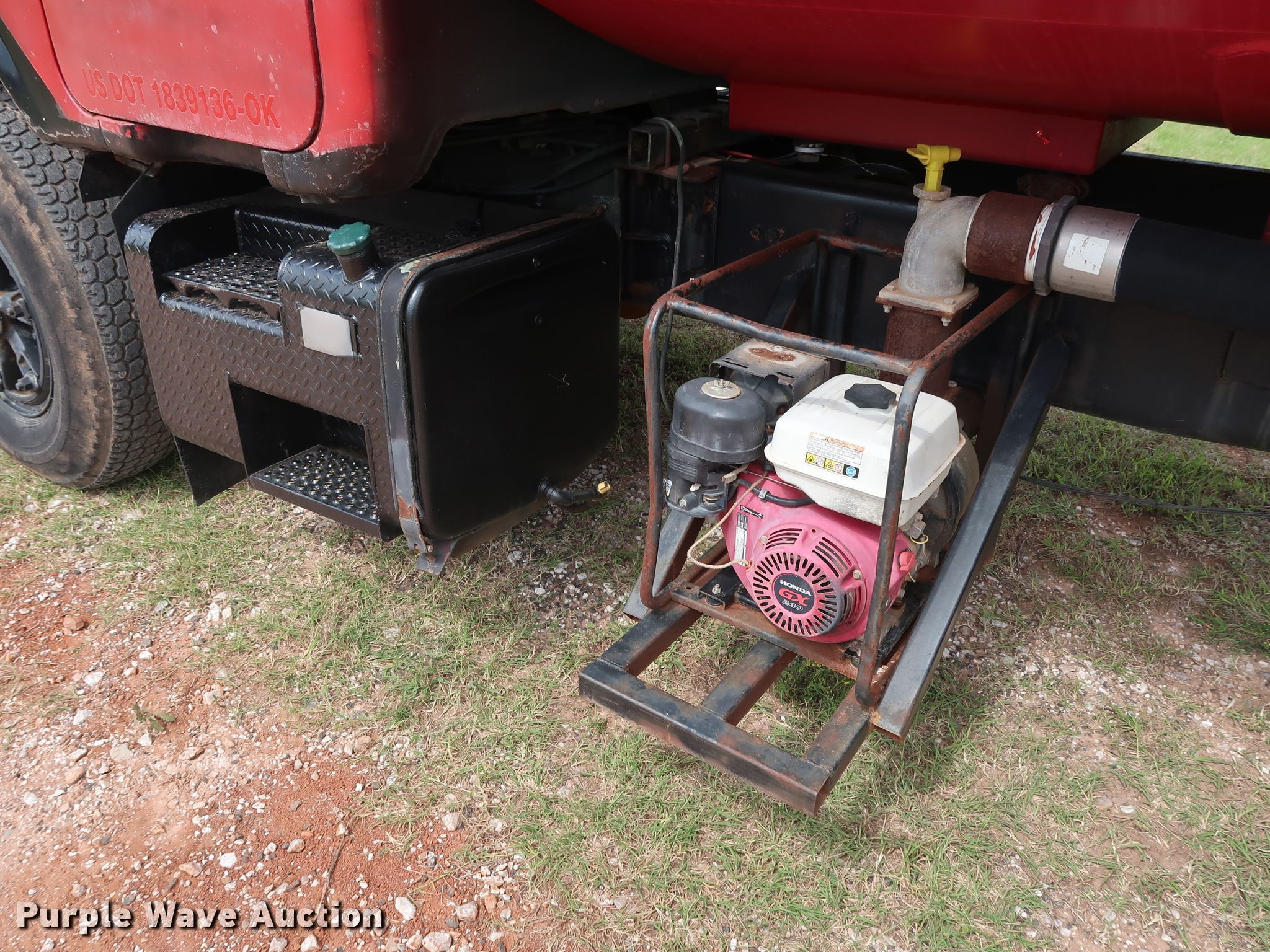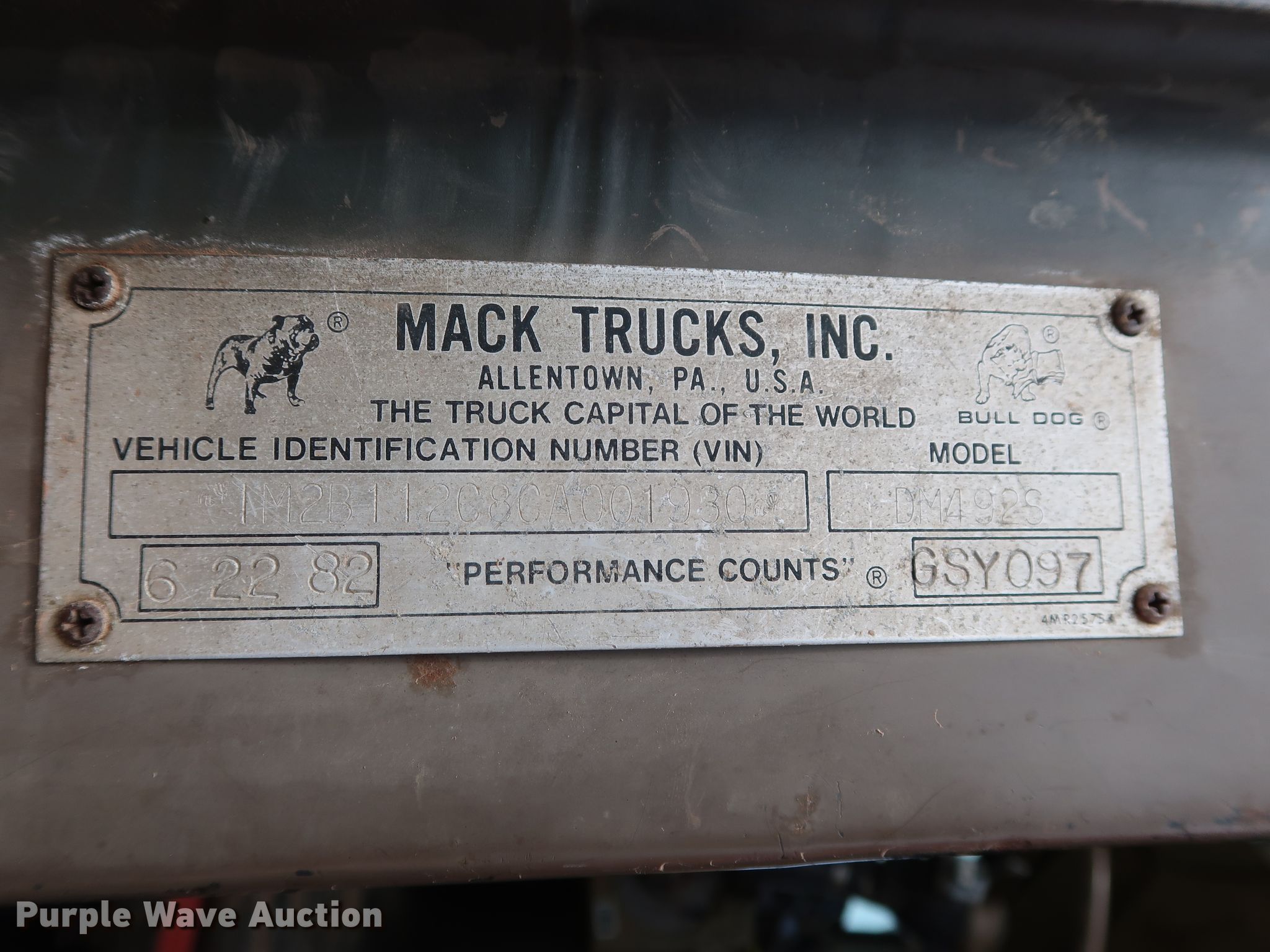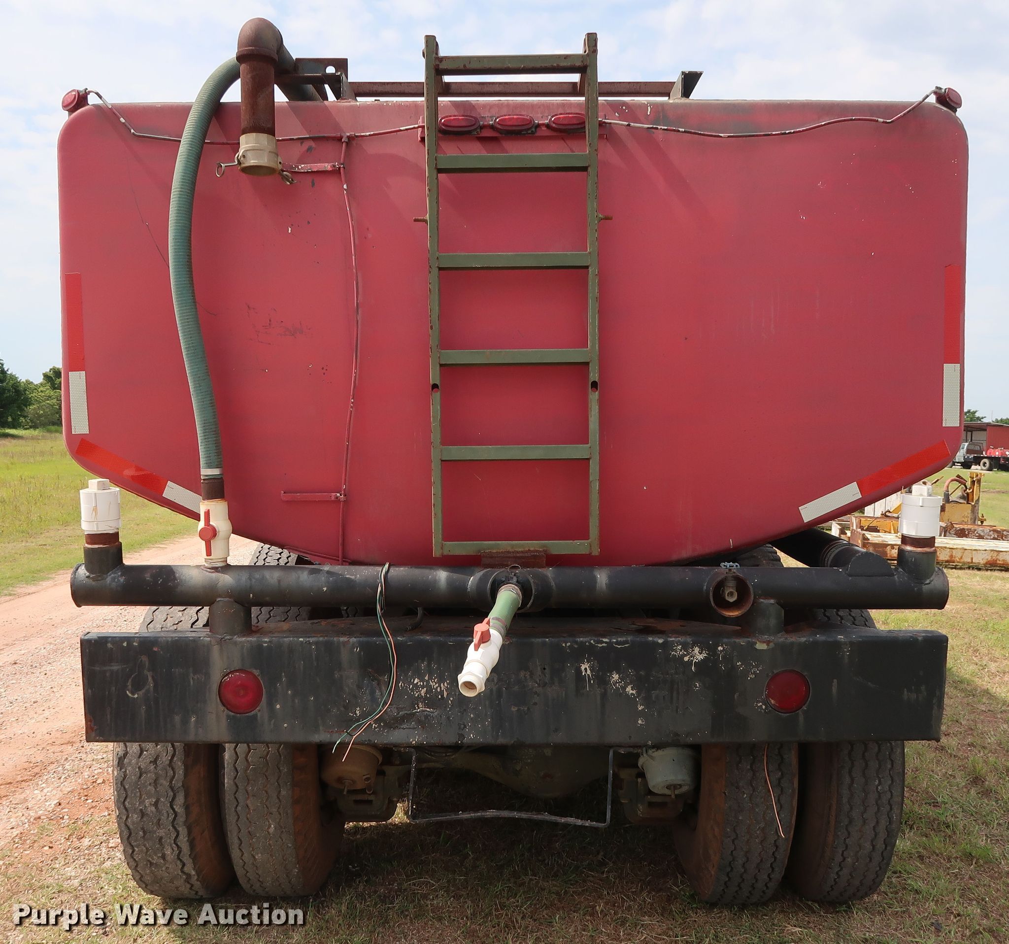 Purple Wave is selling a used Tank Truck or Water Truck in Oklahoma. This item is a 1982 Mack DM492S tank truck with the following: 111,463 miles on odometer, Caterpillar 3208 10.4L V8 diesel engine, 210 HP, Automatic transmission, TAndem axle, Heat, PTO, Kovatch K-500 tank, 20'L, 5,000 gallon capacity, Honda GX240 gas engine, Hale pump, Rear spray bar, Side discharge, Serial KM-221, 258" wheelbase, Camelback suspension, Air brakes, 11.00-20 tires, GVWR 58,000 lbs