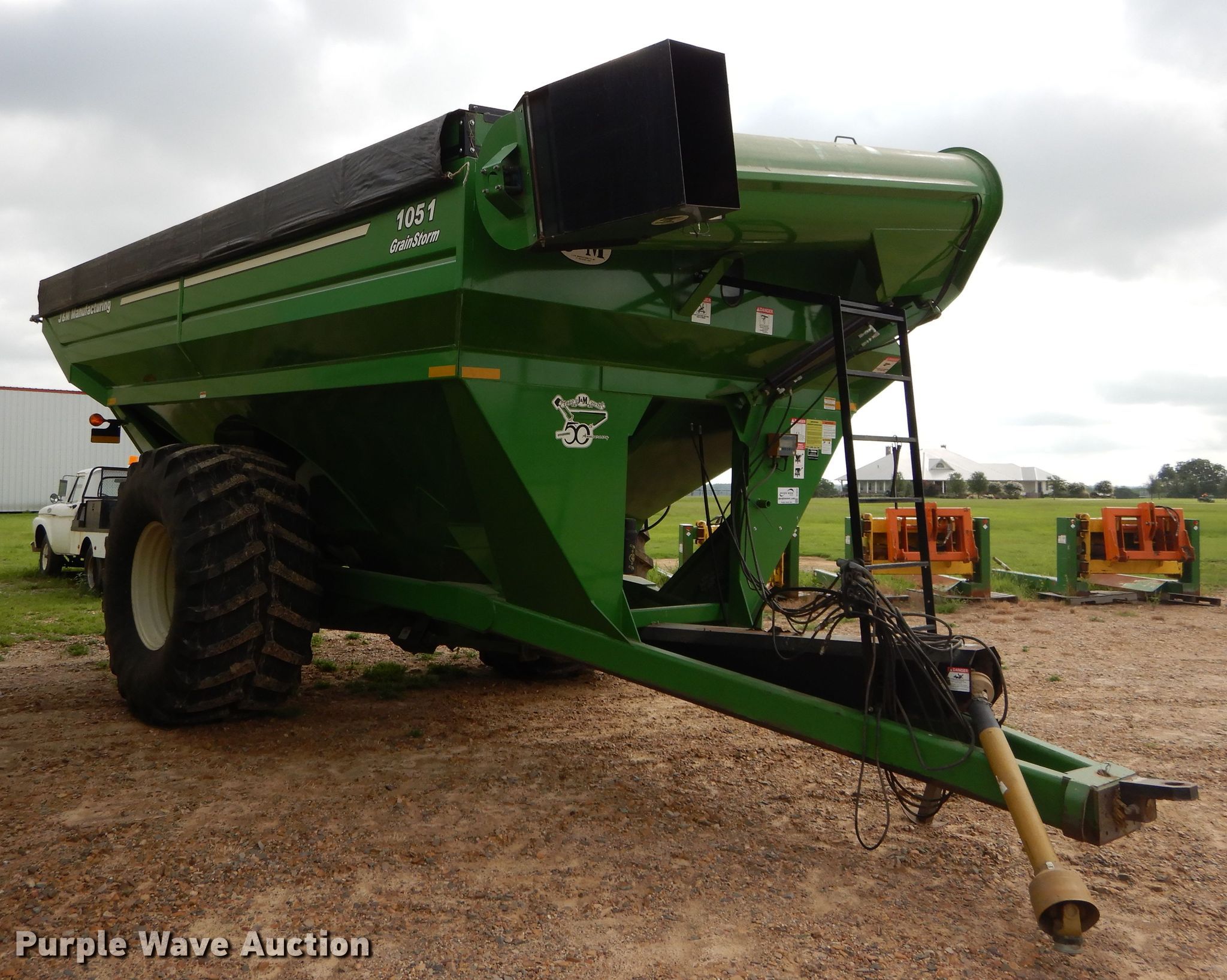 Purple Wave is selling a used Grain Cart or Gravity Wagon in Texas. This item is a J&M 1051-22S GrainStorm grain cart with the following: 1,050 bu. capacity, 8.5'L x 22" diameter discharge auger, Avery scales, Sight glass, Roll tarp, Firestone 900/60R32 tires, Serial 6144