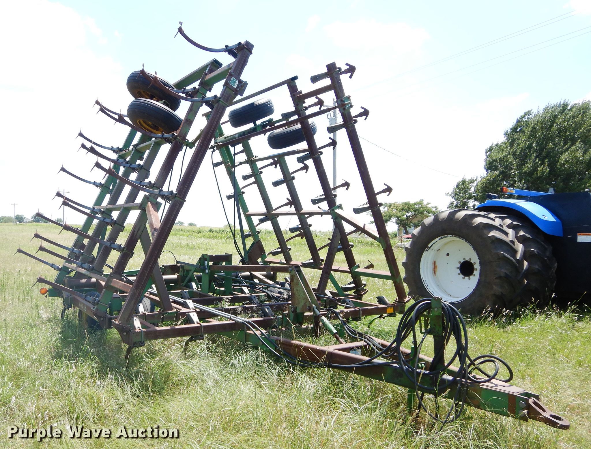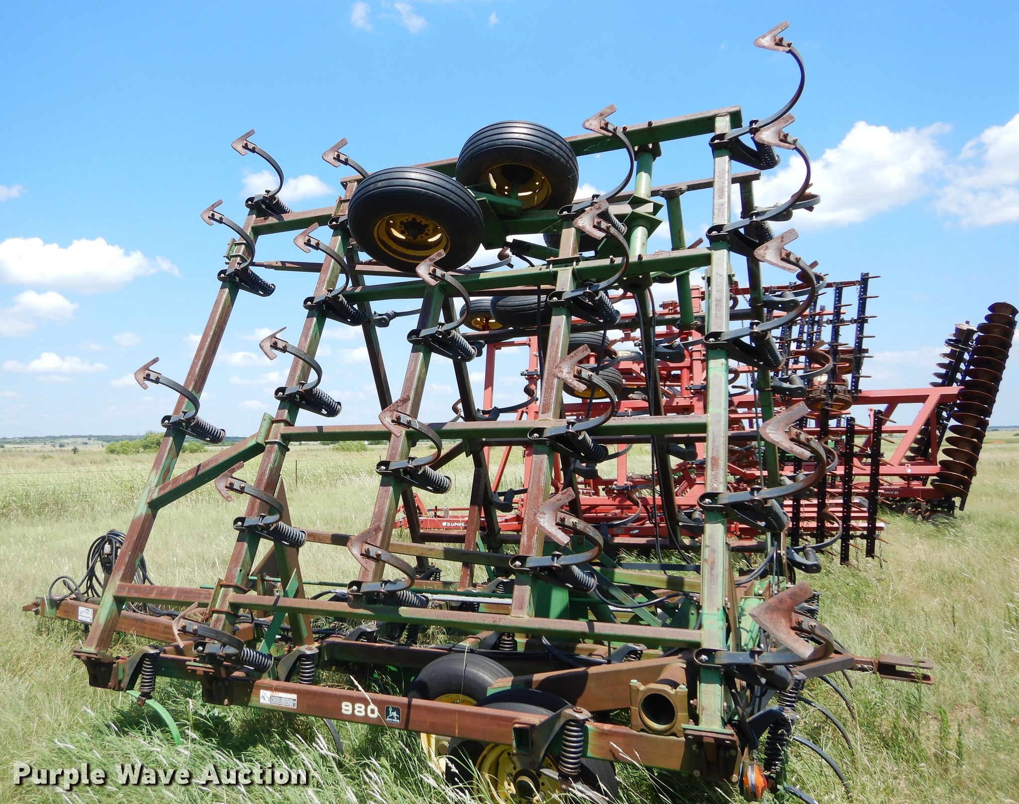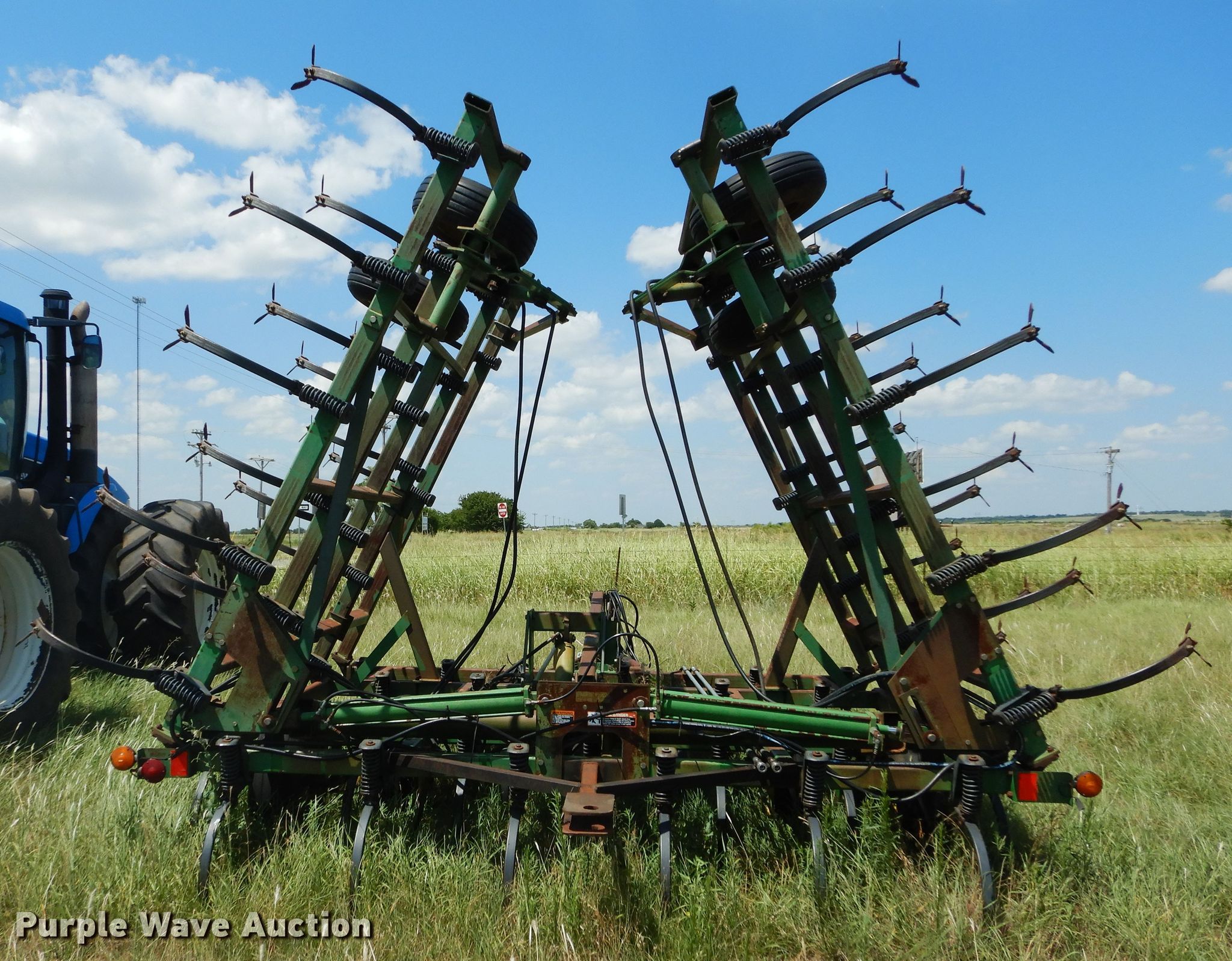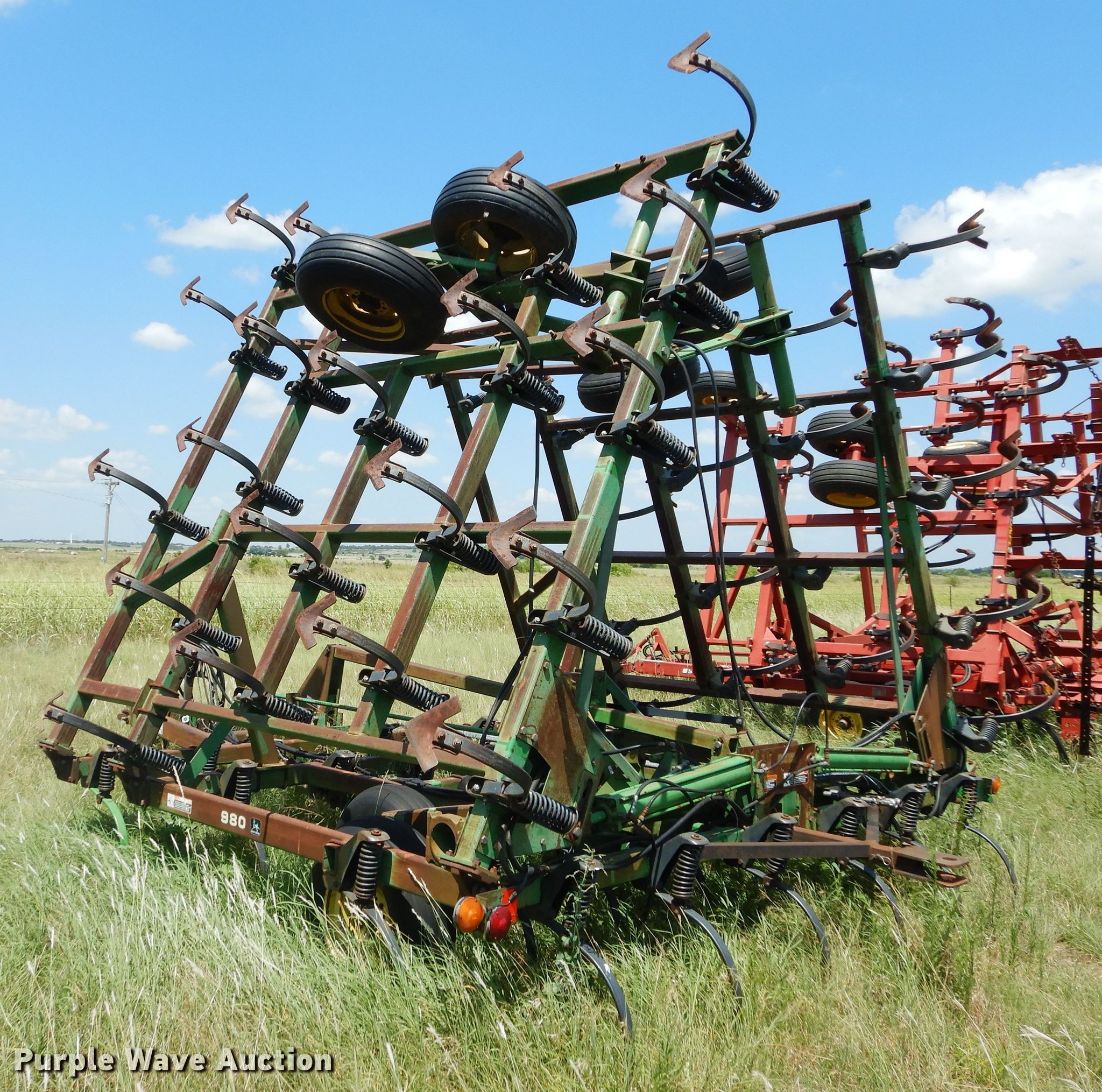 Purple Wave is selling a used Chisel in Oklahoma. This item is a John Deere 980 chisel with the following: 30'W, (53) 9"W sweeps, Tine harrow, Hydraulic lift and fold, Walking tandem axle, 9.5-15 tires, Serial N00980X002004