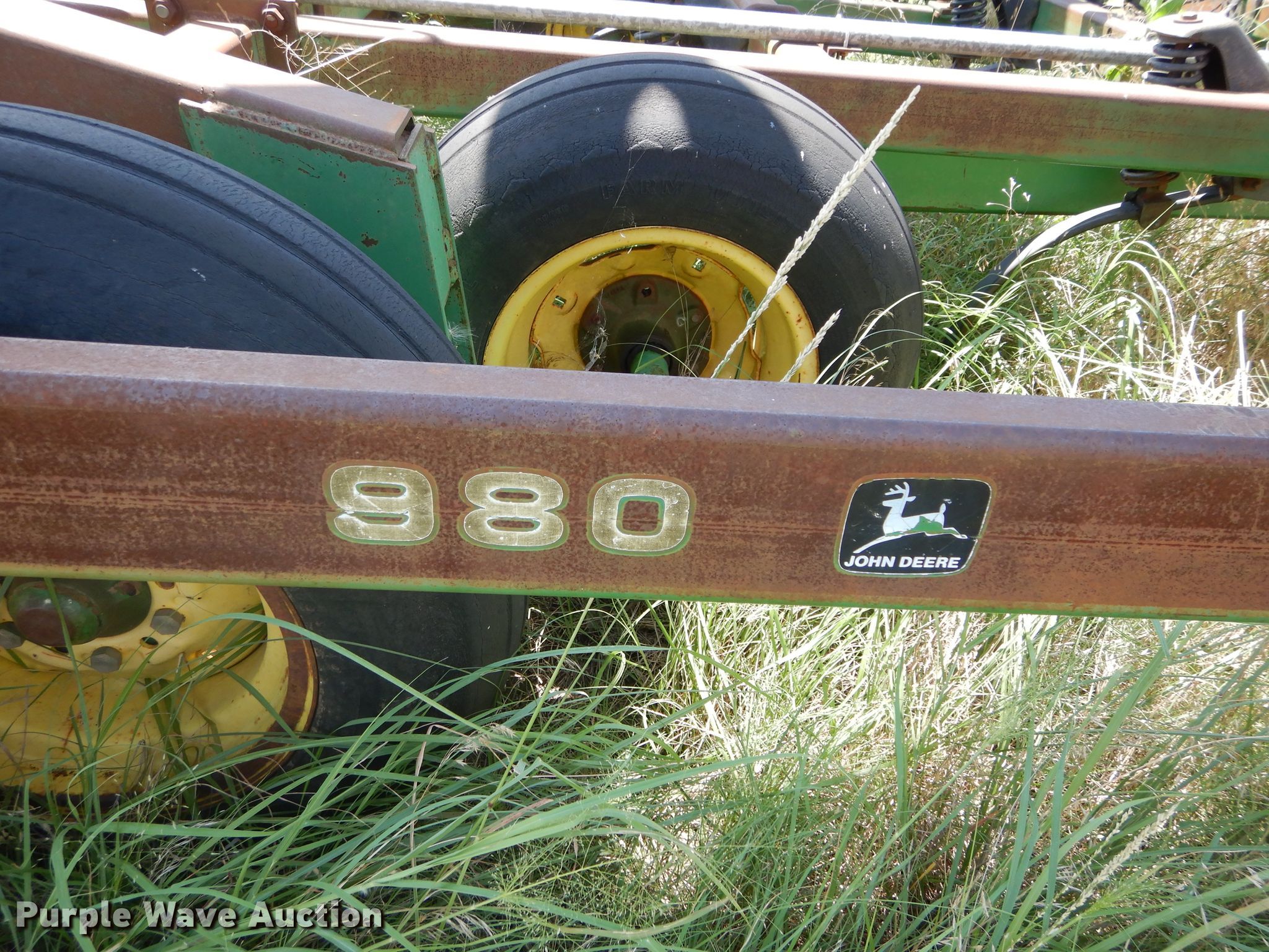John Deere 980 chisel. 30'W, (53) 9"W sweeps, Tine harrow, Hydraulic lift and fold, Walking tandem axle, 9.5-15 tires, Serial N00980X002004. Marlow, OK 73055