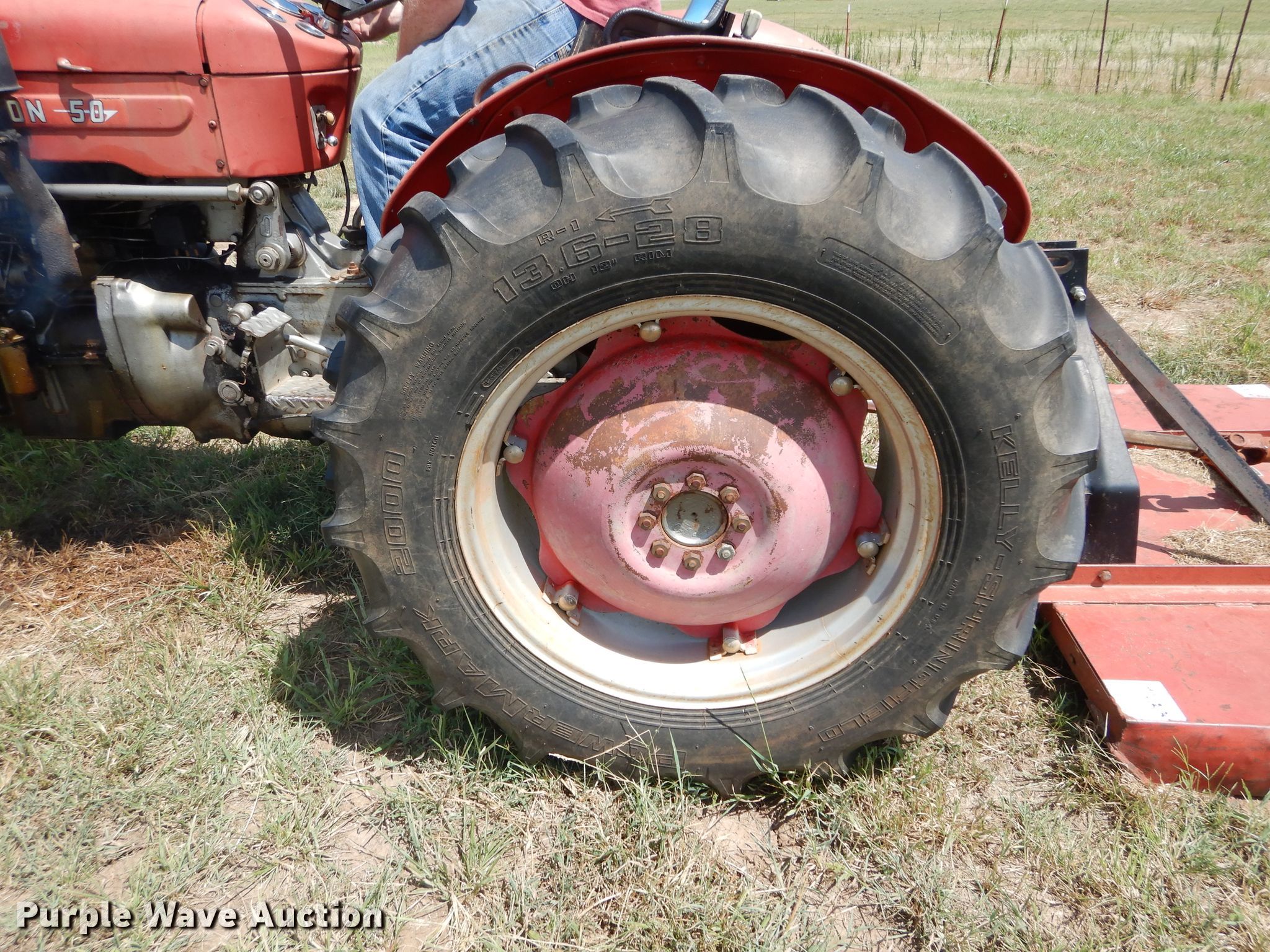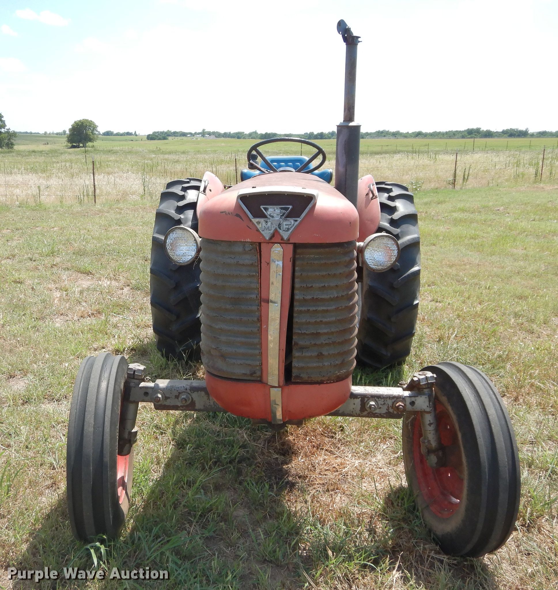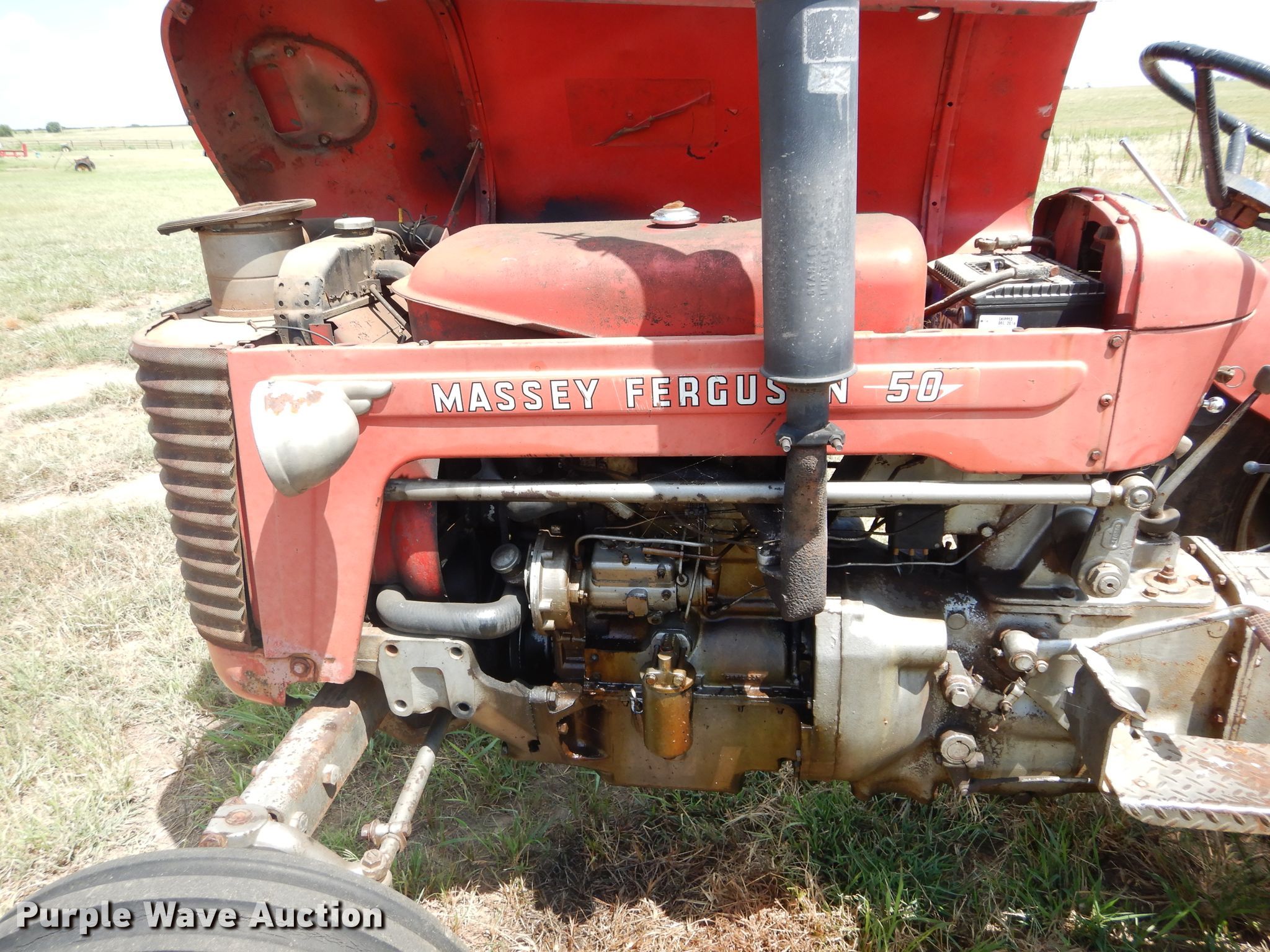Purple Wave is selling a used Tractor in Oklahoma. This item is a Massey-Ferguson 50 tractor with the following: 3,220 hours on meter, Three cylinder diesel engine, Manual transmission, 3F-1R gears, Three point, 540 PTO, 6.00-16 front tires, 13.6-28 rear tires, Diesel fuel leak, Rotary mower not included