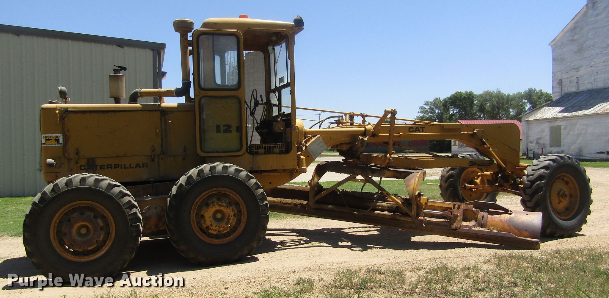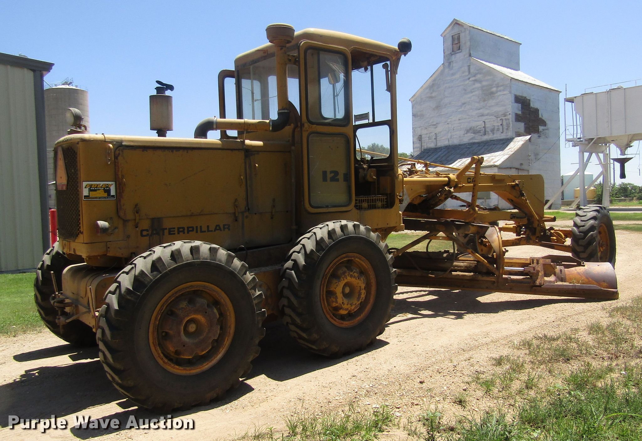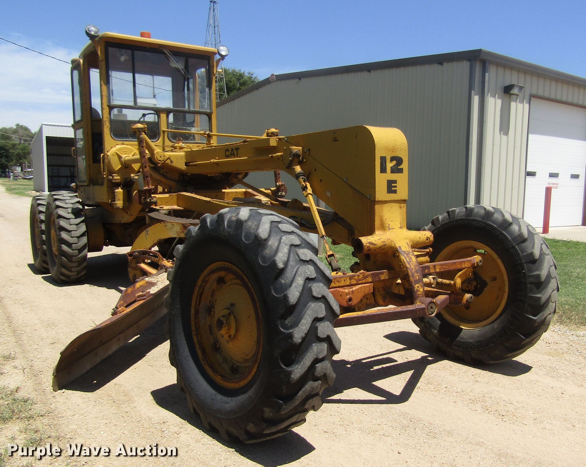 Purple Wave is selling a used Motor Grader in Kansas. This item is a 1963 Caterpillar 12E rigid frame motor grader with the following: Unknown hours on meter, Caterpillar six cylinder diesel engine, Direct drive transmission, 12F-4R gears, Enclosed cab, Heat, Seven hydraulic control valves, 15'W moldboard, Right blade extension, Tip control, Side shift, 13.00-24 tires, Additional tire and wheel, Unknown operating condition of heat, Glass cracked, Serial 99E8704