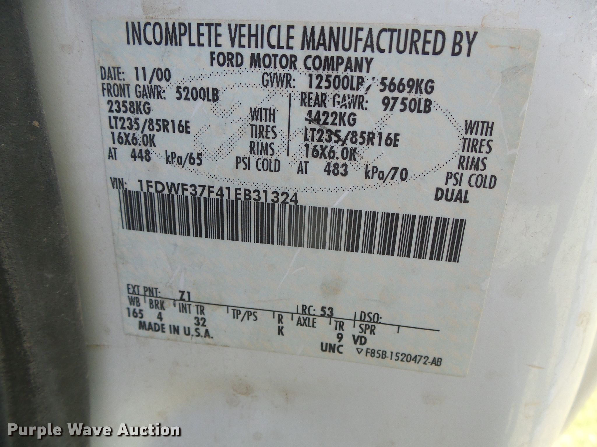 Purple Wave is selling a used 3/4 or 1 Ton Pickup or Van in Kansas. This item is a 2001 Ford F350 Super Duty XLT pickup truck cab and chassis with the following: 71,303 miles on odometer, 7.3L V8 OHV 16V diesel engine, Automatic transmission, Four wheel drive, AC and heat, Cruise, LT235/85R16 tires, Engine and transmission have been replaced, Intermittent electrical issues