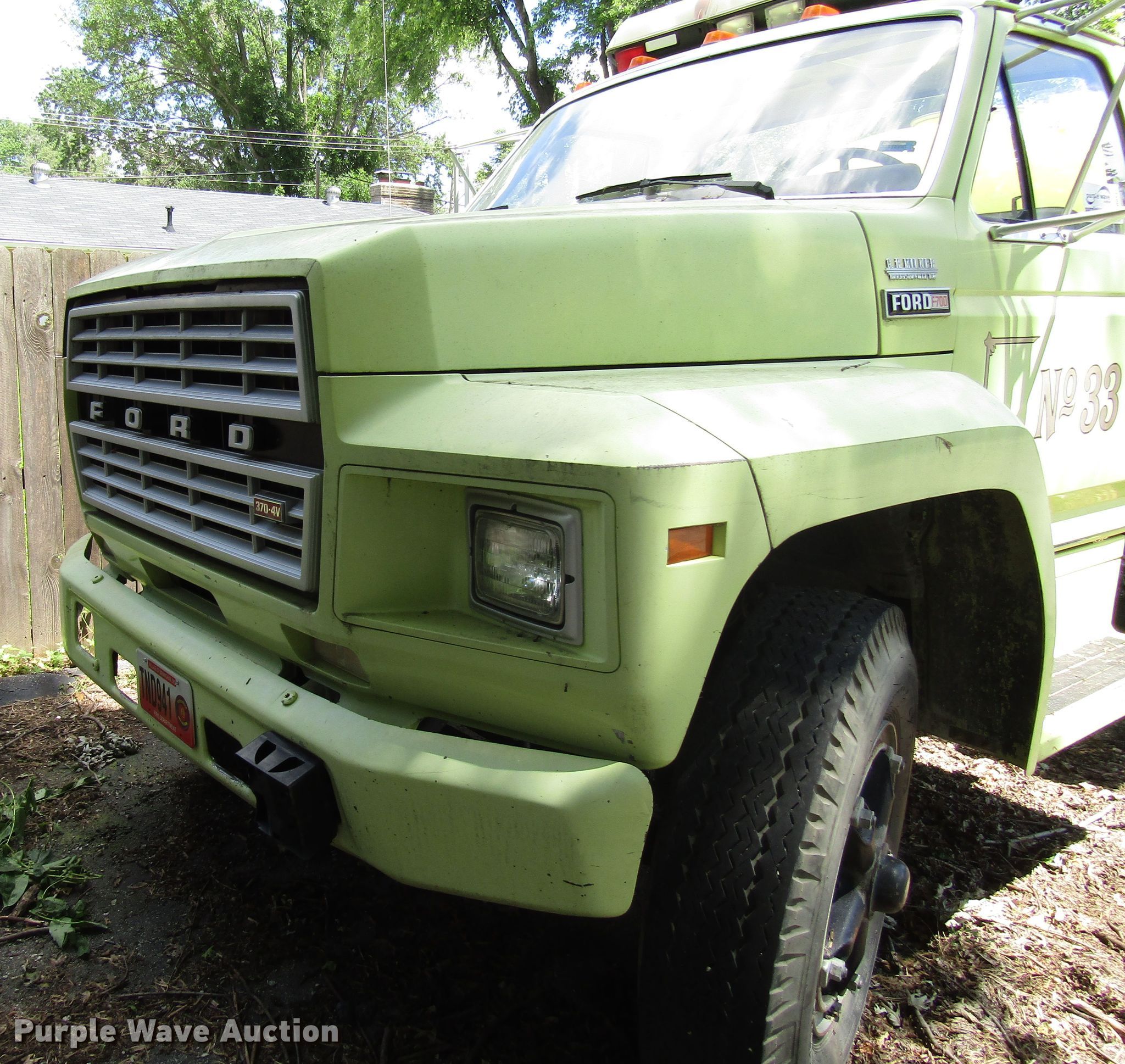 1981 Ford F700 tank truck. 27,324 miles on odometer, 6.1L V8 gas engine, 10 speed manual transmission, Single axle, Heat, 12'L tank bed 3" rear outlet, 8" rear outlet, Spring suspension, Hydraulic brakes, 180" wheelbase, 10.00-20 tires, Radios and fire equipment not included. Missouri title. 1FDPF70H4BVJ44337. Birmingham, MO 64161