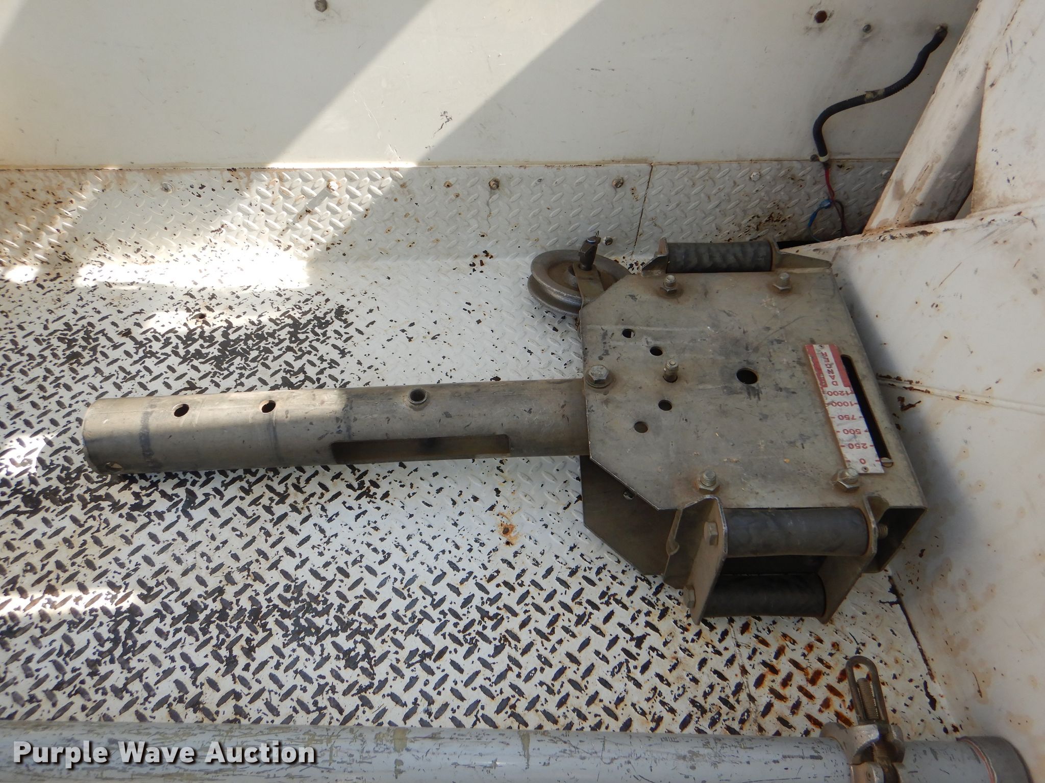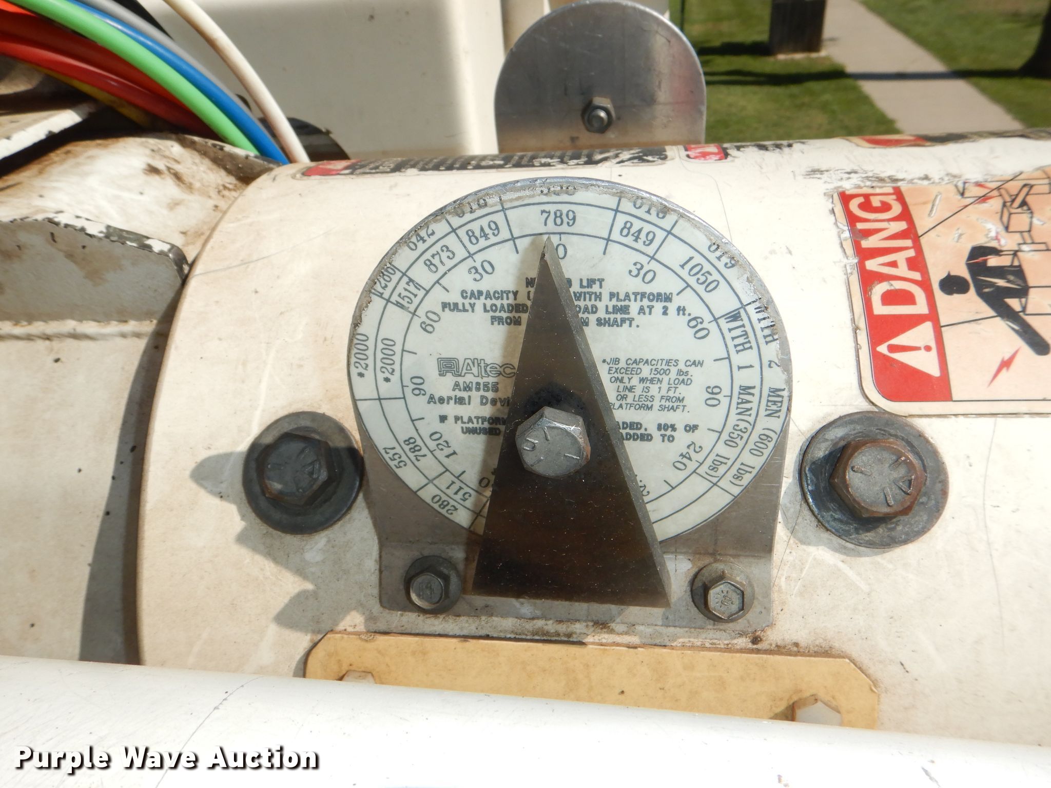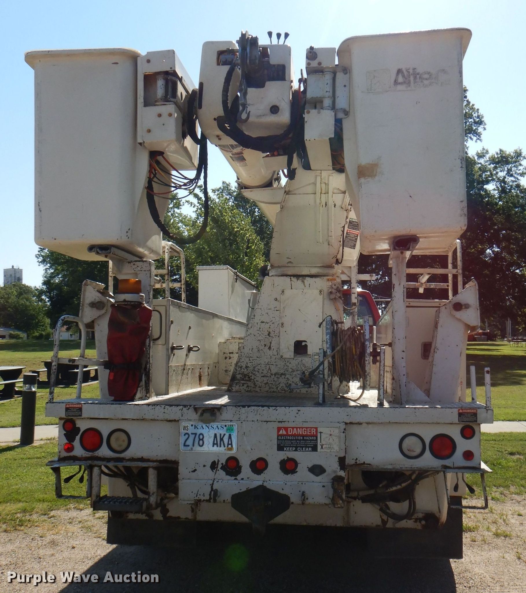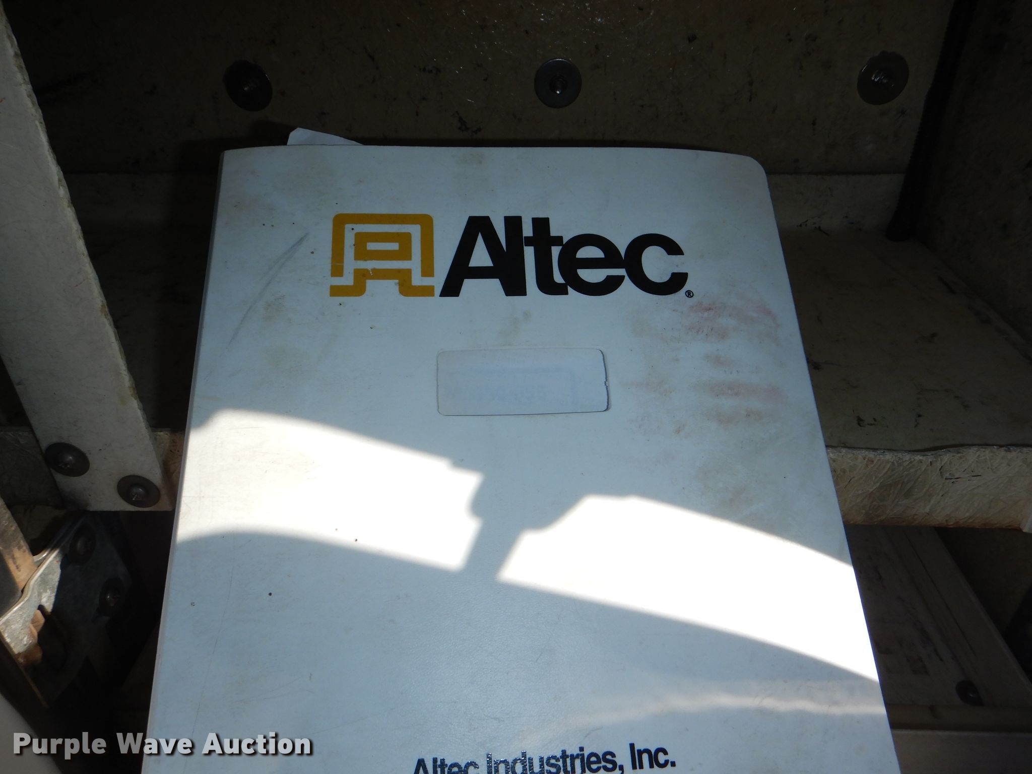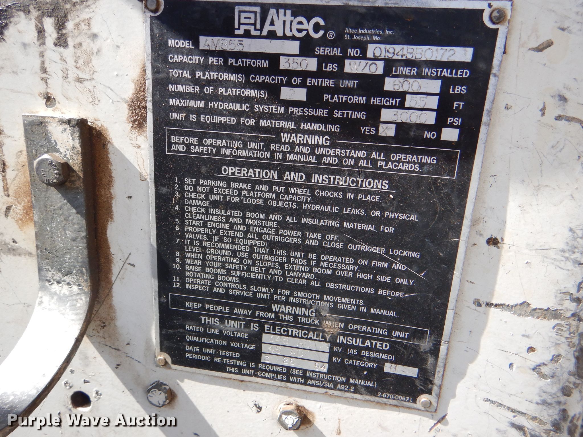 Purple Wave is selling a used Bucket Truck in Kansas. This item is a 1994 Chevrolet Kodiak C6500 bucket truck with the following: 168,866 miles on odometer, 13,674 hours on meter, 7,895 PTO hours on meter, Caterpillar 3116 6.6L L6 diesel engine, Five speed manual transmission, Single axle, AC and heat, PTO, Altec 14'L utility bed, Serial 37-64228, 1994 Altec AM855 insulated boom, 600 lbs maximum lift capacity, 55' maximum lift height, (2) man baskets, Individual rotation, Ground and platform controls, Material handler, Three phase tree, Spring suspension, Hydraulic brakes, 193" wheelbase, Goodyear 10R20 tires, GVWR 33,000 lbs, Inspection report completed January 2019, Manuals