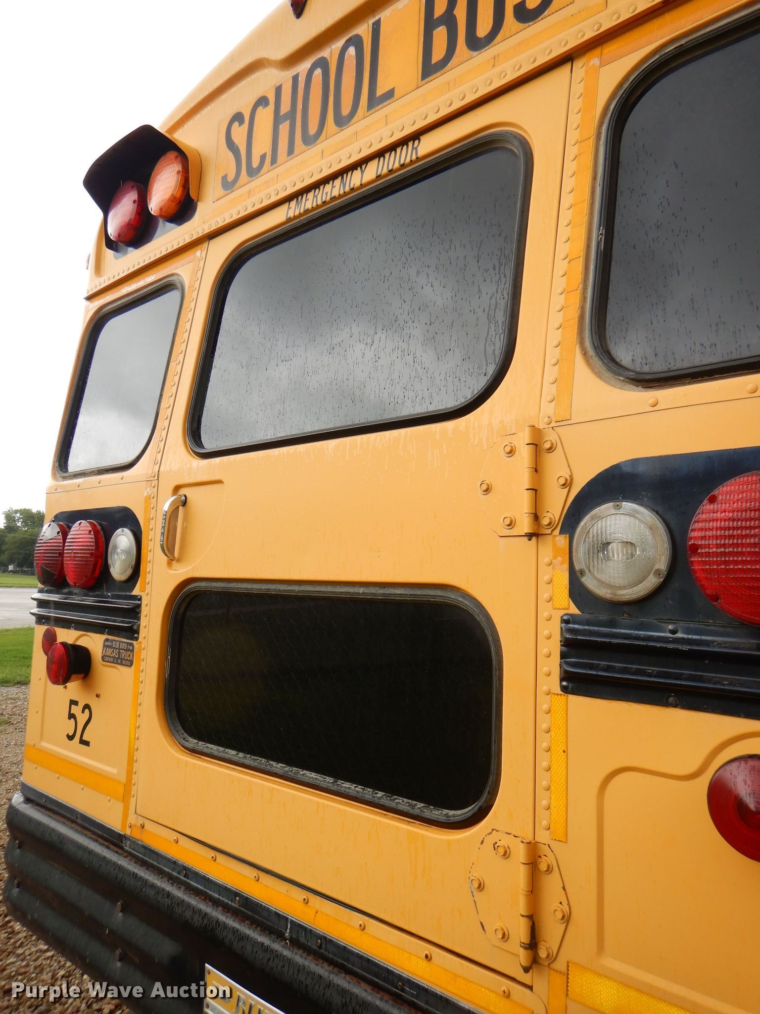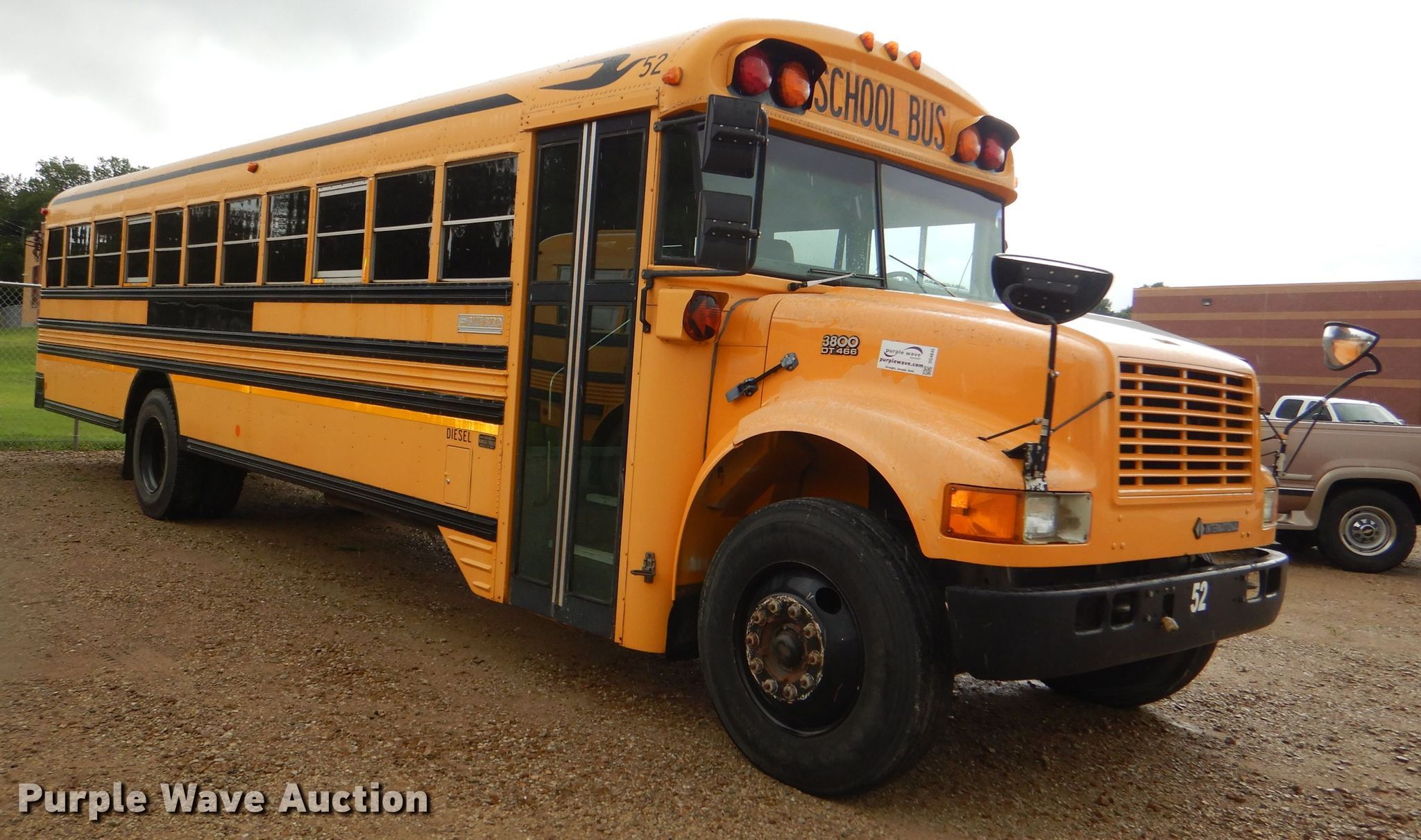 Purple Wave is selling a used Bus in Kansas. This item is a 1996 International 3800 Blue Bird school bus with the following: 184,619 miles on odometer, International DT466 7.6L L6 diesel engine, Automatic transmission, Single axle, Heat, 65 passenger capacity, Spring suspension, Hydraulic brakes, 255" wheelbase, Firestone 10R22.5 tires, GVWR 27,500, Unit# 52