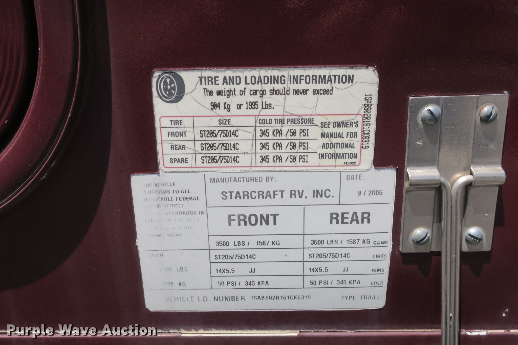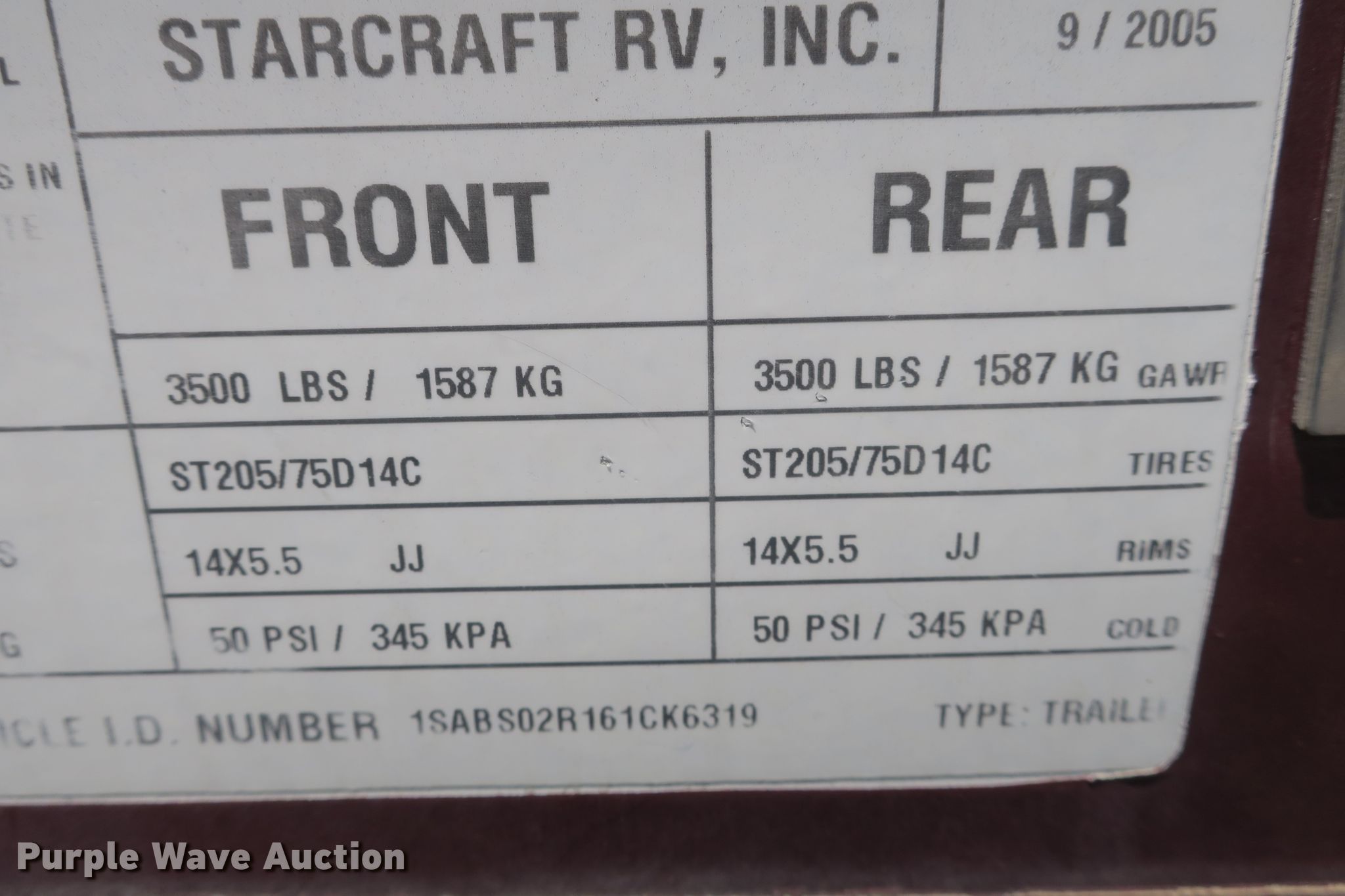 Purple Wave is selling a used RV in Missouri. This item is a Starcraft camper with the following: 28'L x 97"W, Kitchen, Refrigerator/freezer, 50"W x 32"D grill, AC unit, 2 5/16" ball hitch, Tandem axle, Spring suspension, Electric brakes, ST205/75R14 tires, GVWR 7,000 lbs, Roof damage, Water leak, Floor damage, Possible damage over rear axles
