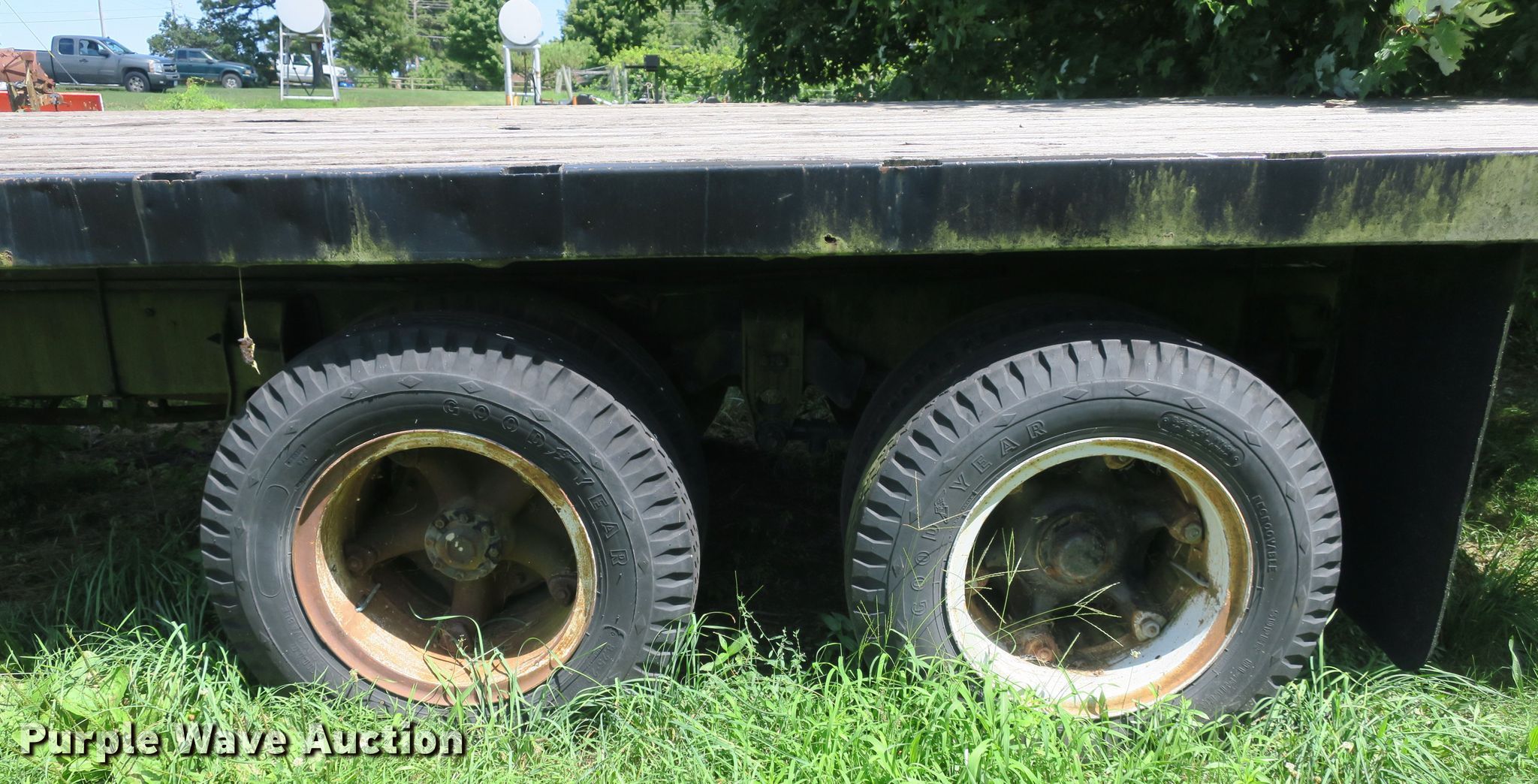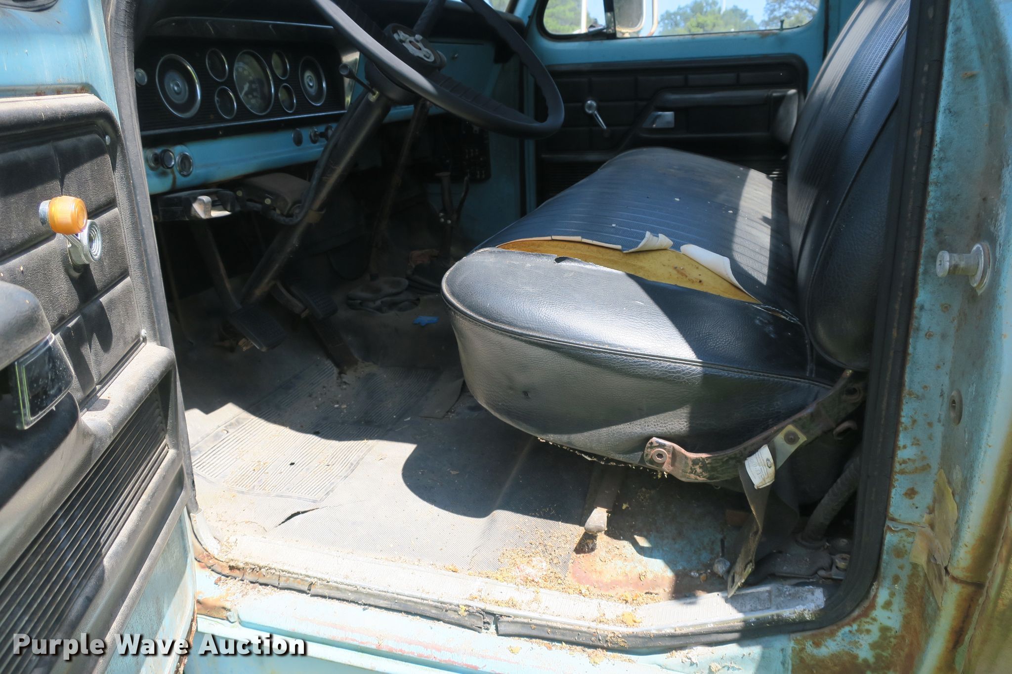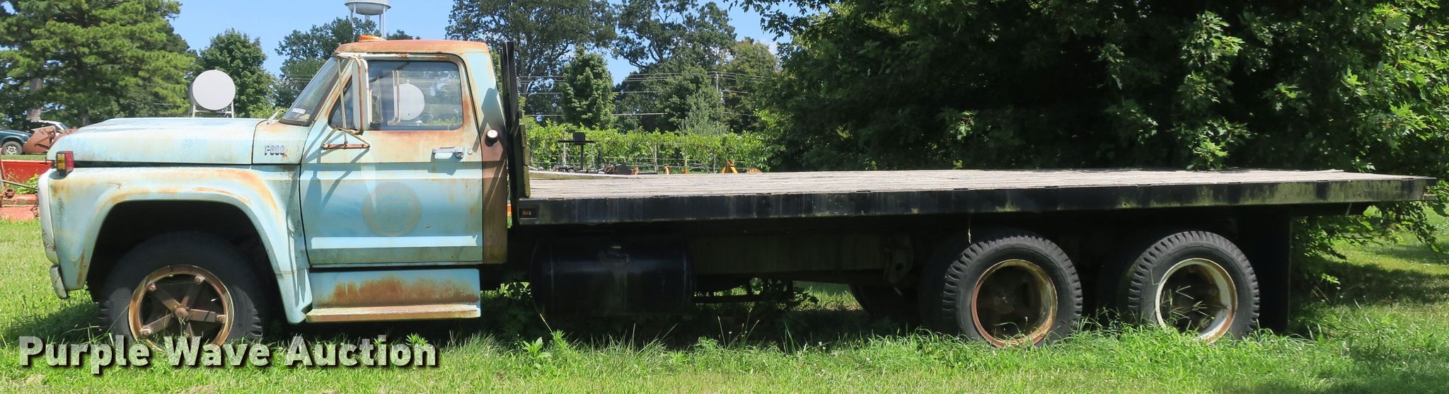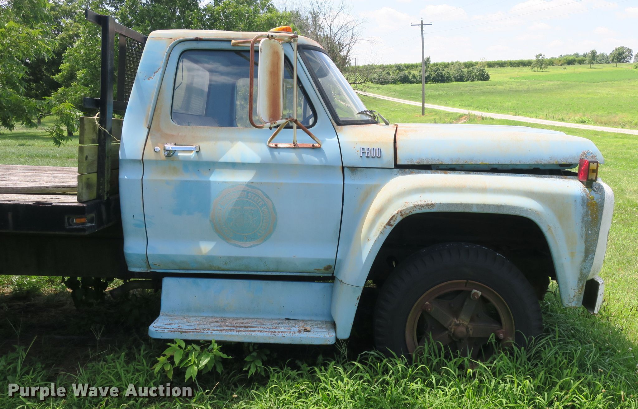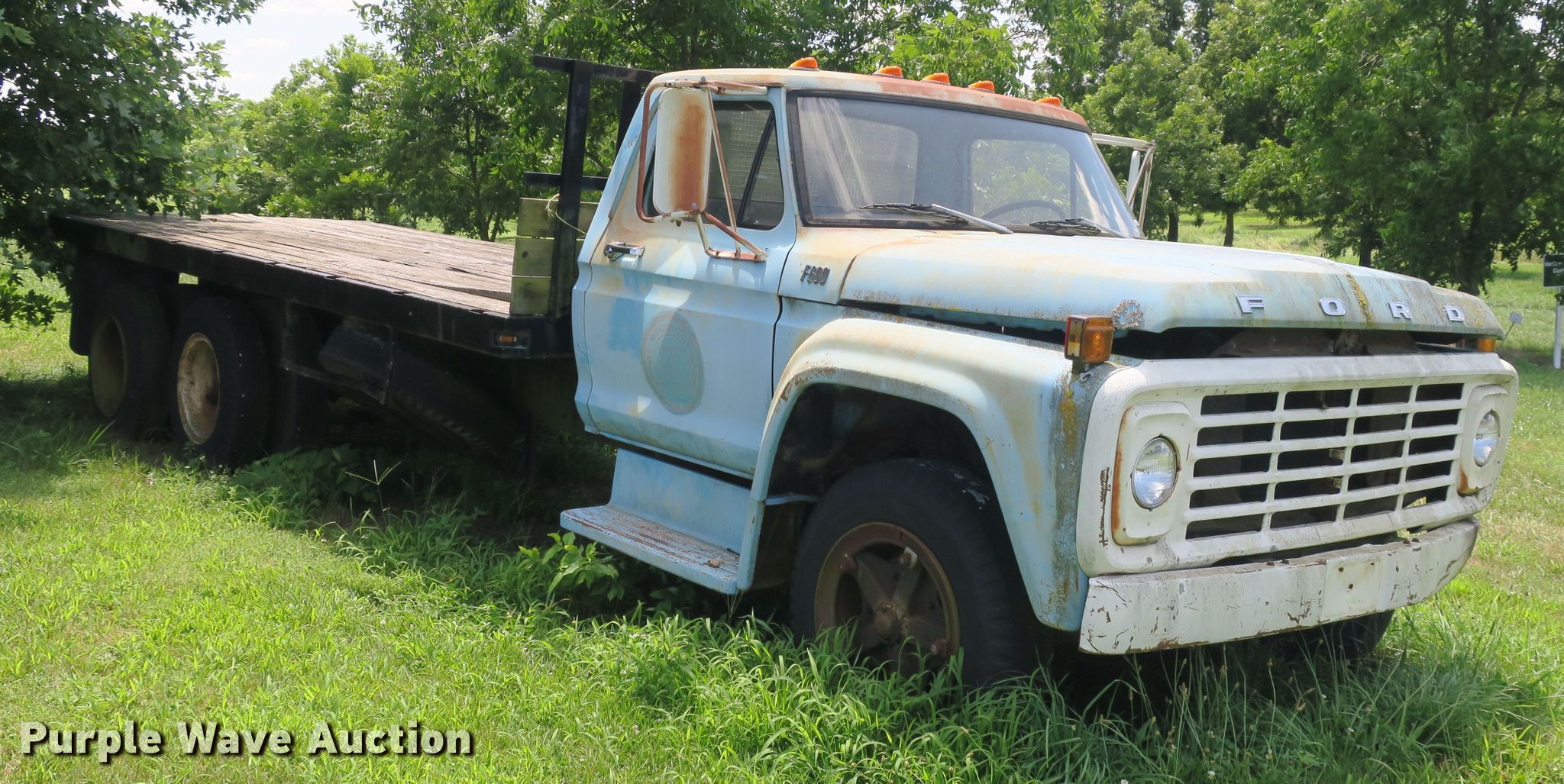 Purple Wave is selling a used Flat Bed Truck in Missouri. This item is a 1973 Ford F600 flatbed with the following: 31,520 miles on odometer, Eight cylinder gas engine, Eight speed manual transmission, TAndem axle, Heat, 20'L x 94"W flatbed, Spring suspension, Hydraulic brakes, 8.25-20 tires, Unknown operating condition, No battery, Possible fuel issues, Possible starter issues, Rodent infestation, Vehicle must be towed or hauled, Tire flat