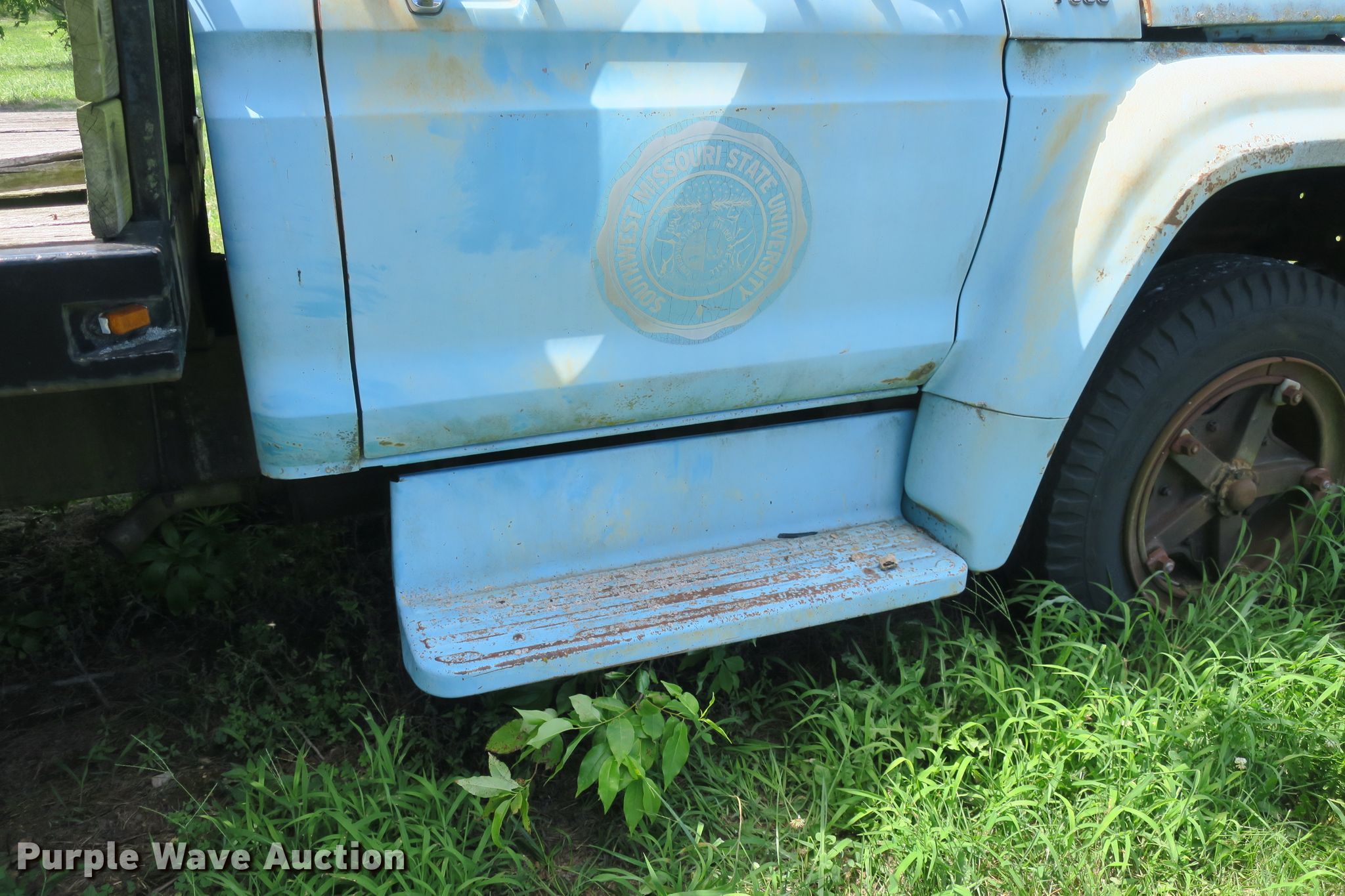 1973 Ford F600 flatbed. 31,520 miles on odometer, Eight cylinder gas engine, Eight speed manual transmission, TAndem axle, Heat, 20'L x 94"W flatbed, Spring suspension, Hydraulic brakes, 8.25-20 tires, Unknown operating condition No battery, Possible fuel issues, Possible starter issues, Rodent infestation, Vehicle must be towed or hauled, Tire flat. Missouri title. F60DCR84752. Missouri State University. 9740 Red Spring Rd. Mountain Grove, MO 65711