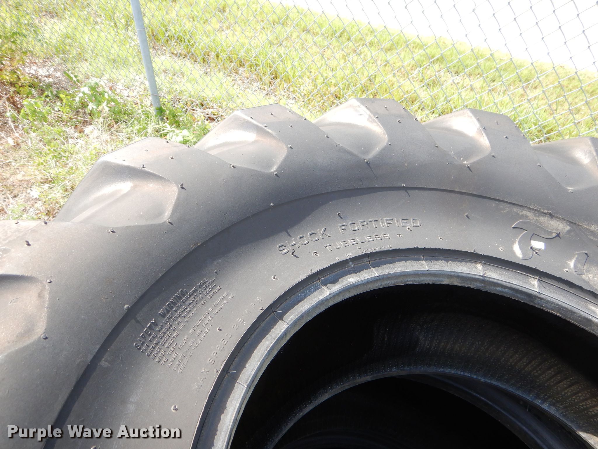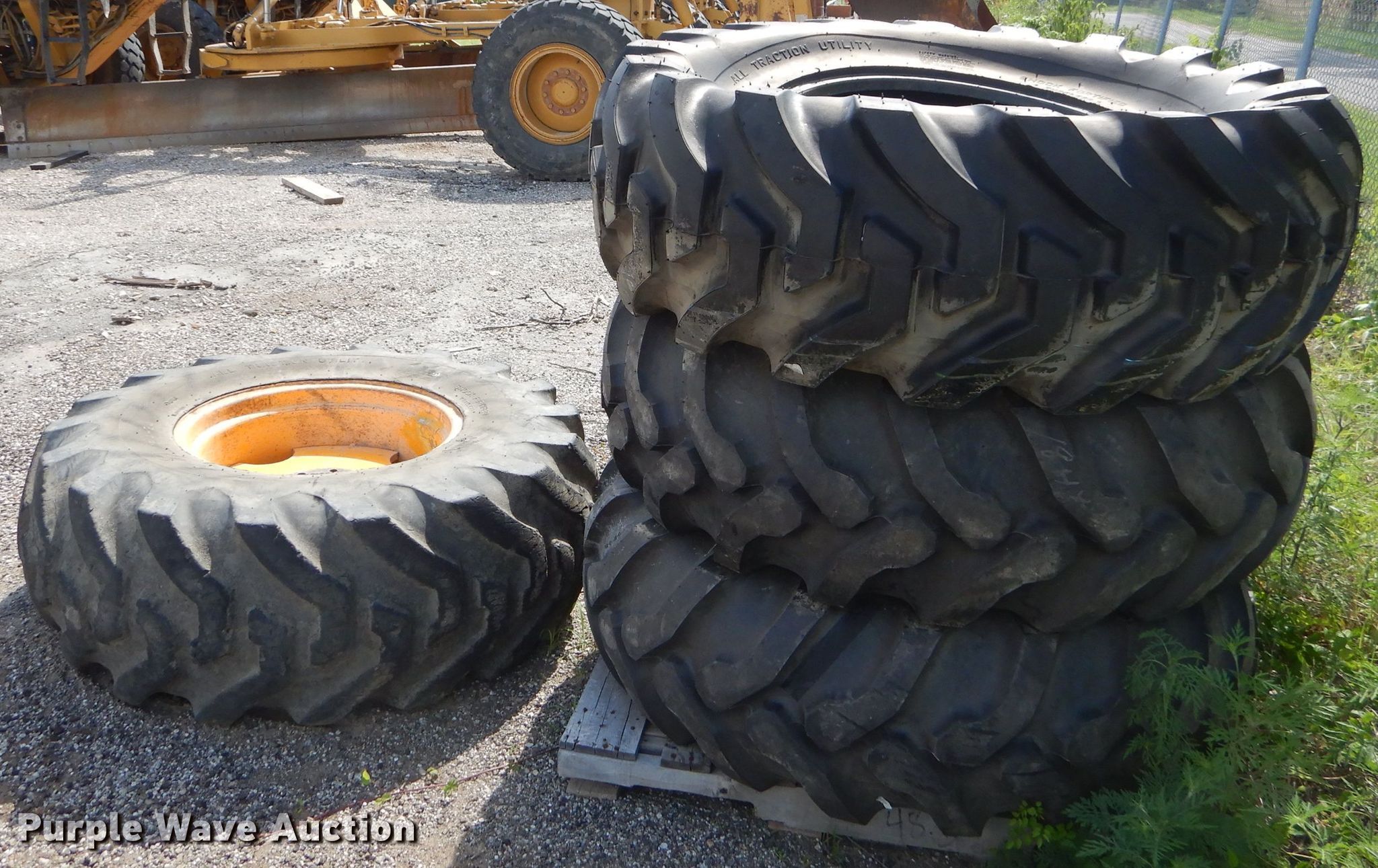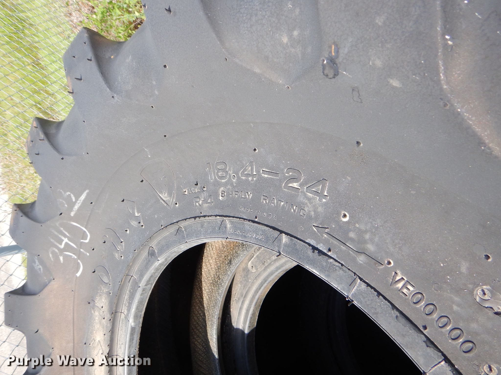 Purple Wave is selling a used Industrial Tires or Tracks in Kansas. This item is a (4) Firestone All Traction Utility 18.4-24 tires with the following: Eight lug wheel