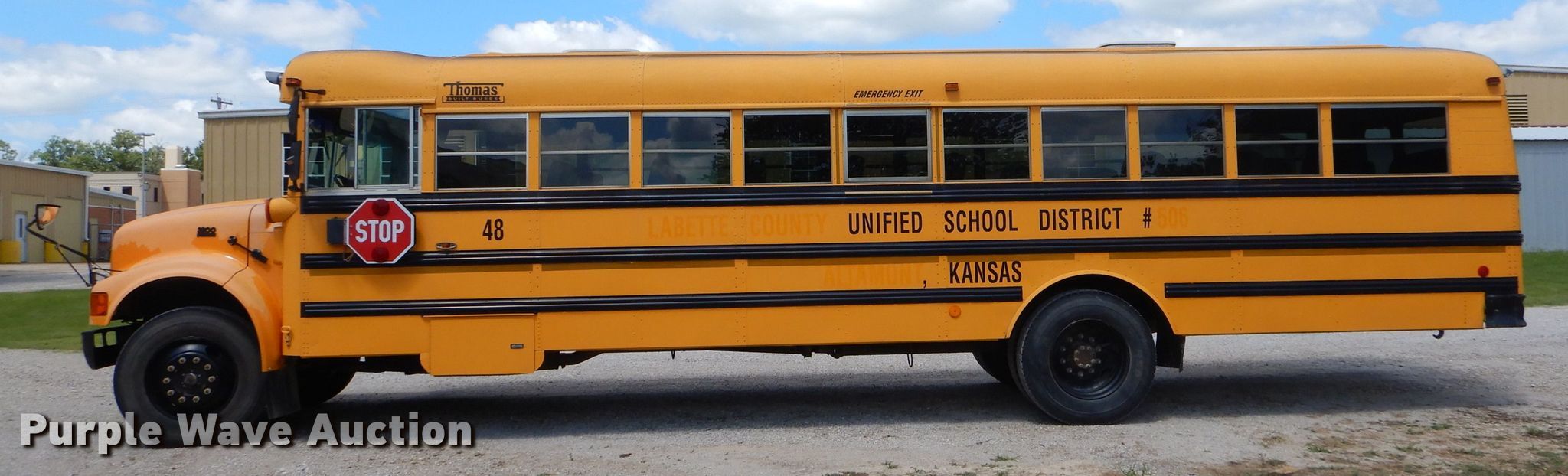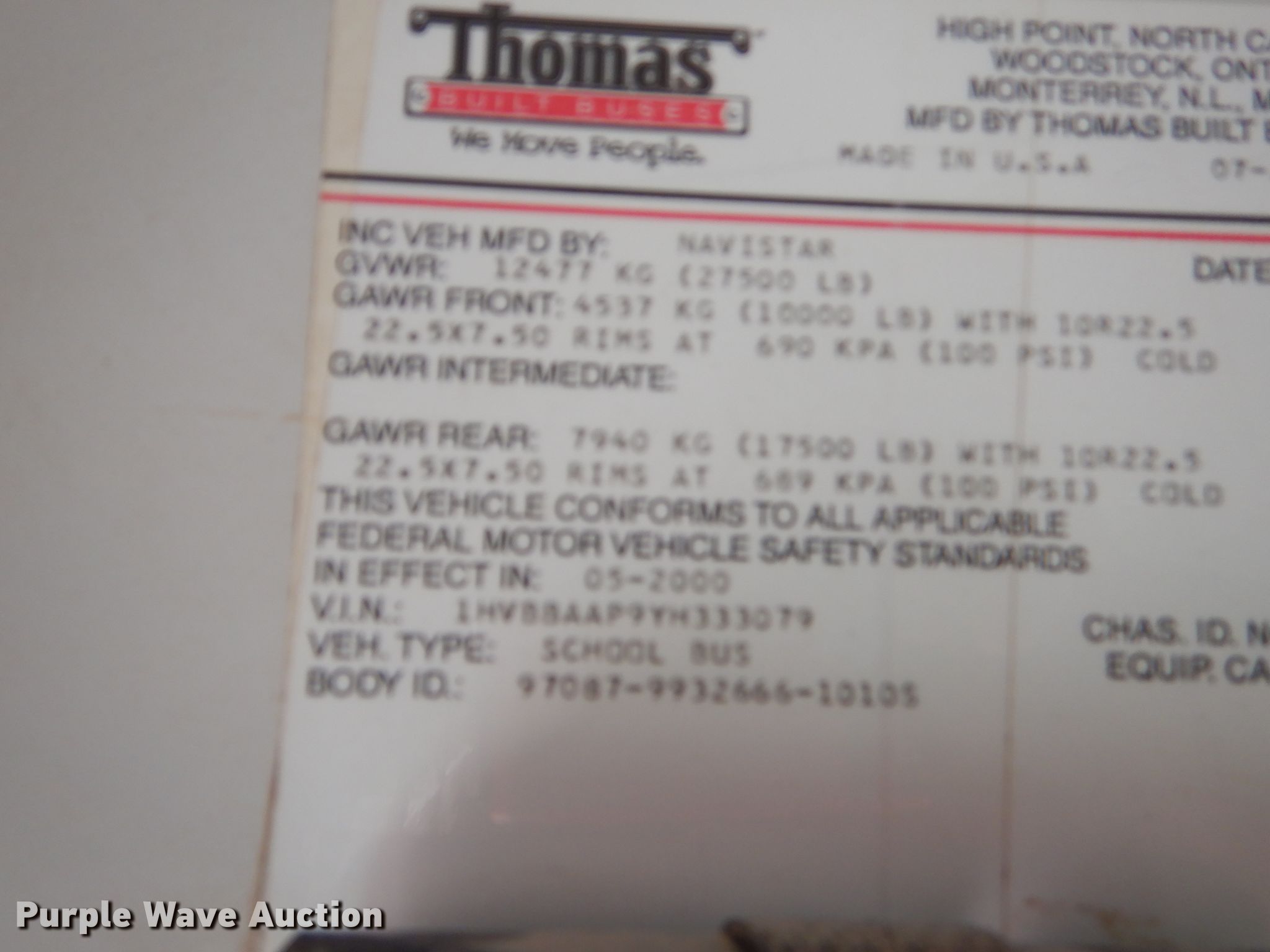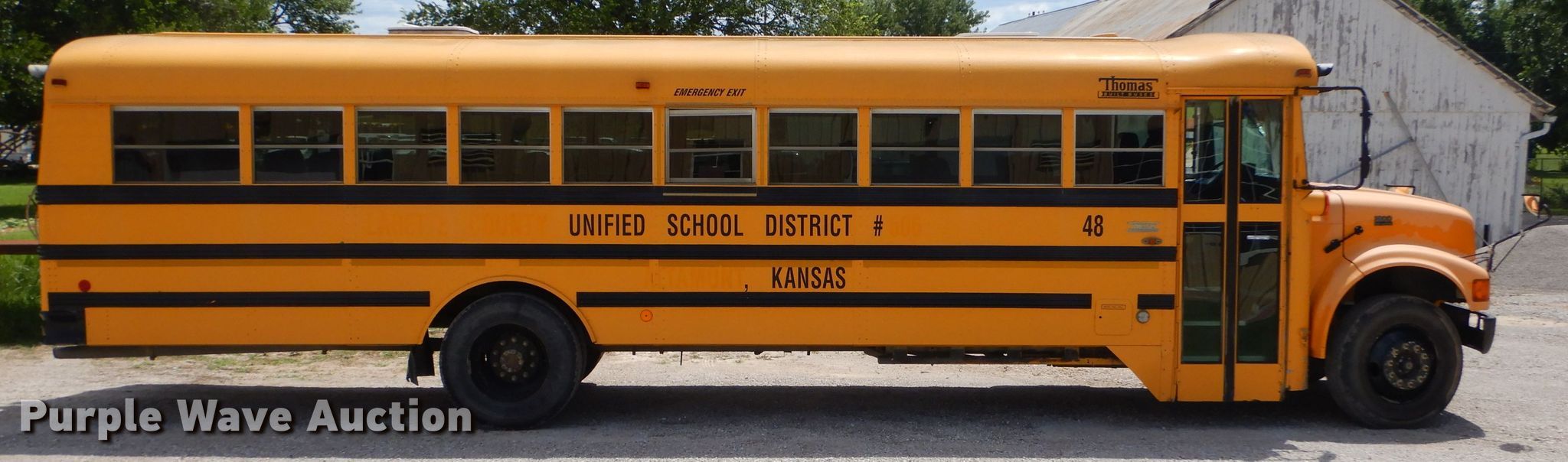 Purple Wave is selling a used Bus in Kansas. This item is a 2000 International 3800 Thomas school bus with the following: 185,638 miles on odometer, 7,222 hours on meter, International DT466 7.6L L6 diesel engine, Automatic transmission, Single axle, Heat, Heated mirrors, 60 passenger capacity, Spring suspension, Hydraulic brakes, 260" wheelbase, 10R22.5 tires, GVWR 27,500 lbs, Chipped windshield
