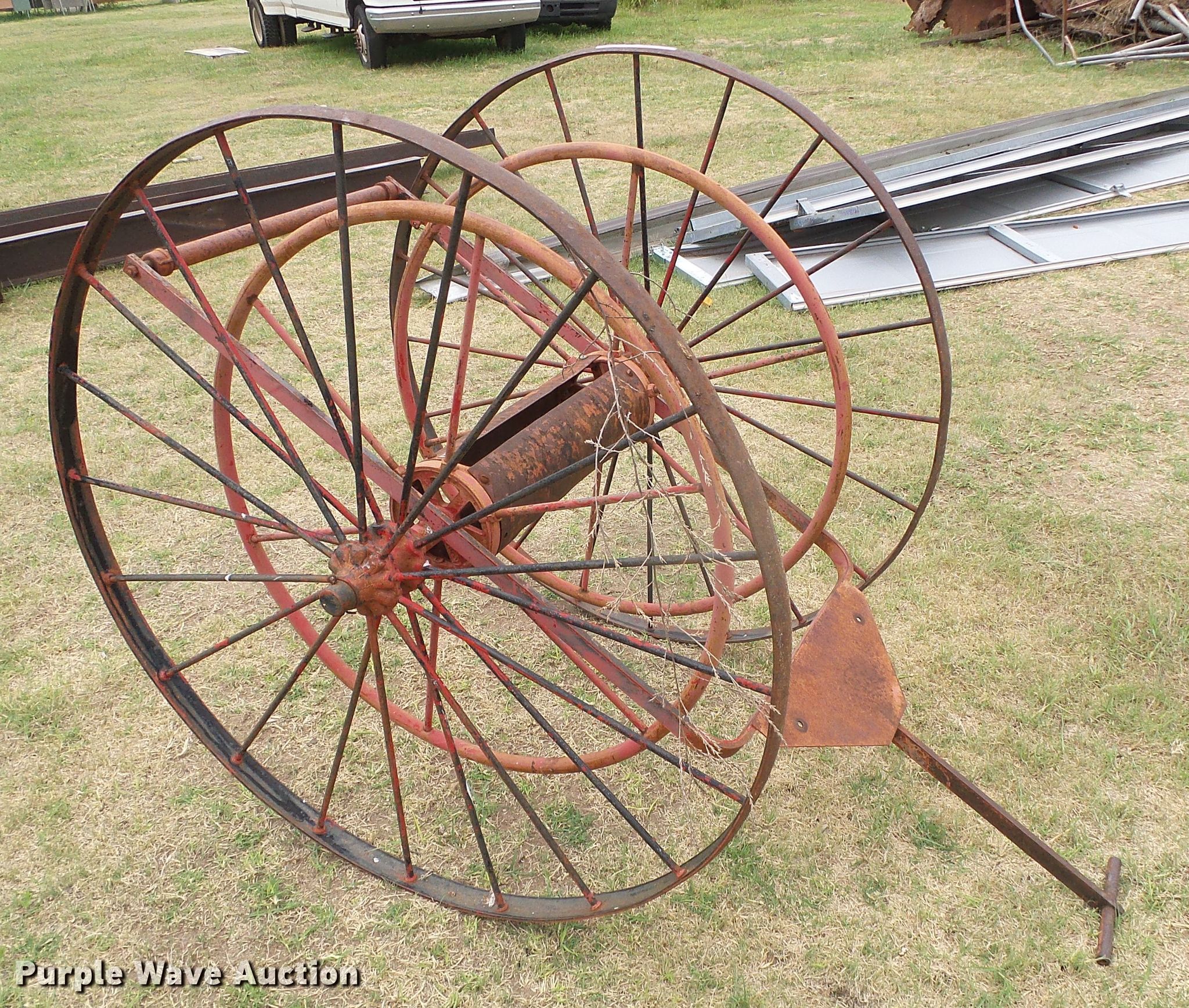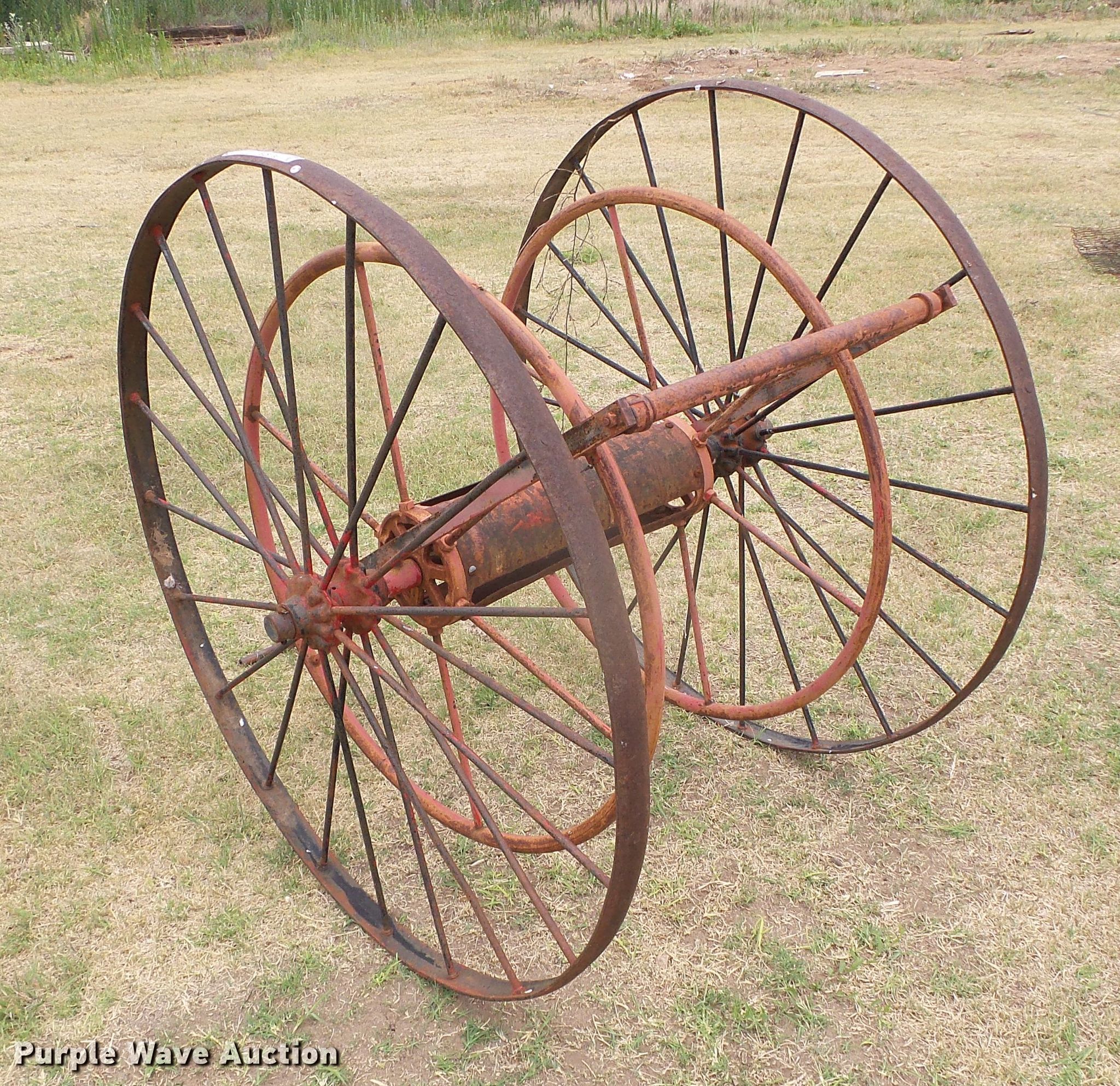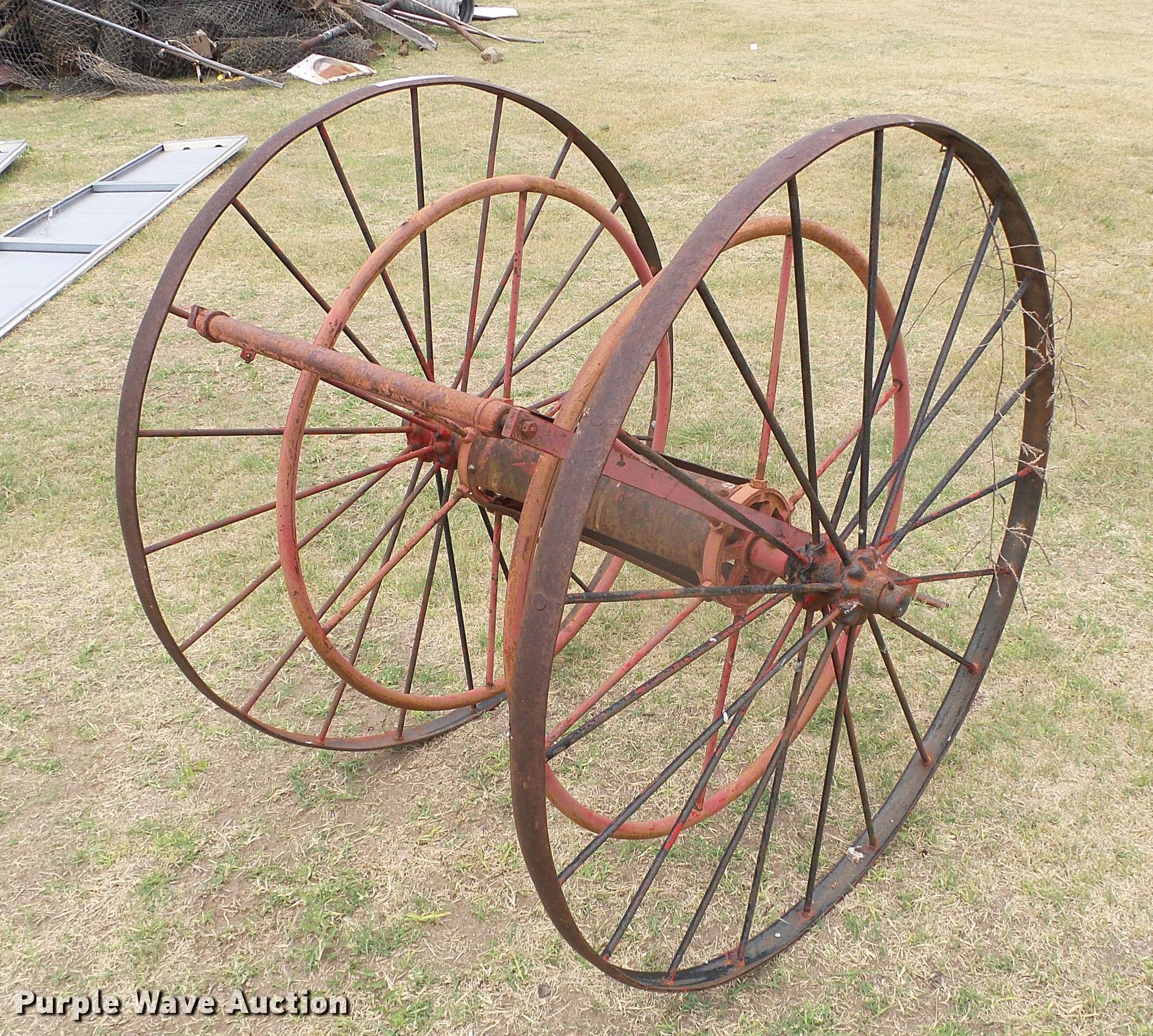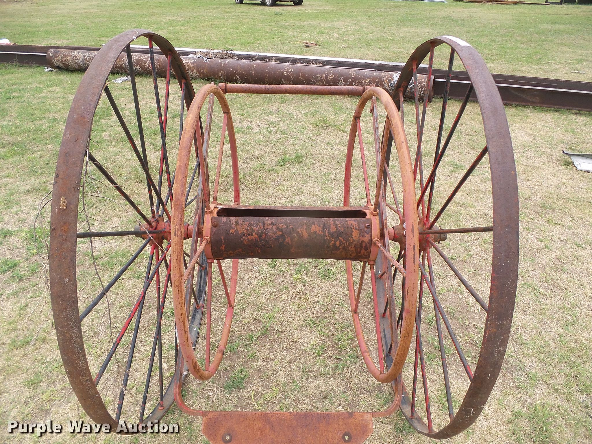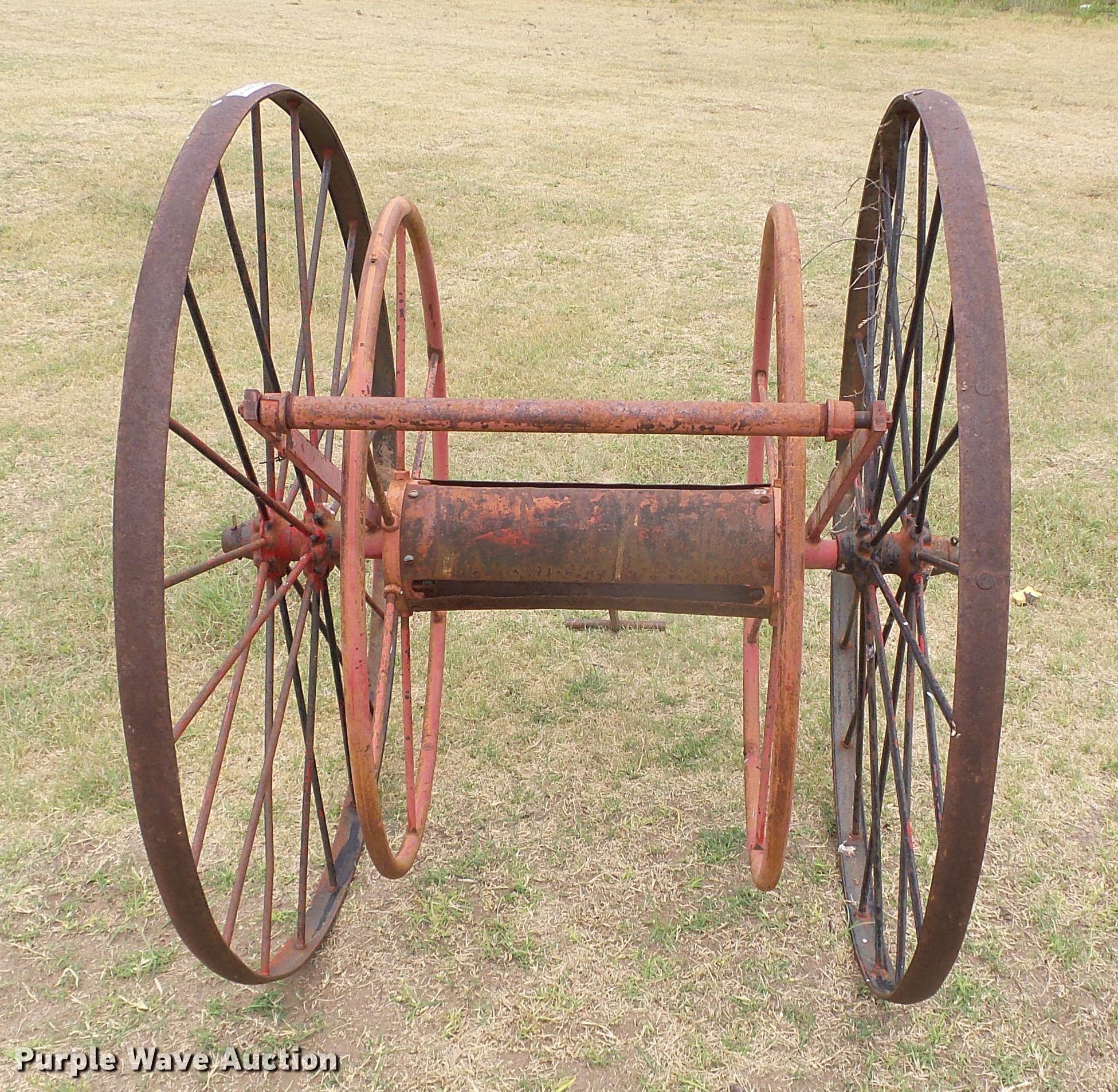 Purple Wave is selling a used Hose Reel in Oklahoma. This item is a Hose reel with the following: 20" reel base, Manual crank, Pull handle, Steel wheels