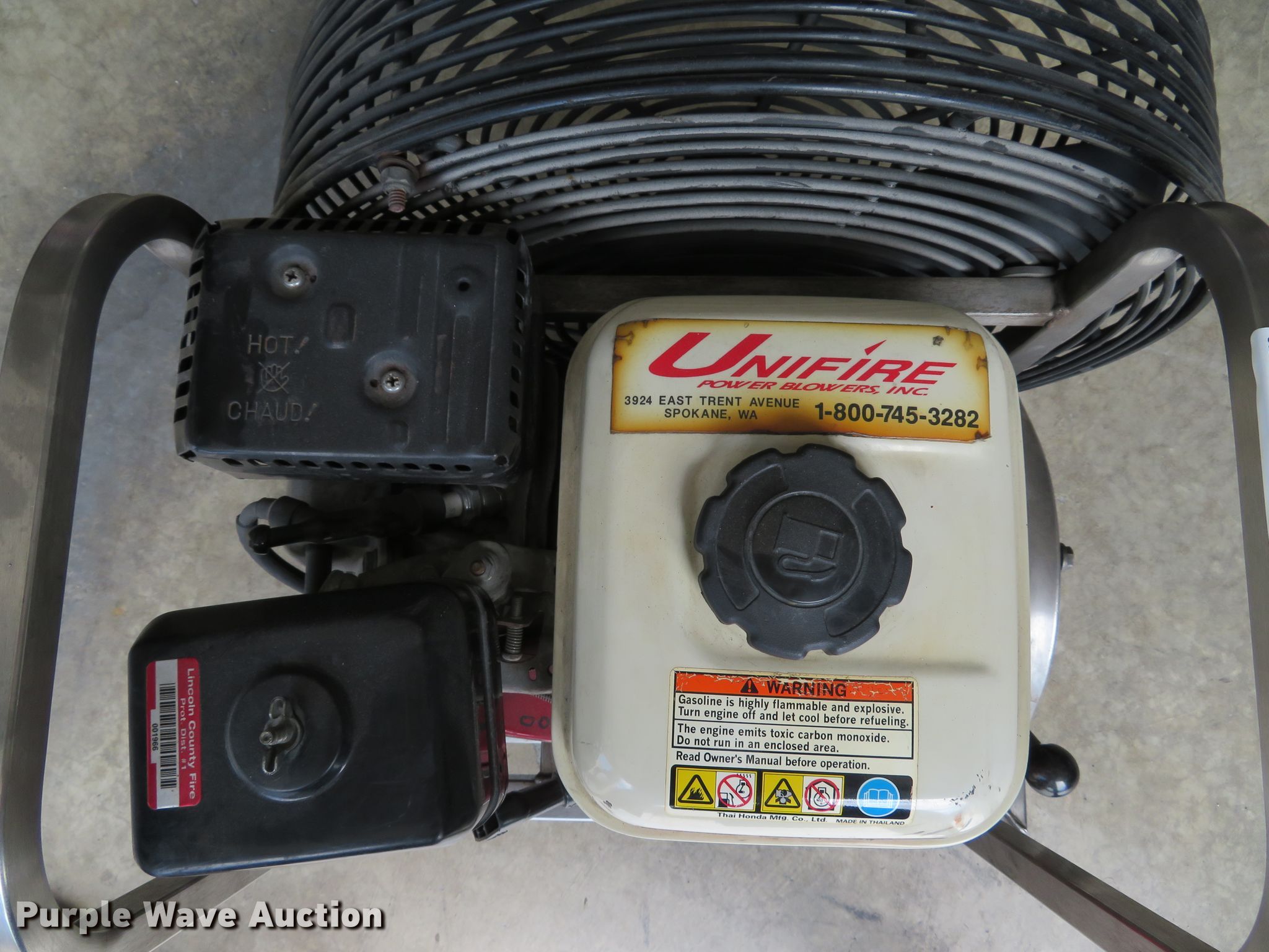 Purple Wave is selling a used Portable Heater or Fan in Missouri. This item is a UniFire DS-3P4 positive pressure ventilation fan with the following: Honda GX120 single cylinder gas engine, 5.5 HP, Approx. 1,400 cfm, 18" diameter