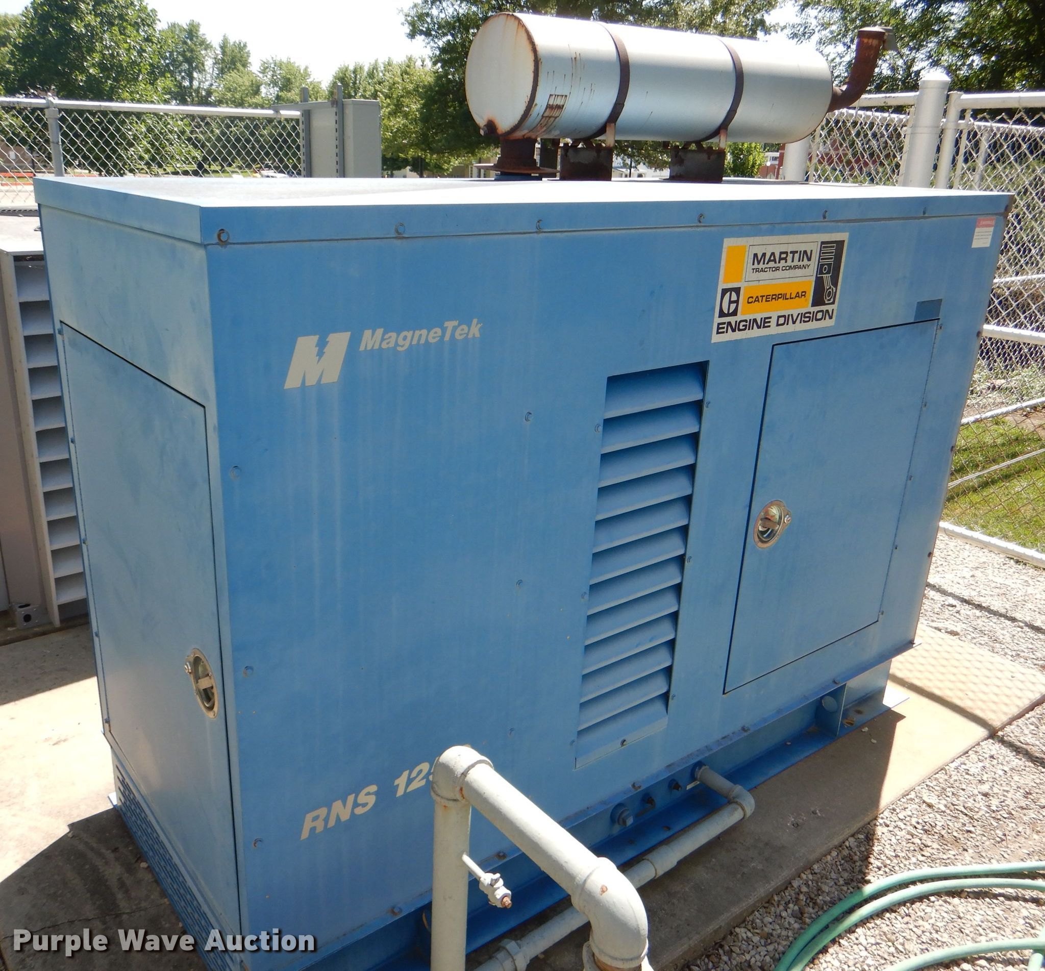 Purple Wave is selling a used Generator Set in Kansas. This item is a Magnetek Century generator with the following: Model RNS1250, Approx. 1,615 total hours, Ford eight cylinder natural gas engine, 110 kW, 125 kVA, 208/240/480V, Three phase, 120/240V, Single phase, 347/301/150 amps, Electric motor, Model LSG-8751-60007-7, Serial 10456K-13-RA, Non-operational control panel sensor, Unit will only run for a short period of time, Serial BP07B003