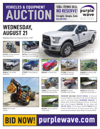 Payments must be made by 4 p.m. CDT on the second business day following the auction. Failure to make payment or payment arrangements by the deadline will result in a $30 late payment fee. Purple Wave reserves the right to charge the credit card on file the total purchase price and a $30 late payment fee will be added for invoices not paid within our terms. Payment should be made to Purple Wave, Inc.