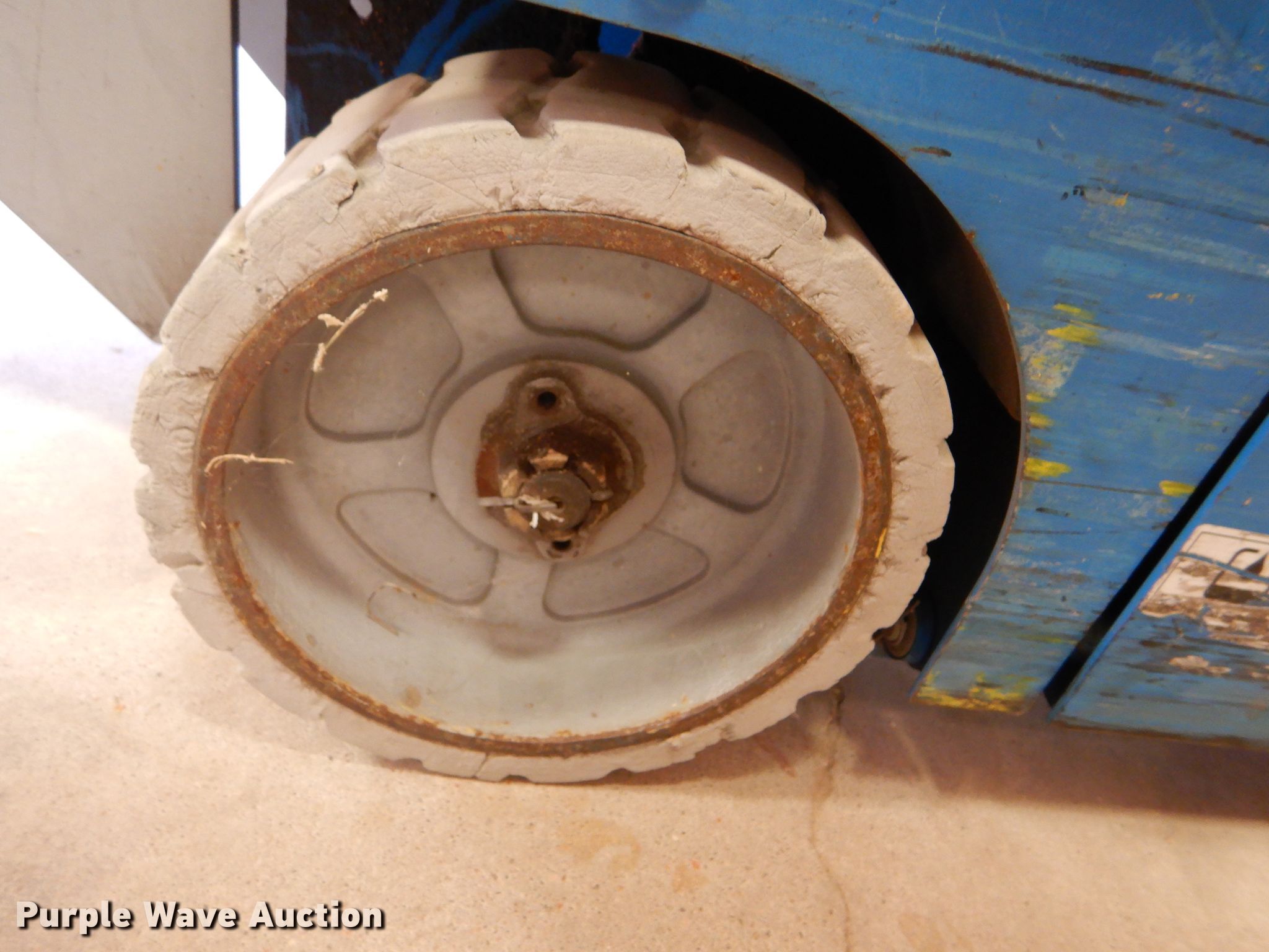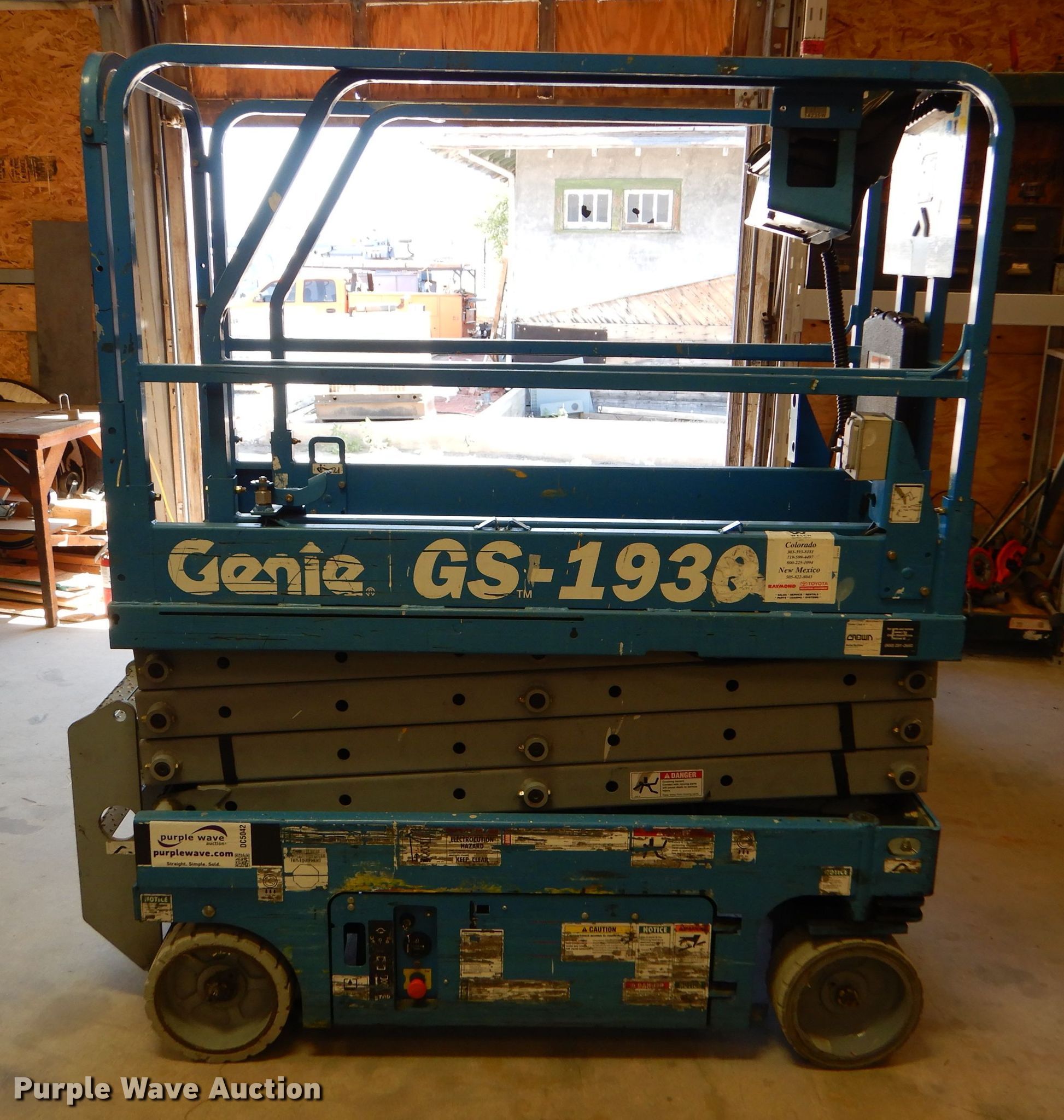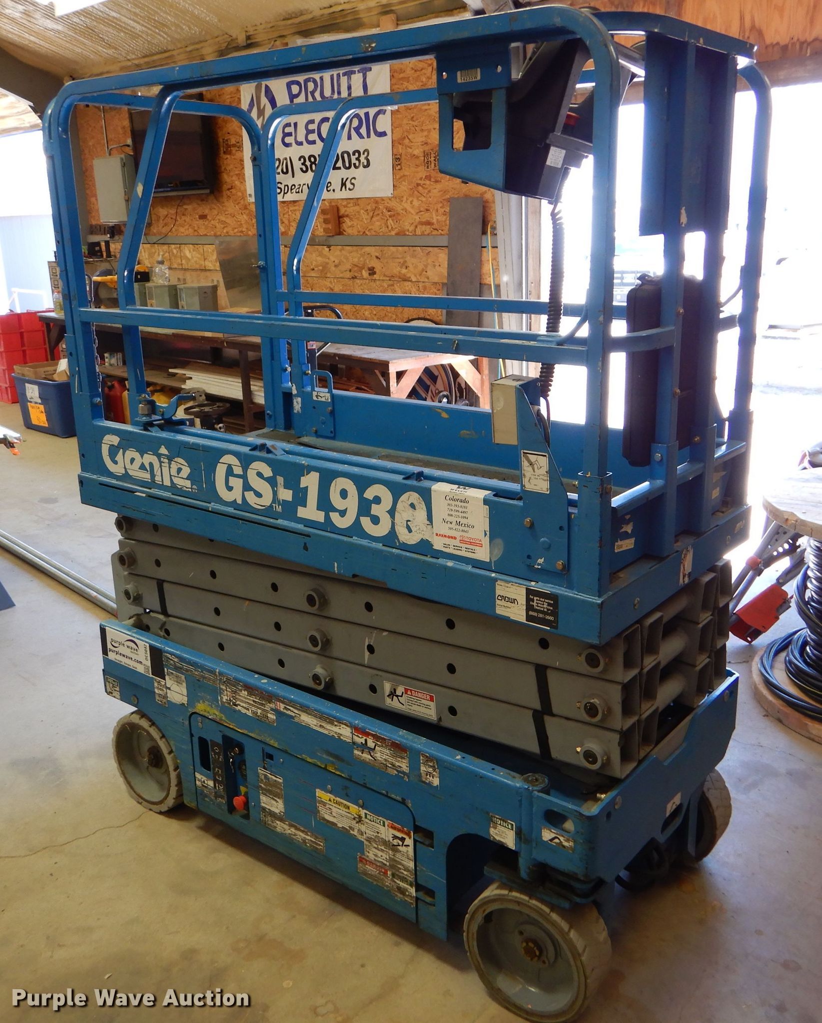 Purple Wave is selling a used Scissor or Vertical Lift in Kansas. This item is a 2003 Genie GS-1930 scissor lift with the following: 1,287 hours on meter, Electric motor, 500 lbs max lift capacity, 19' max lift height, 64"L x 30"W platform, AC power outlet, Platform controls, Manual platform extensions, 12x4 1/2x8 solid non-marking tires, Serial GS3003-62051