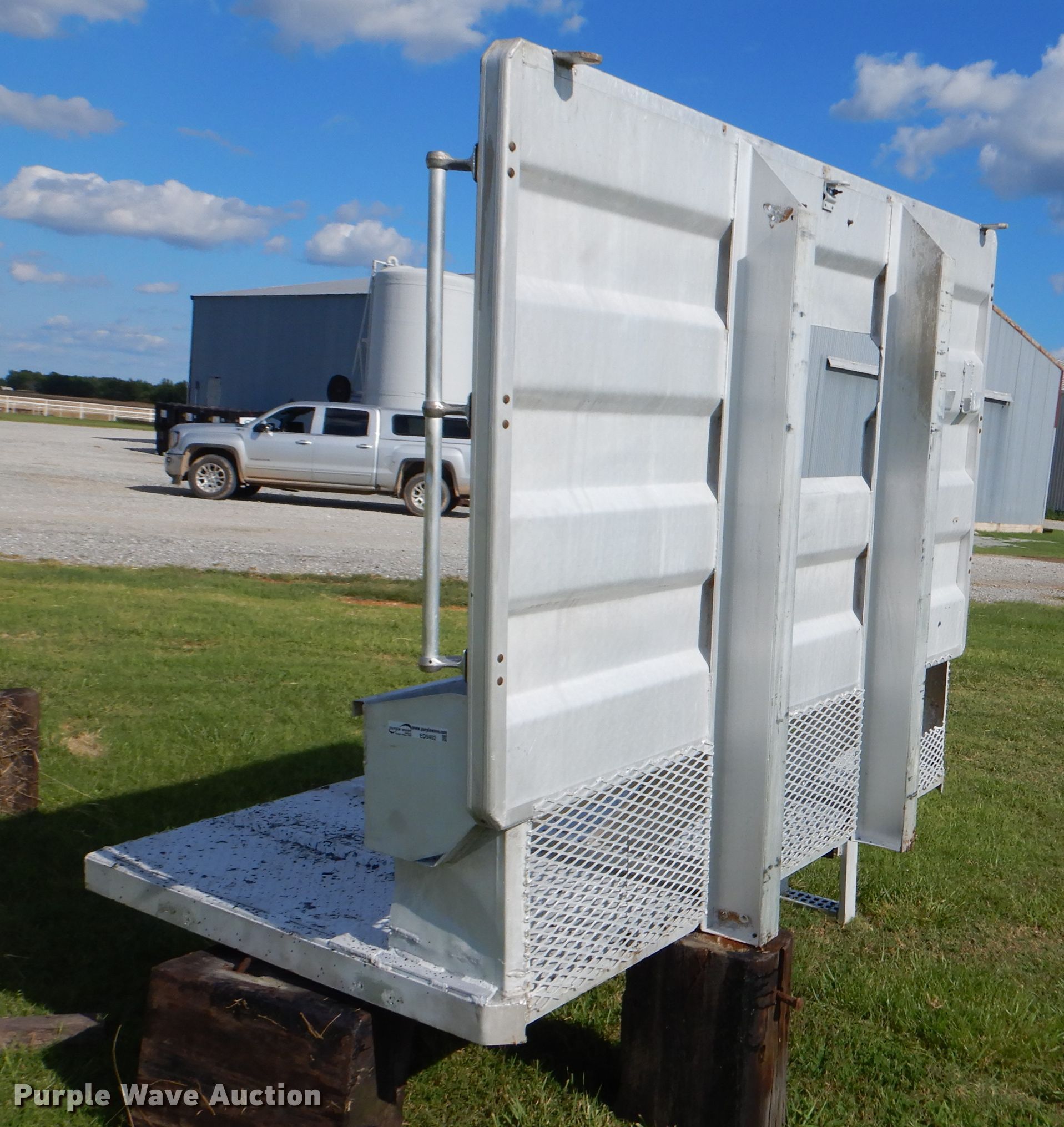 Purple Wave is selling a used Truck Part and Attach. in Oklahoma. This item is a Merritt aluminum headache rack with the following: 86" x 68", Chain hangers, Storage bin, Ladder access