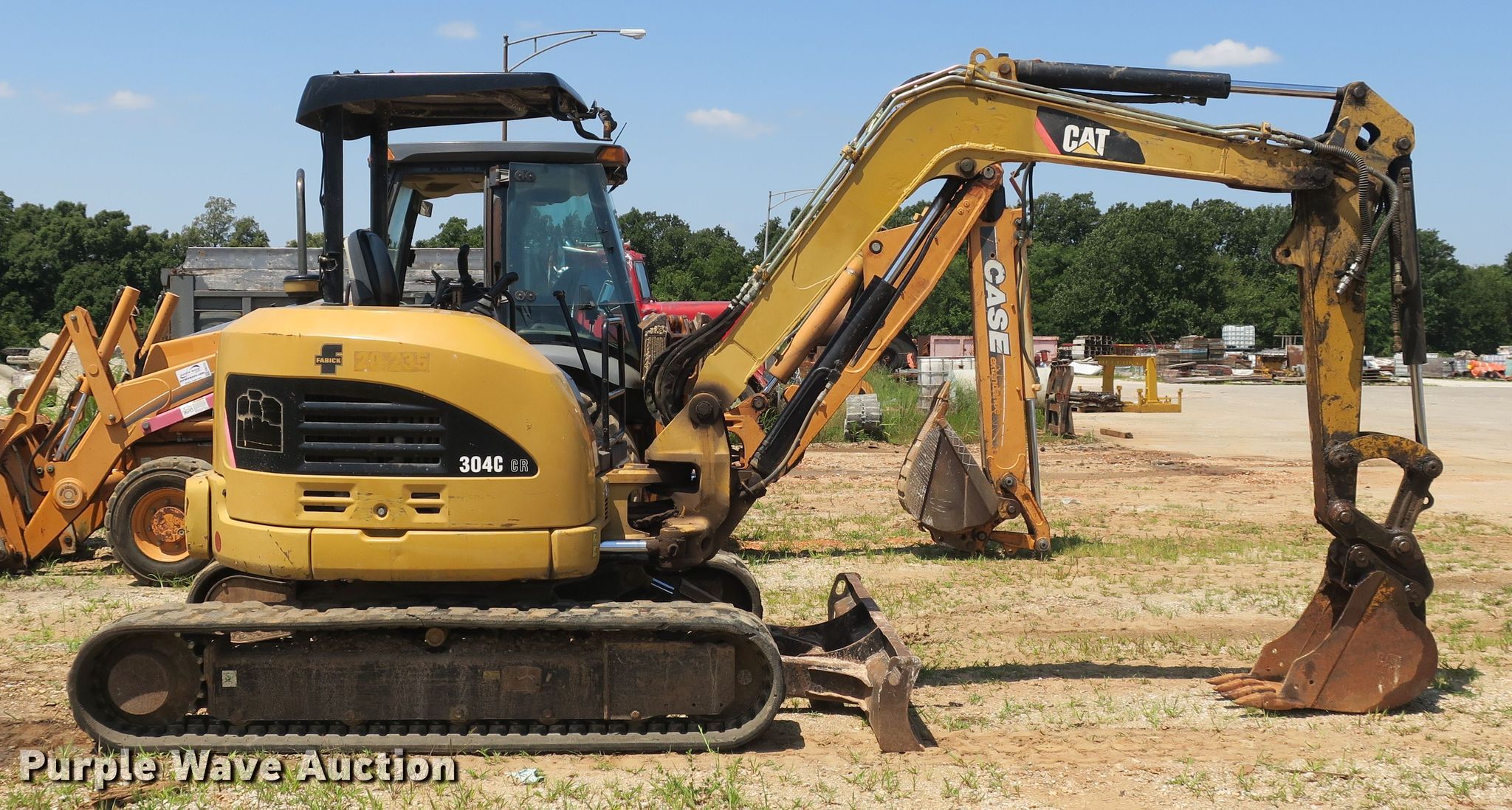 Purple Wave is selling a used Mini Excavator in Missouri. This item is a 2008 Caterpillar 304C CR mini excavator with the following: 225 hours on meter, Mitsubishi 54Q2 2.5L four cylinder diesel engine, 32.2 kW, Hydrostatic transmission, OROPS, Pattern changer, Standard boom, 54" stick length, Caterpillar 18"W bucket, Weld-on cutting edge, (4) bolt-on teeth, Mechanical quick coupler, Auxiliary hydraulics, 78"W backfill blade, 16"W rubber tracks, Auxiliary hydraulic leak, Serial CAT304CCFPK05784