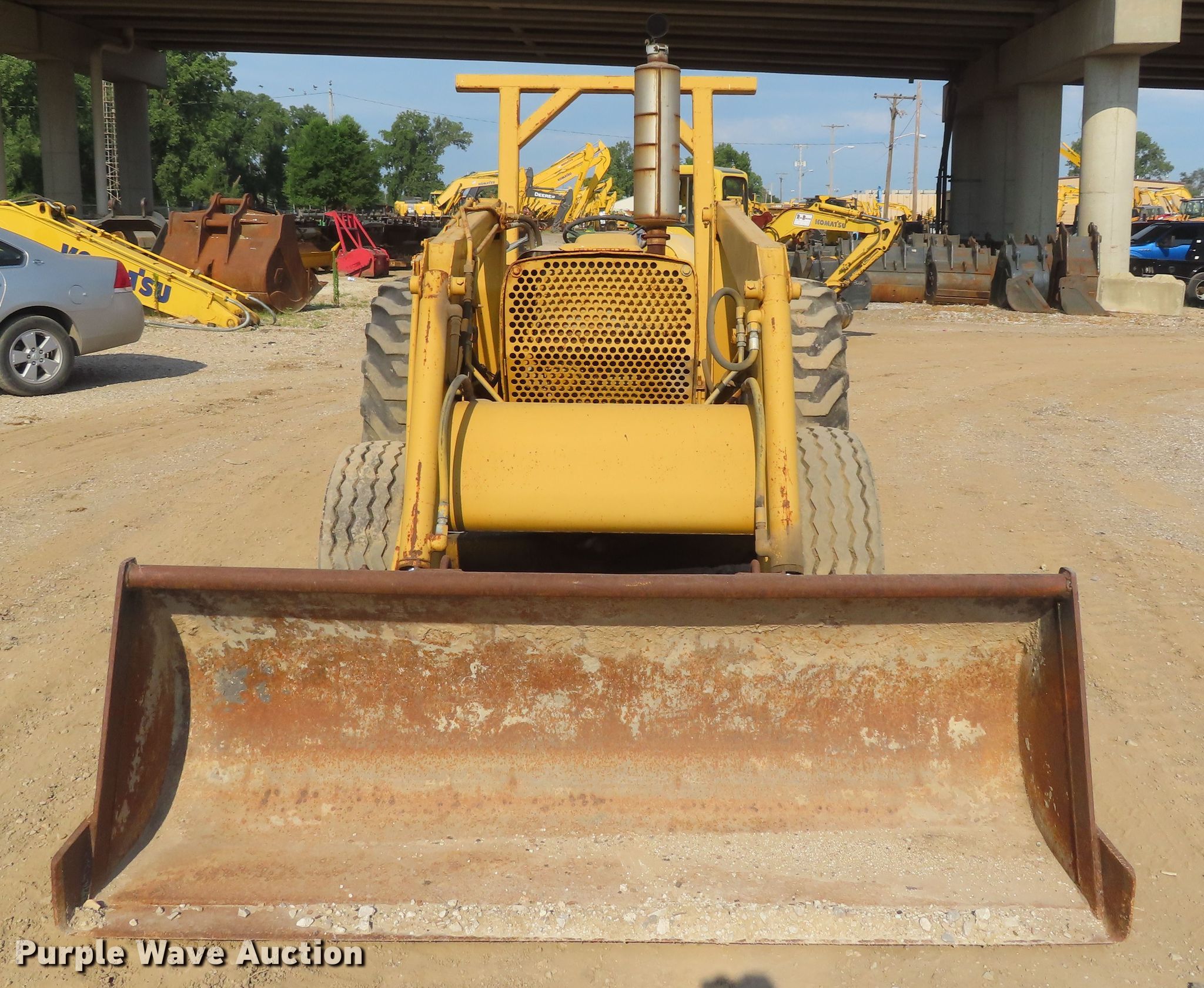 Ford 445 tractor. 2,190 hours on meter, Ford 3.0L three cylinder diesel engine, 4F-4R gears, Left-hand reverser, Ford 19-856 loader 84"W bucket, Joystick controls, Three point Top link, 80"W box blade (8) shanks, Hydraulic shank control, Three point, 11L-16 front tires, 17.5-24 rear tires, Dead battery, Coolant leak, Serial C714642. Road Builders Machinery. 1001 S 7th St. Kansas City, KS 66105