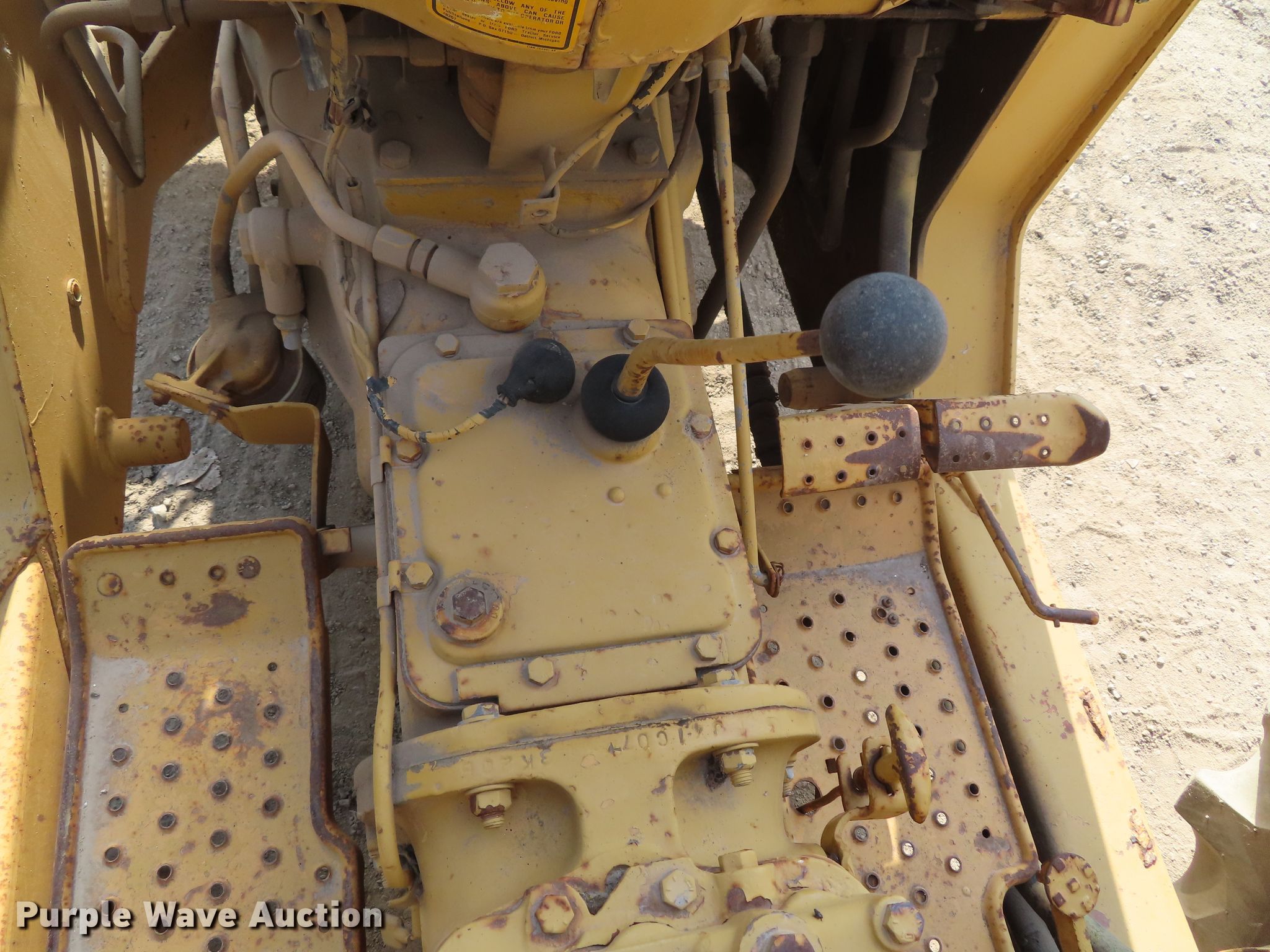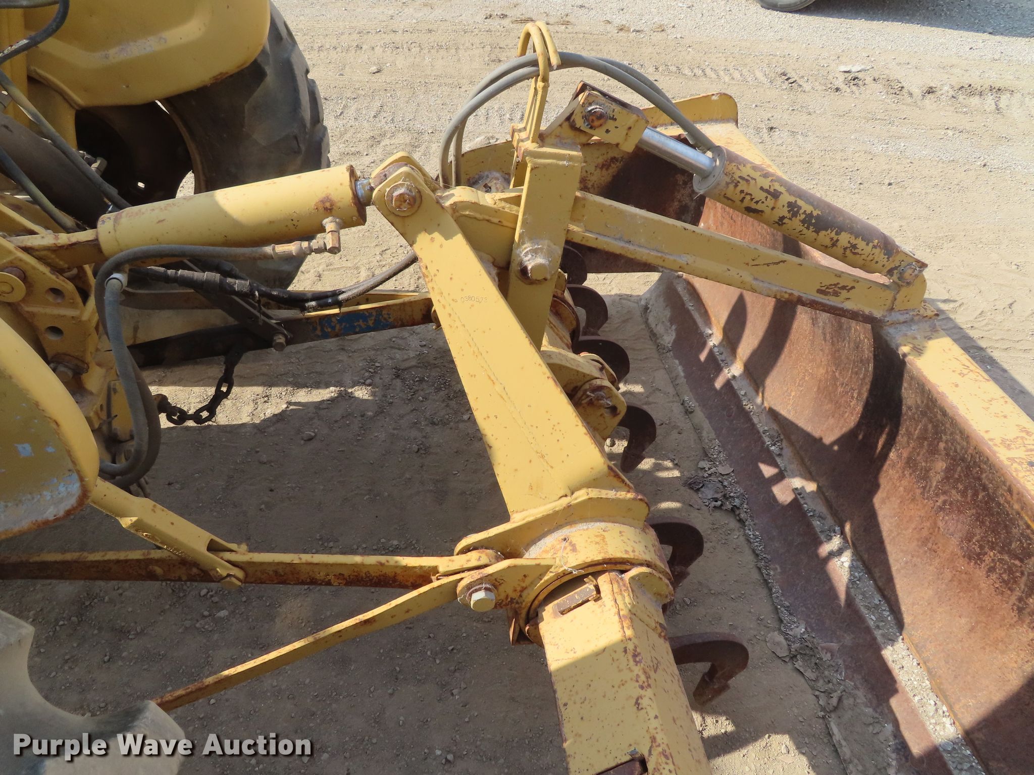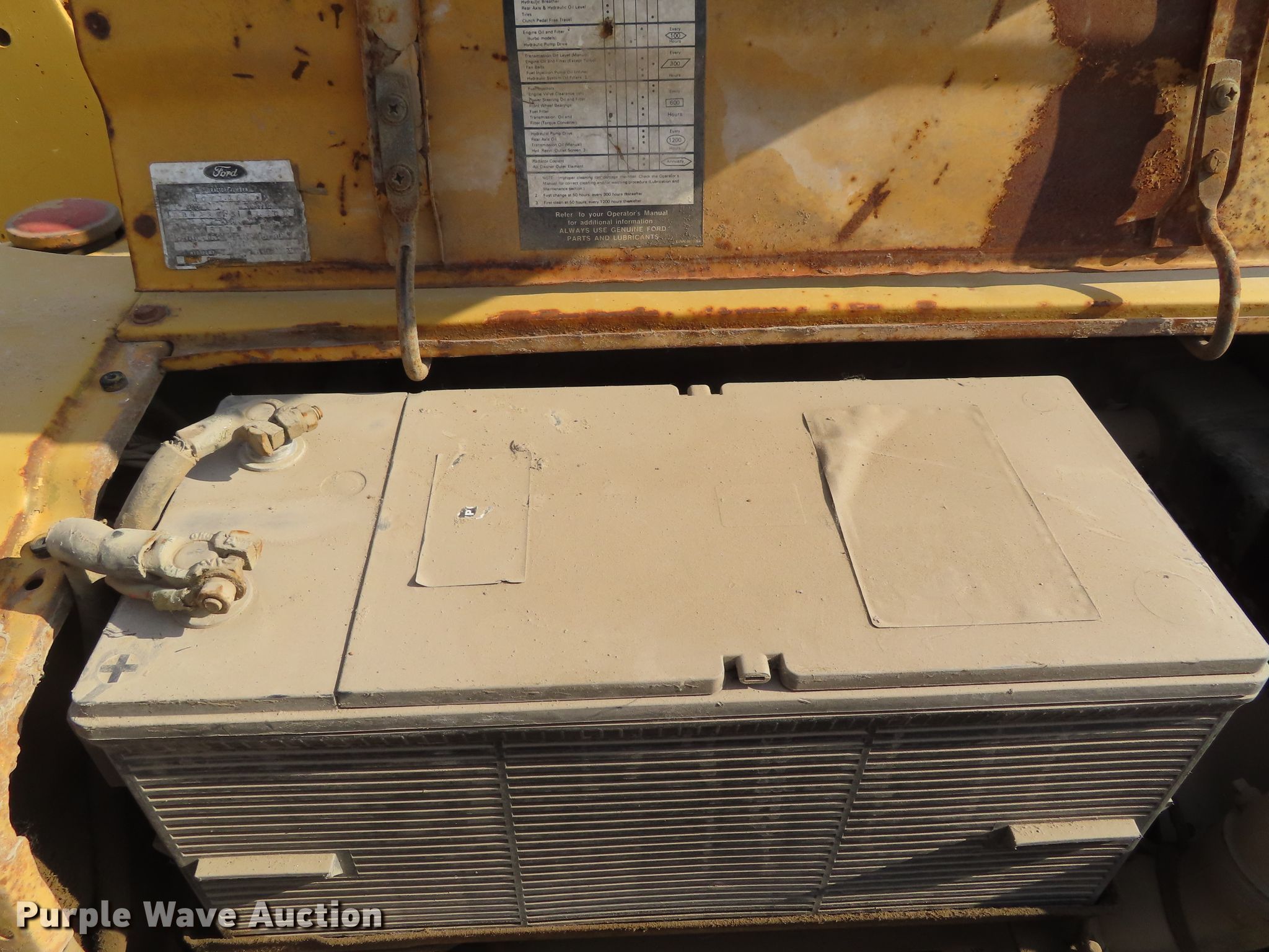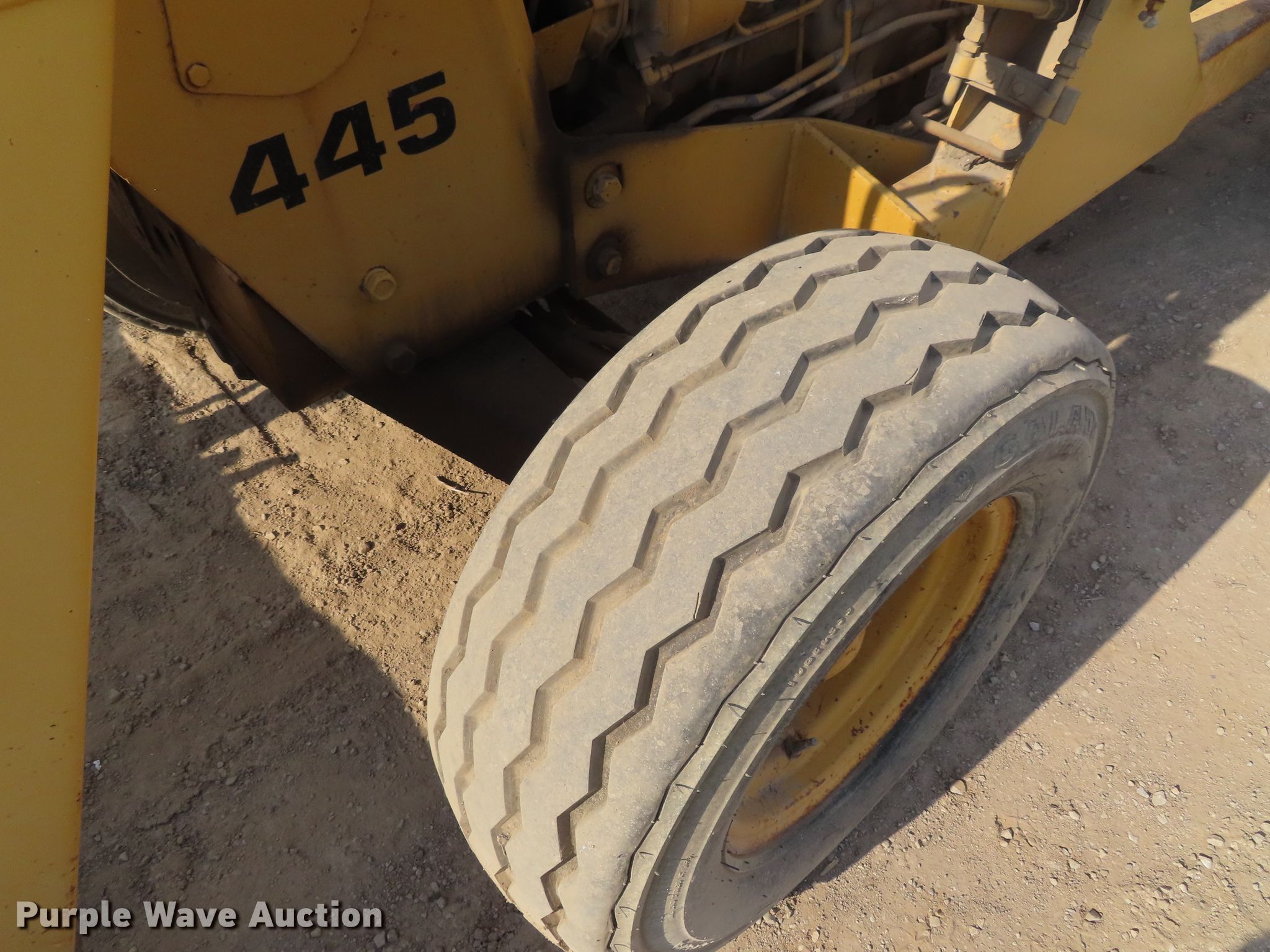 Purple Wave is selling a used Tractor in Kansas. This item is a Ford 445 tractor with the following: 2,190 hours on meter, Ford 3.0L three cylinder diesel engine, 4F-4R gears, Left-hand reverser, Ford 19-856 loader, 84"W bucket, Joystick controls, Three point, Top link, 80"W box blade, (8) shanks, Hydraulic shank control, Three point, 11L-16 front tires, 17.5-24 rear tires, Dead battery, Coolant leak, Serial C714642