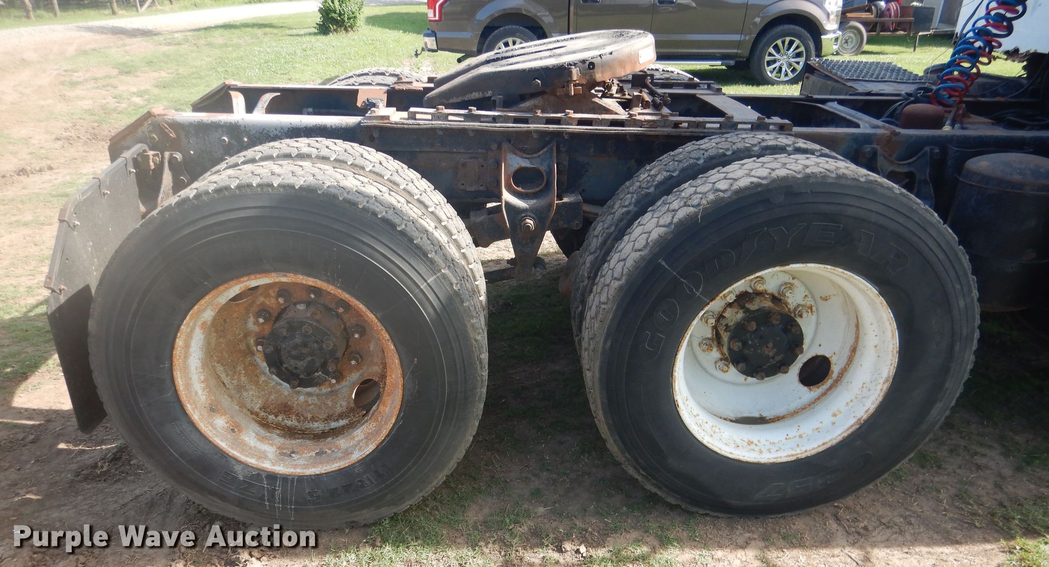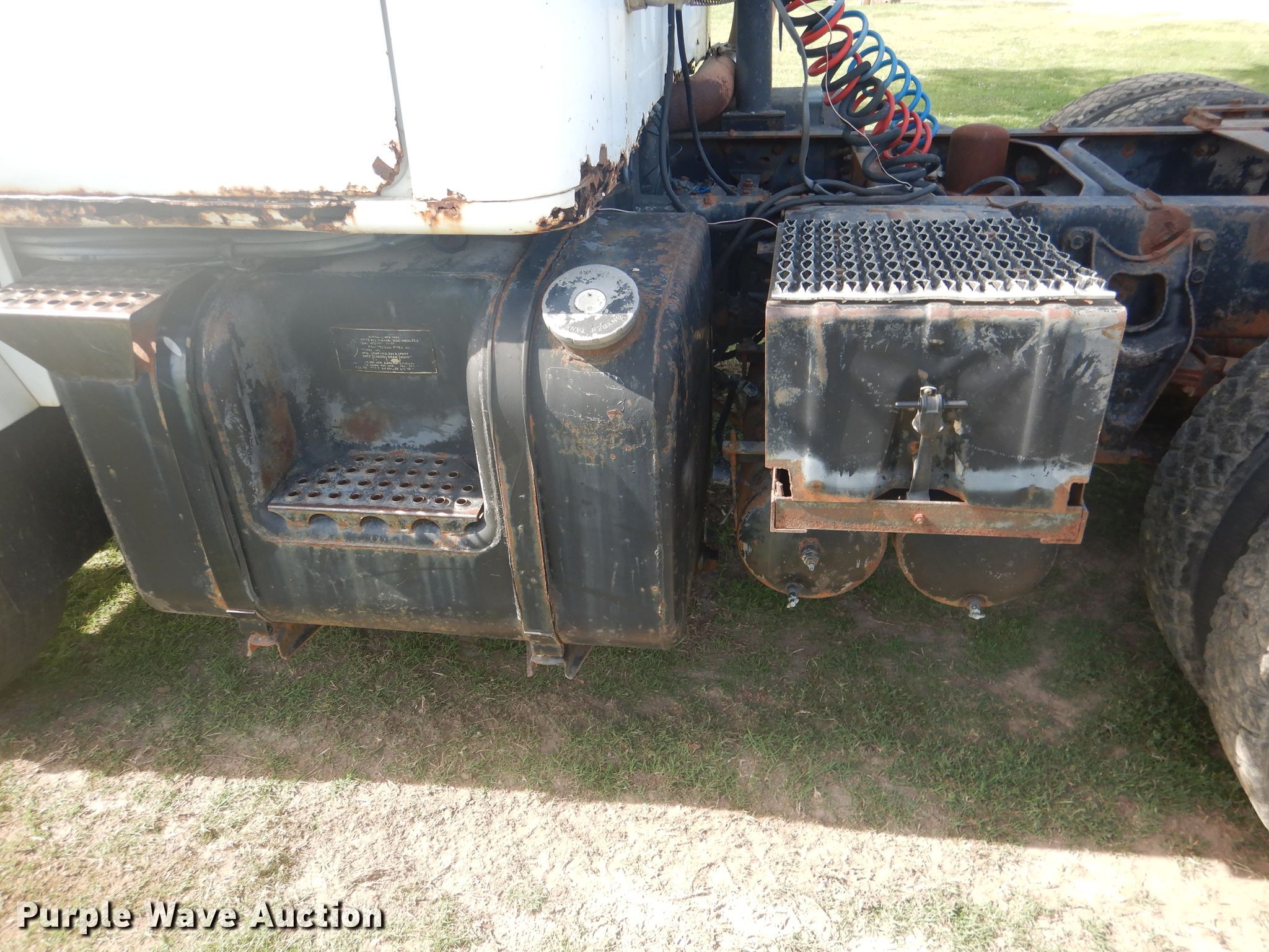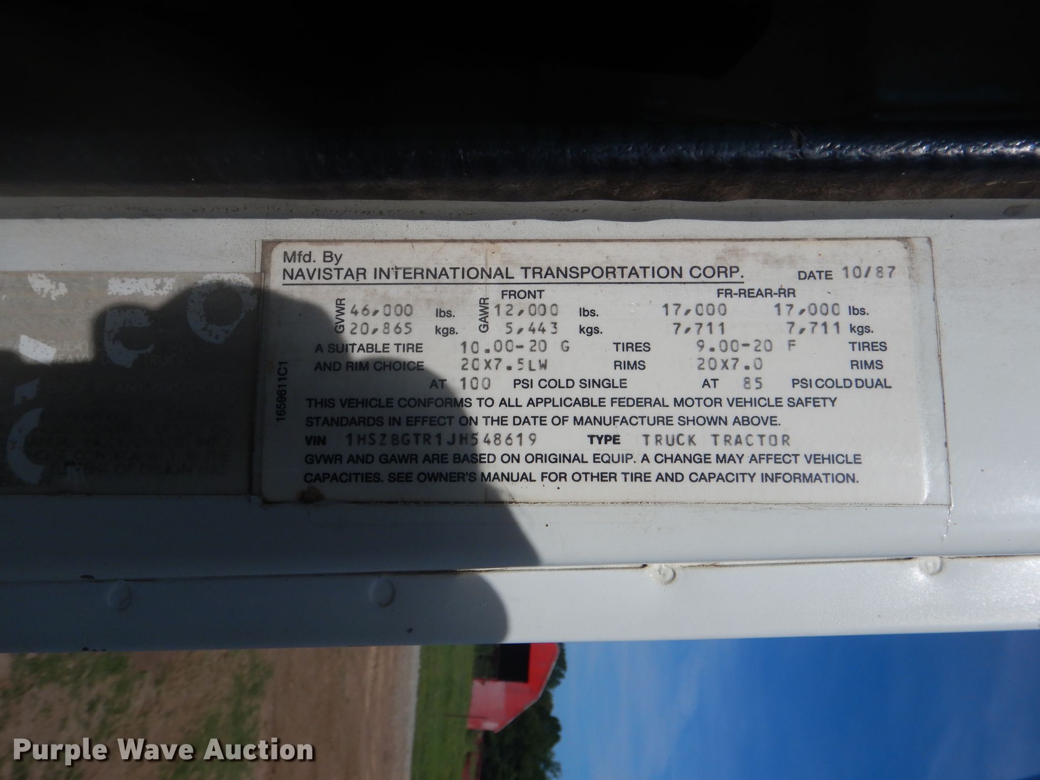 Purple Wave is selling a used Truck Tractor in Oklahoma. This item is a 1988 International F2275 semi truck with the following: 336,663 miles on odometer, Cummins 14.0L L6 diesel engine, Eaton Fuller nine speed manual transmission, Tandem axle, Fixed fifth wheel plate, Spring suspension, Air brakes, 11R22.5 tires, GVWR 46,000 lbs, FAWR 12,000 lbs, IAWR 17,000 lbs, RAWR 17,000 lbs