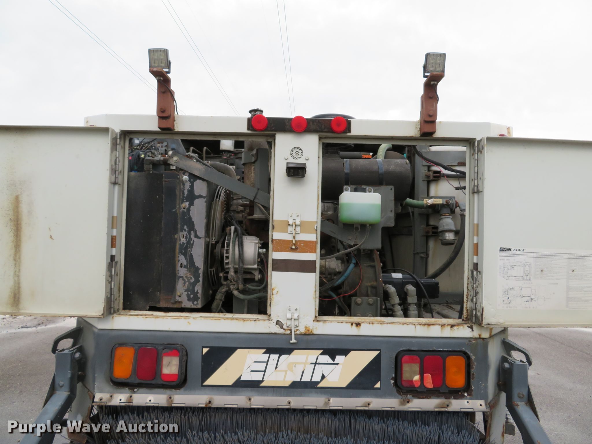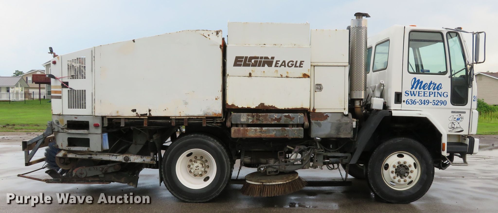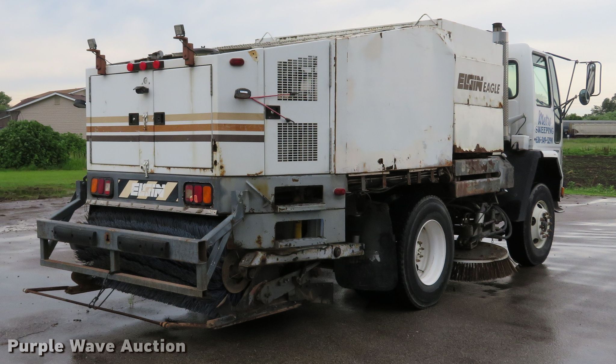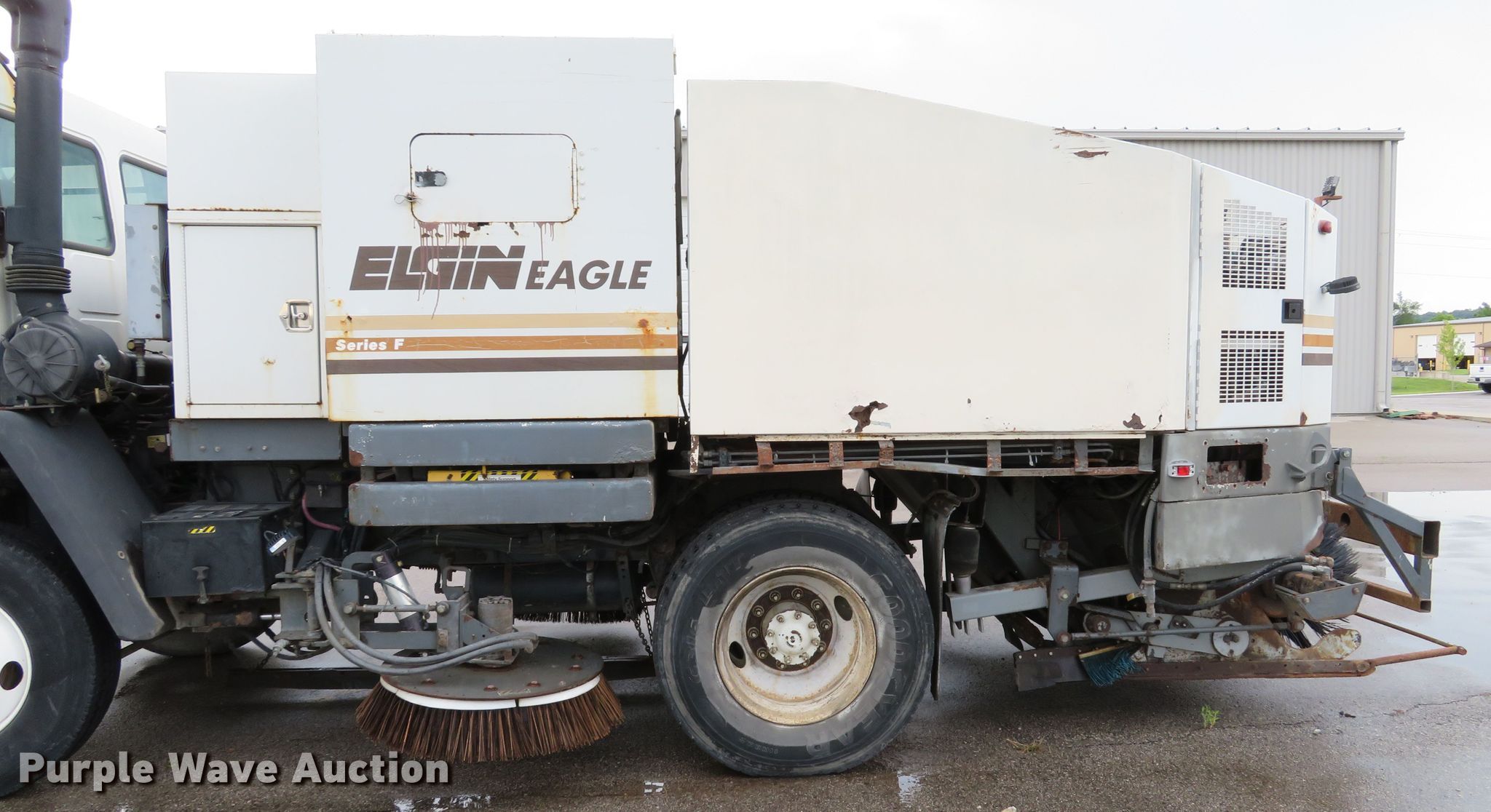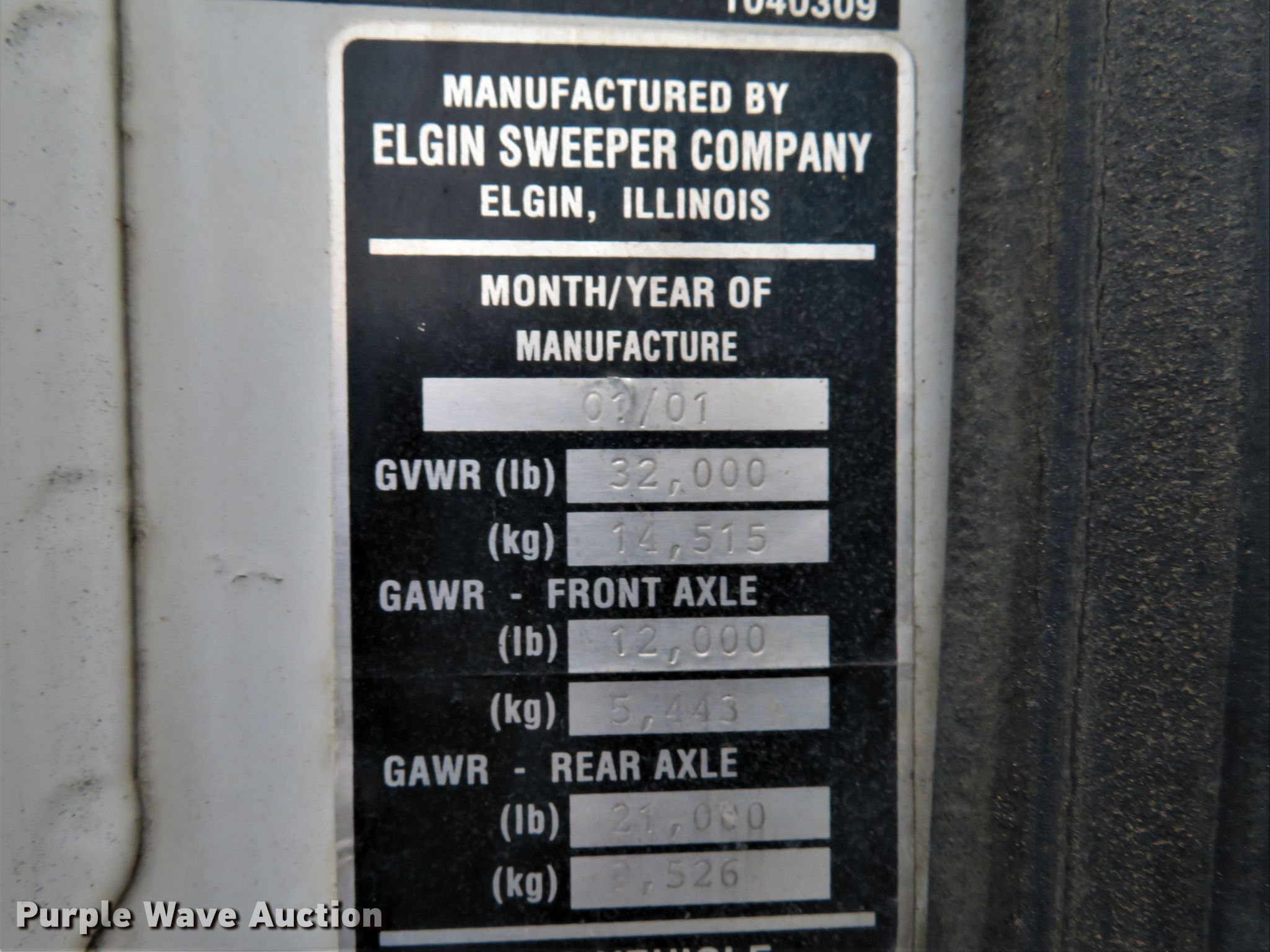 Purple Wave is selling a used Street Sweeper Truck in Illinois. This item is a 2001 Sterling SC8000 street sweeper truck with the following: 64,556 miles on odometer, 7,858 hours on meter, Cummins ISB205 5.9L L6 diesel engine, 205 HP, Automatic transmission, AC and heat, AM/FM, Dual operating station, Video monitoring system, 60"W broom, Water spray system, Elgin Eagle F series conveyor bed, 4.5 cu. yd. capacity, Isuzu four cylinder engine, 36" diameter left gutter broom, 36" diameter right gutter broom, Serial F1202D, Air suspension, Air brakes, 11R22.5 tires, GVWR 32,000 lbs, Non-operational driver's window, AC does not blow cold, Non-operational water system, possibly due to belt missing on pump, Non-operational tachometer, Non-operational hour meter, Non-operational sweeper engine