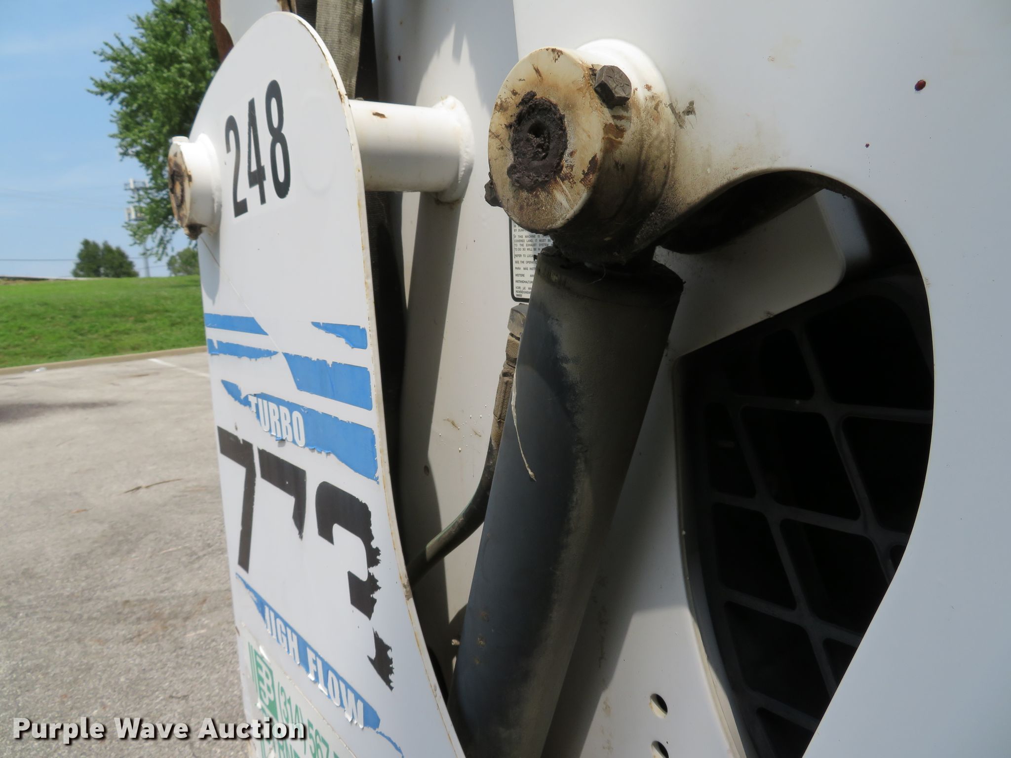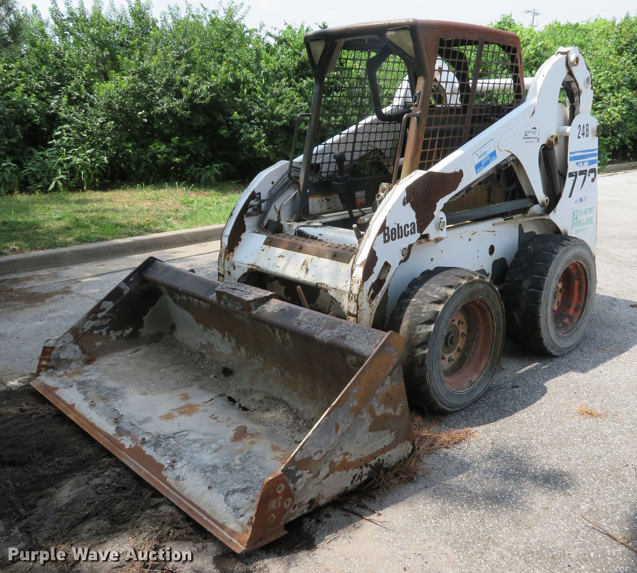 Purple Wave is selling a used Skid Steer Loader in Missouri. This item is a 2001 Bobcat 773 skid steer with the following: 5,001 hours on meter, Kubota V2003-T-EU4 four cylinder diesel engine, 56 HP, Two speed hydrostatic transmission, OROPS, Hand bucket controls, EMS panel, 75"W general purpose bucket, Bolt-on cutting edge, Manual quick coupler, Auxiliary hydraulics, Auxiliary electrical outlet, 10 x 16.5 tires, Battery dead, Engine smokes, Serial 519019605