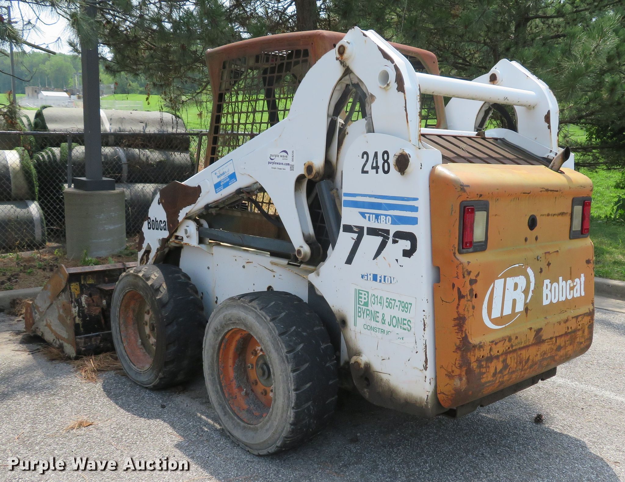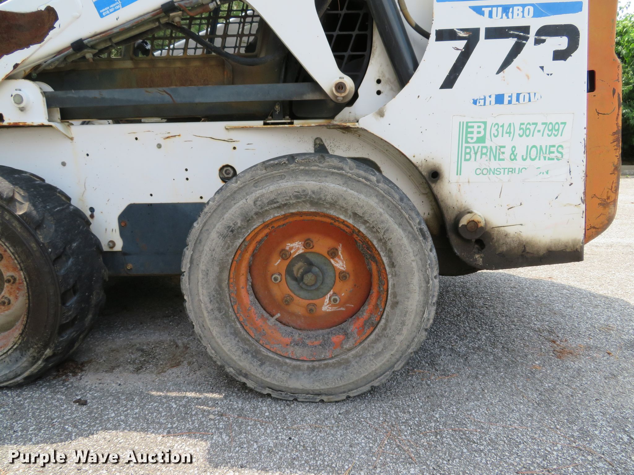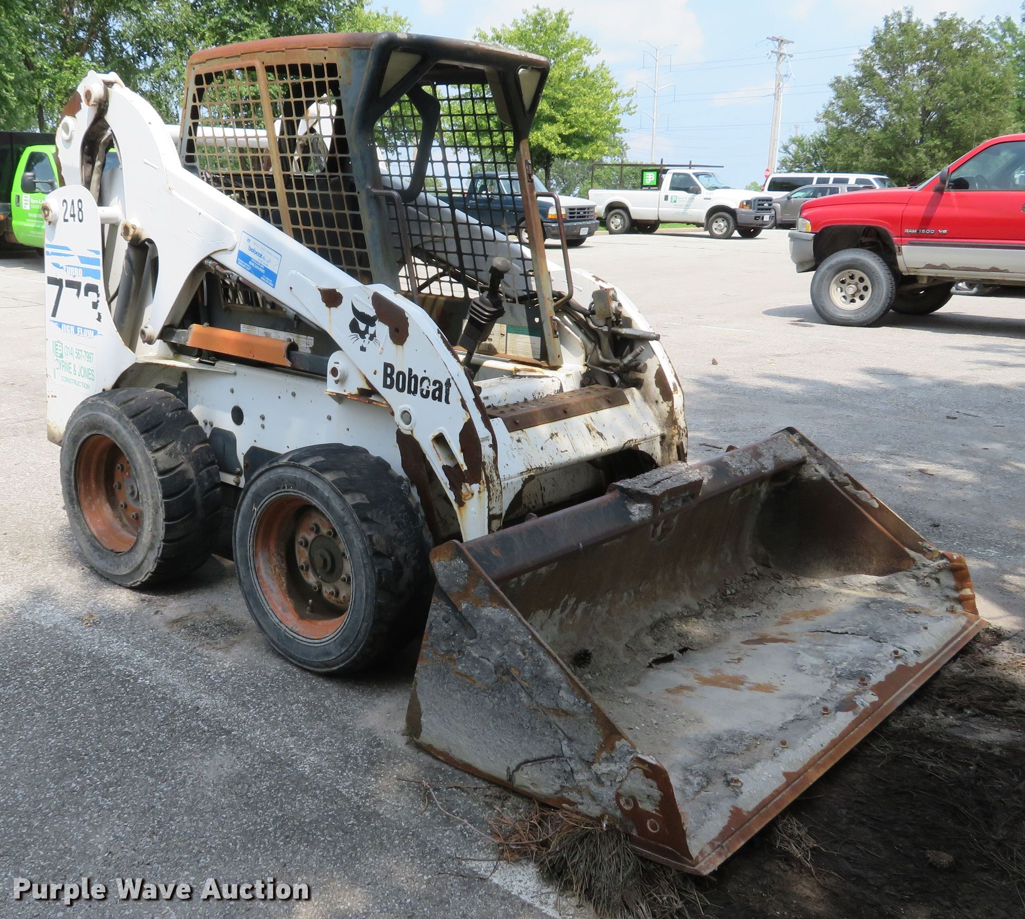 2001 Bobcat 773 skid steer. 5,001 hours on meter, Kubota V2003-T-EU4 four cylinder diesel engine 56 HP, Two speed hydrostatic transmission, OROPS Hand bucket controls, EMS panel, 75"W general purpose bucket Bolt-on cutting edge, Manual quick coupler, Auxiliary hydraulics, Auxiliary electrical outlet, 10 x 16.5 tires, Battery dead, Engine smokes, Serial 519019605. Byrne & Jones Construction. 13940 St Charles Rock Rd. Bridgeton, MO 63044