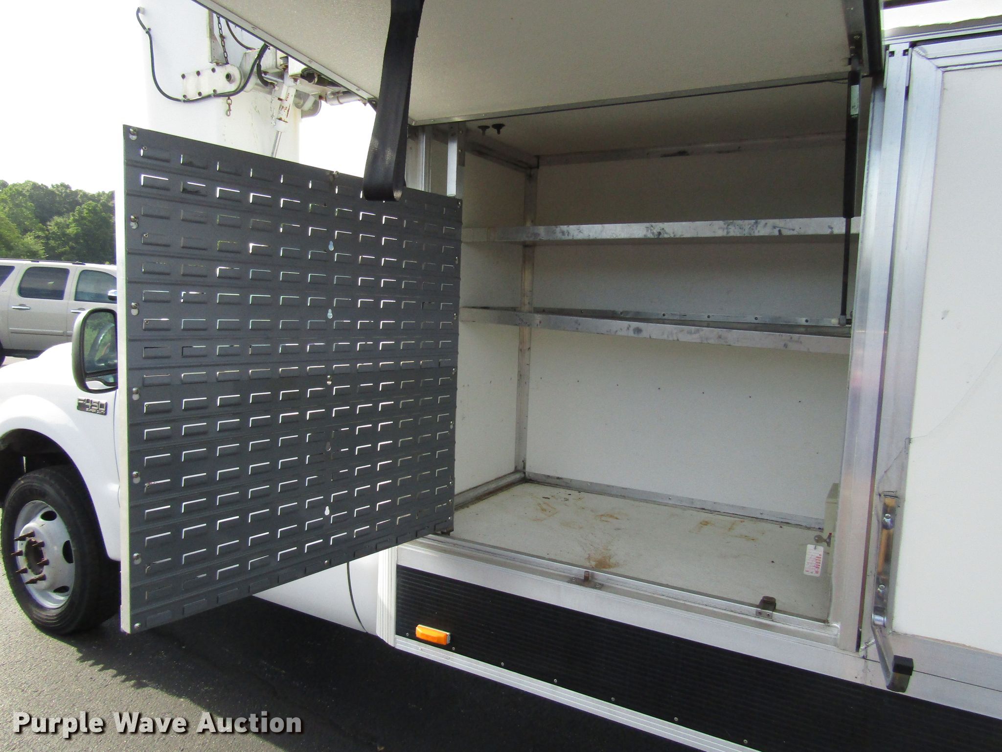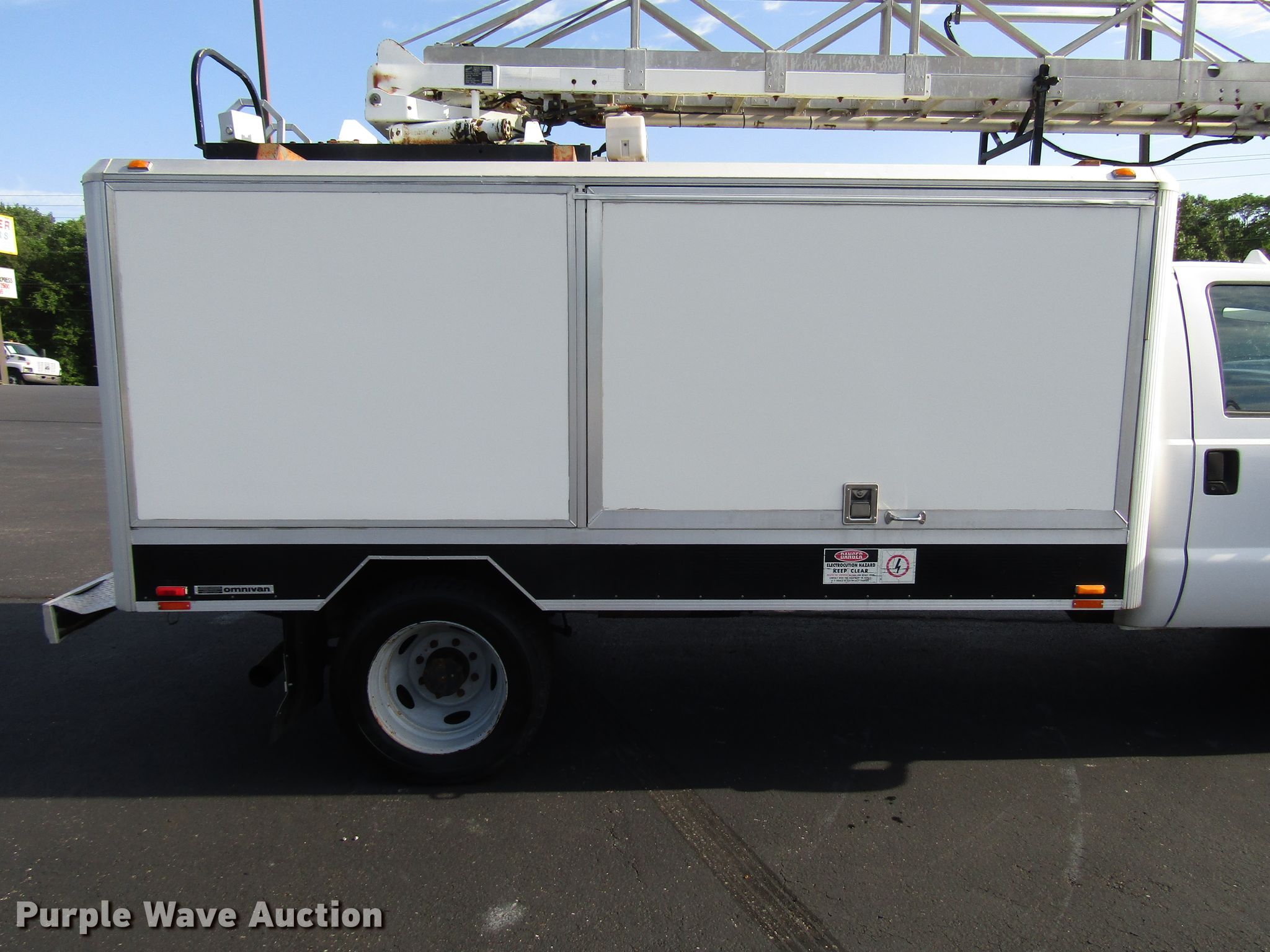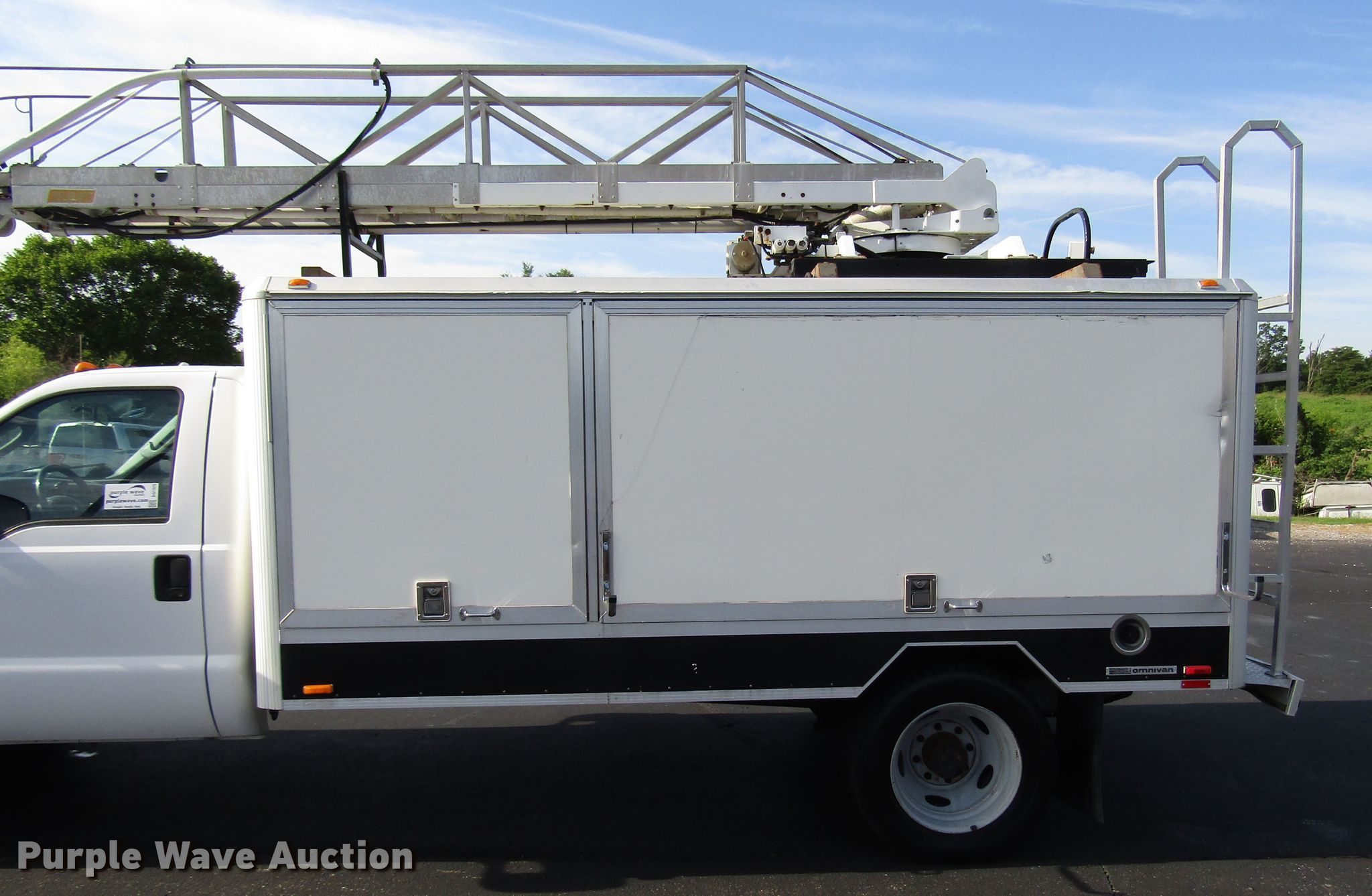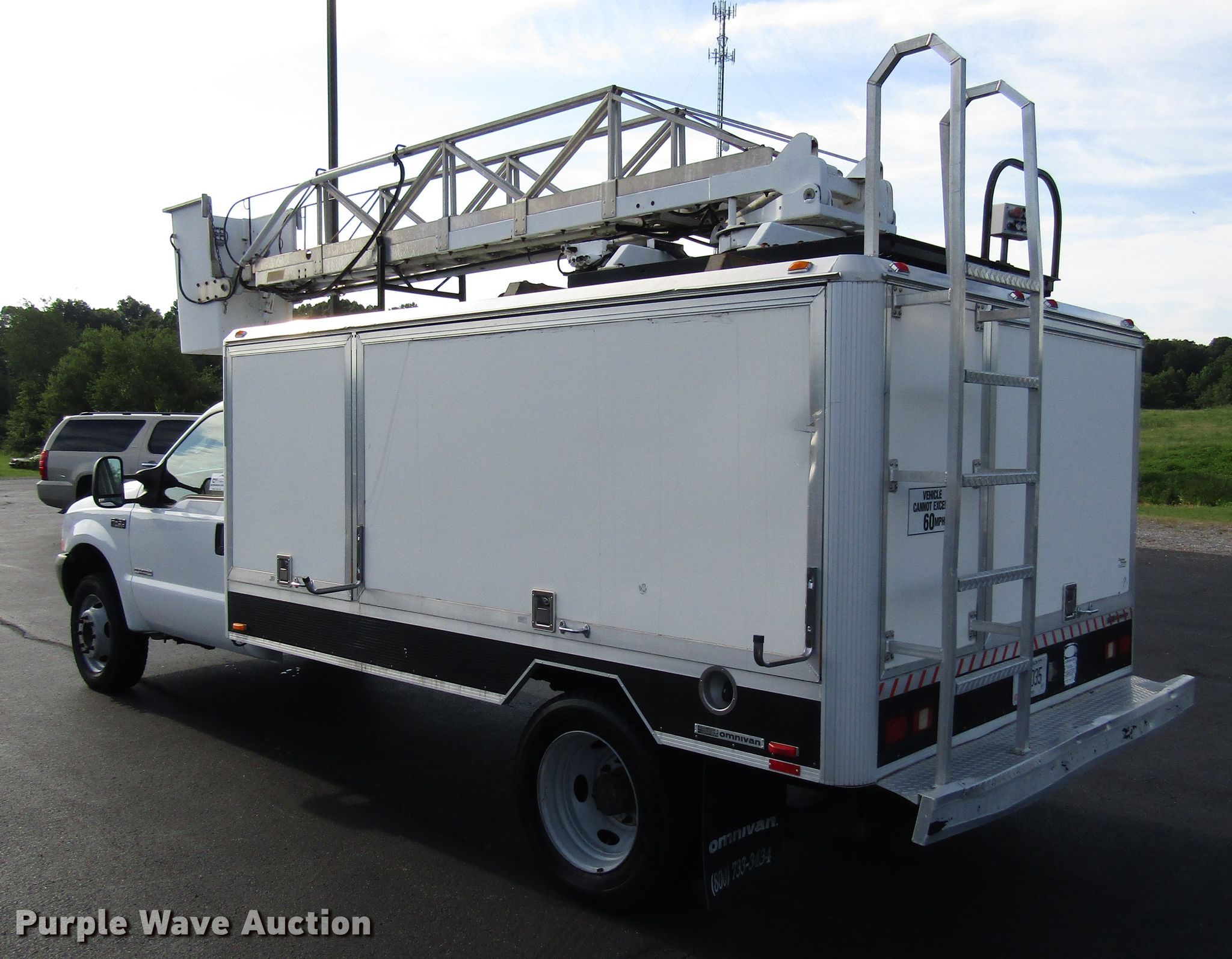 Purple Wave is selling a used Bucket Truck in Kentucky. This item is a 2004 Ford F450 Super Duty bucket truck with the following: 94,899 miles on odometer, 6.0L V8 OHV 32V diesel engine, Automatic transmission, Single axle, AC and heat, Omnivan 12.5' utility bed, 2004 Telelift TTS25-B-GY telescopic boom, 300 lbs maximum lift capacity, 35.5' maximum lift height, Man basket, Ground and platform controls,, 188" wheelbase, Spring suspension, Hydraulic brakes, 225/70R19.5 tires, GVWR 15,000 lbs