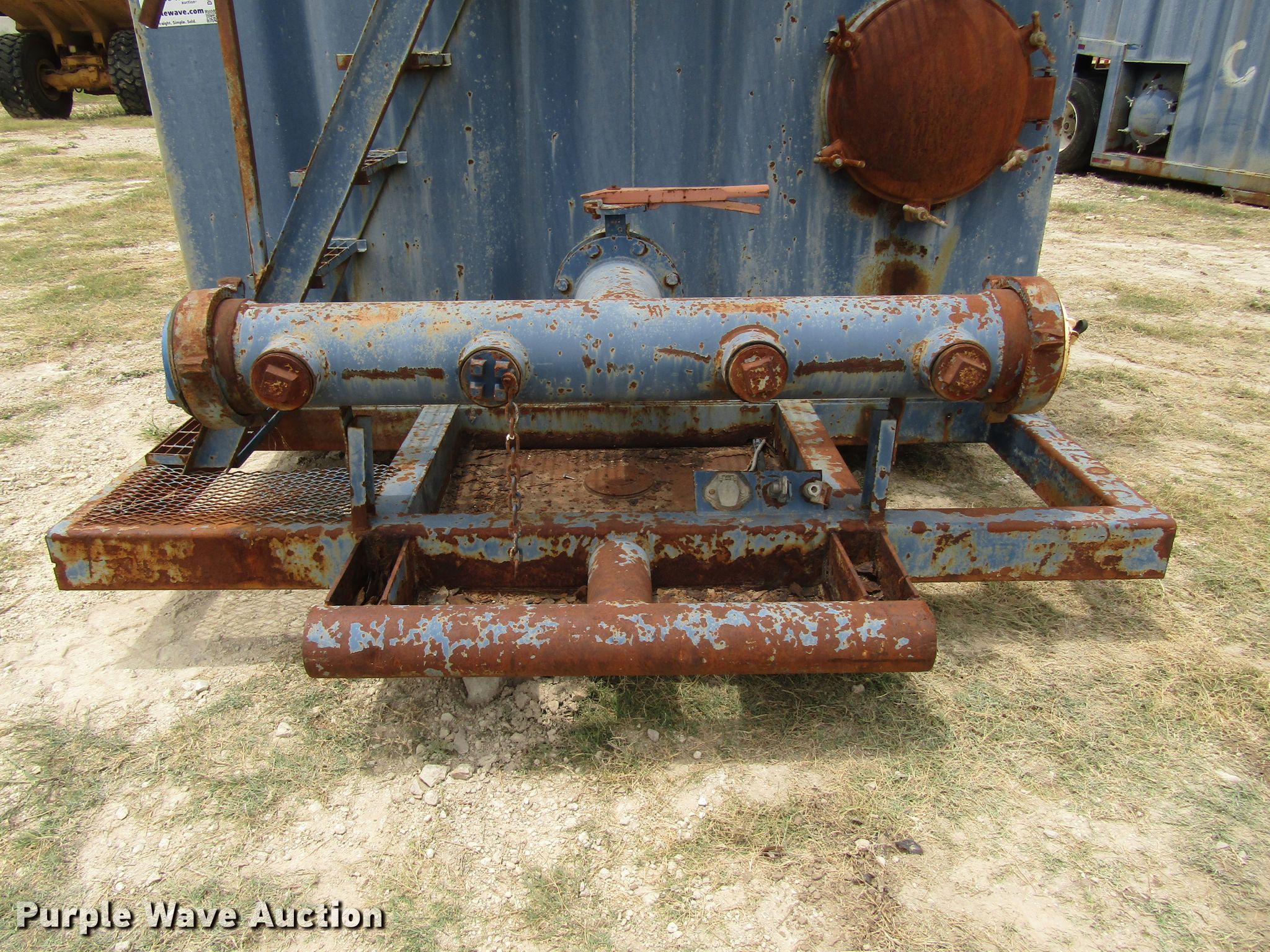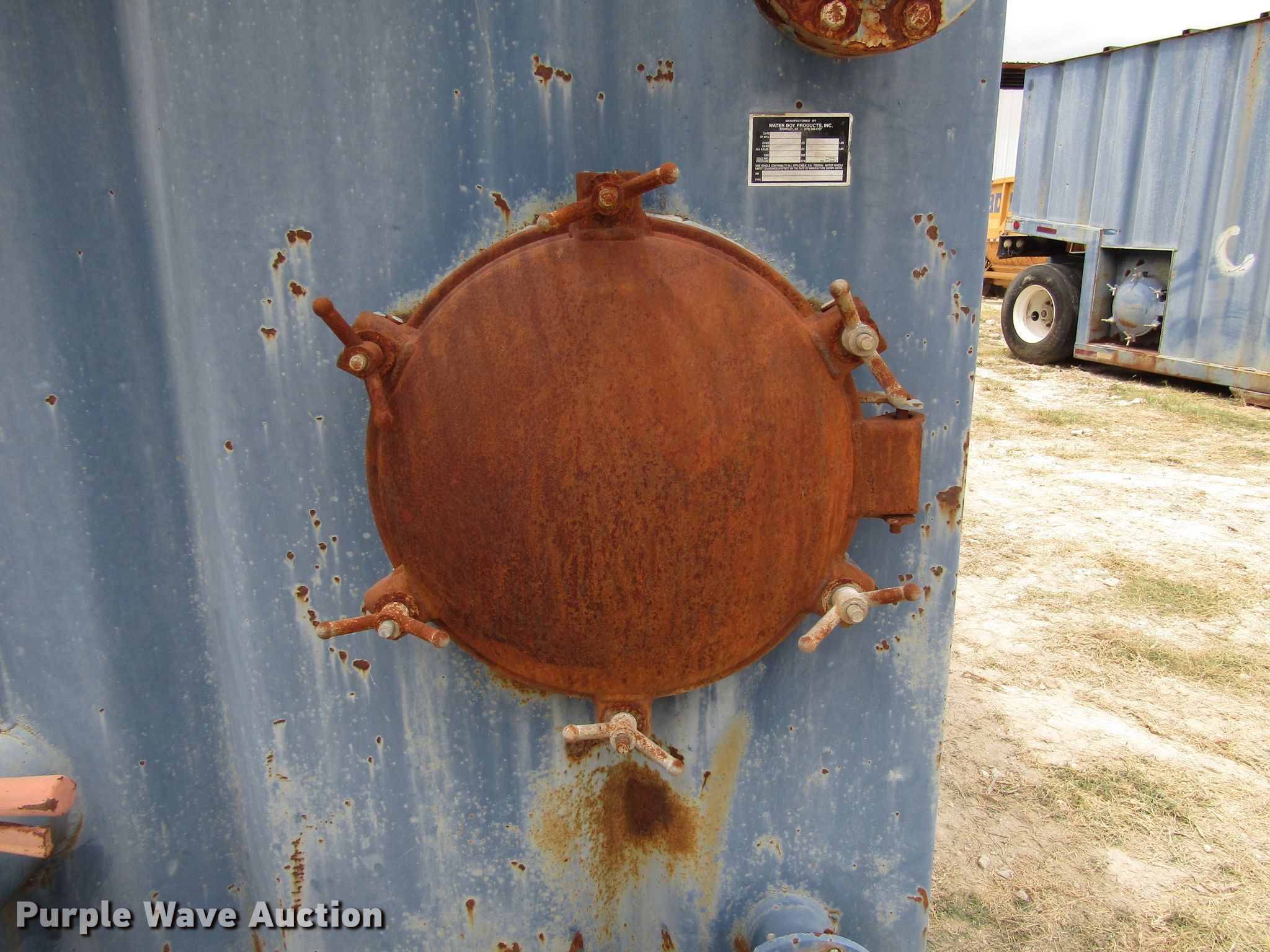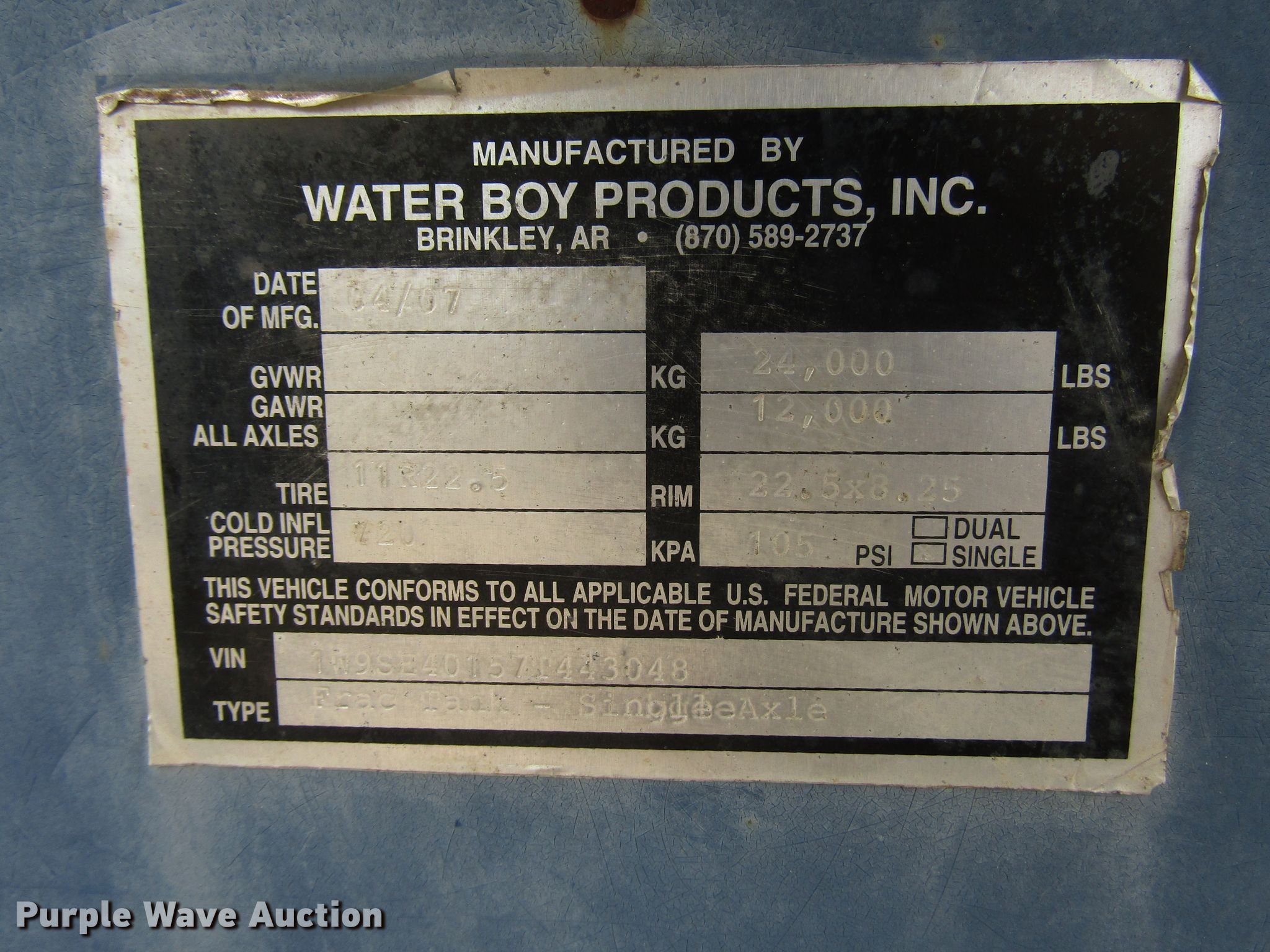 Purple Wave is selling a used Oilfield Trailer in Texas. This item is a 2007 Water Boy Products frac tank trailer with the following: 44' overall length, 40'L x 102"W steel tank, 500 barrel capacity, (2) 21"W manways/manholes, Spring suspension, Air brakes, Single axle, Steel wheels, 11R22.5 tires, GVWR 24,000 lbs, GAWR 12,000 lbs