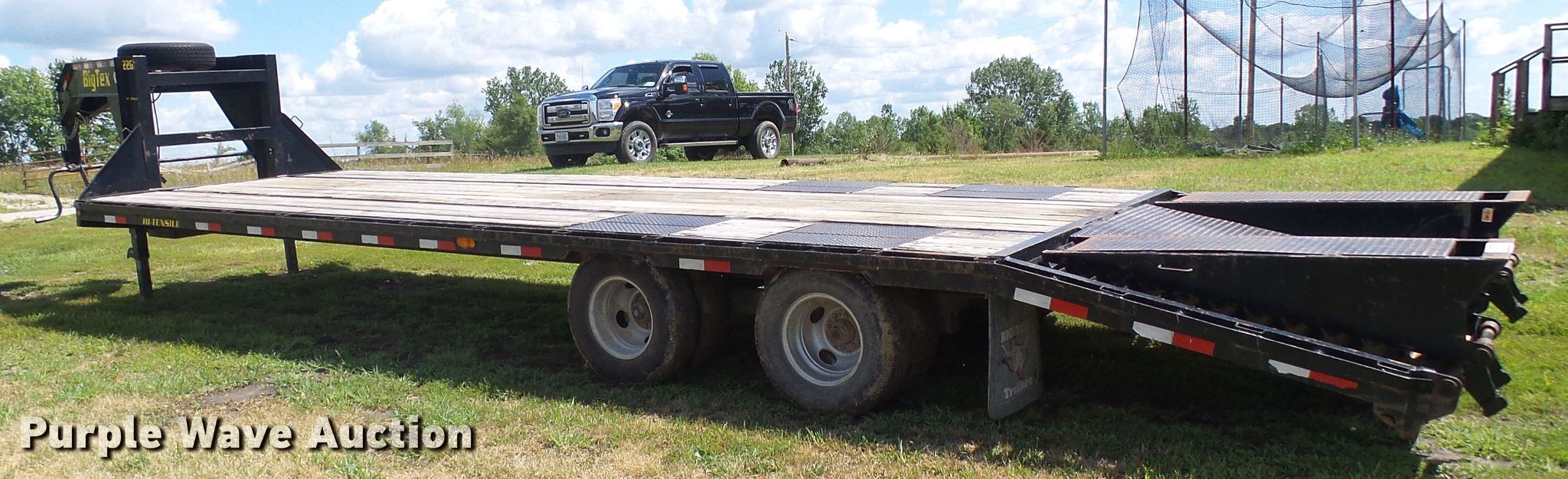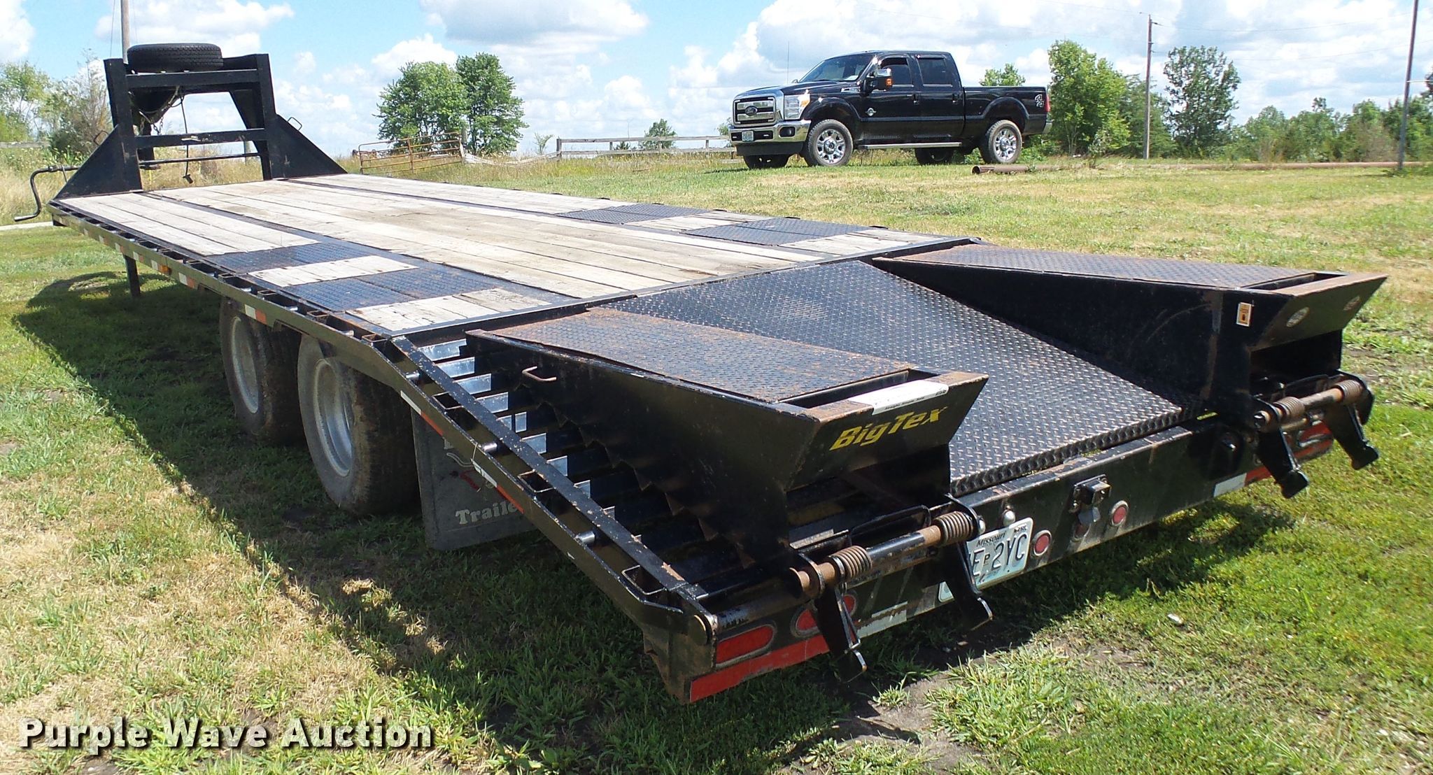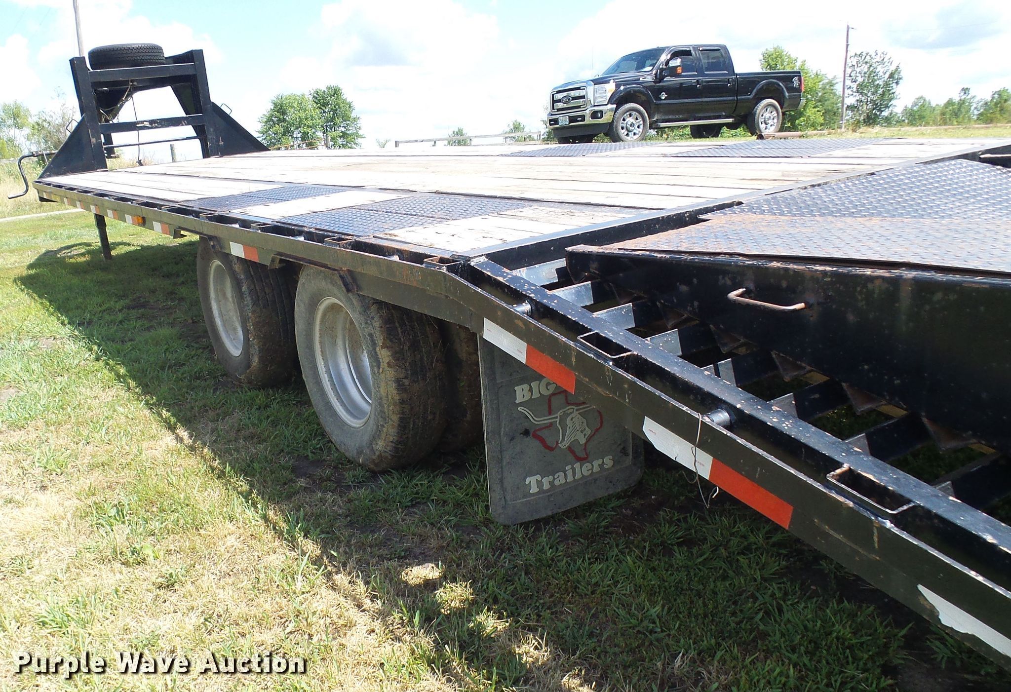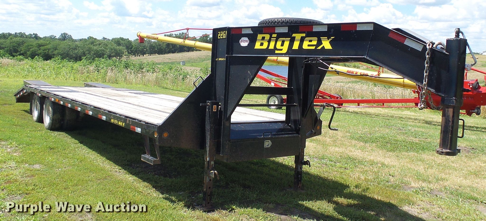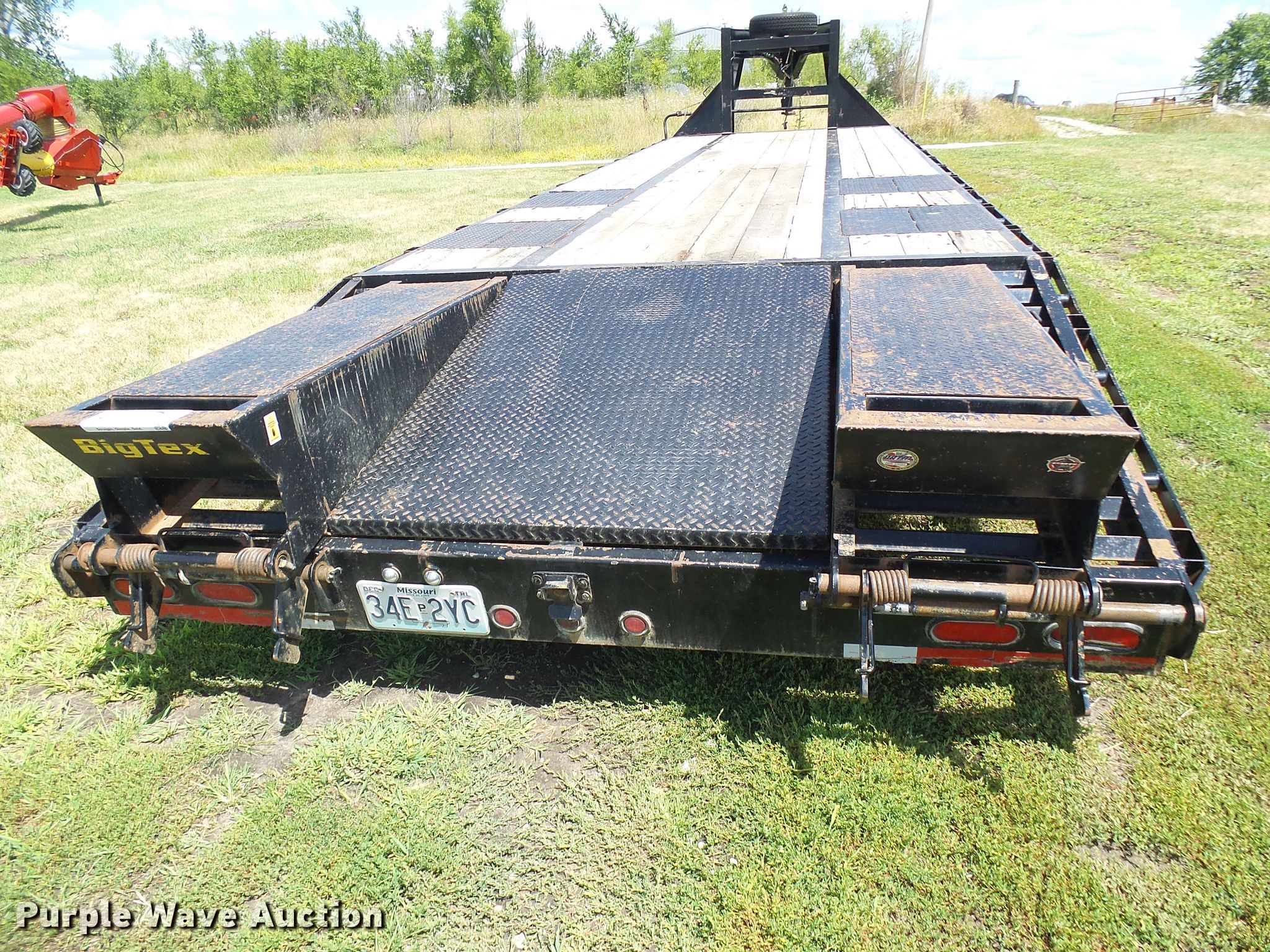 Purple Wave is selling a used Equip. Trailer in Missouri. This item is a 2014 Big Tex 22GN equipment trailer with the following: 30' overall length, 25'L x 102"W wood deck, 5' tail length, 5'5"L ramps, Dual leg two speed landing gear, 2 5/16" ball hitch, Spring suspension, Electric brakes, Tandem axle, Steel wheels, 235/80R16 tires, GVWR 22,500 lbs