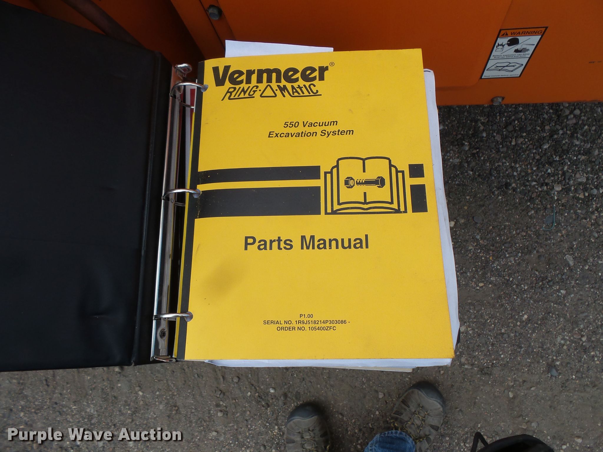 2006 Vermeer Ring-o-matic 550 vacuum excavator. Caterpillar 3024C four cylinder diesel engine 465 hours on meter, Rear manway, 4" rear outlet, 15'4"L x 3" diameter telescopic boom Remote control, Rear hose reel, Jack stand, Spring suspension, Electric brakes, Tandem axle, 245/75R16 tires. Transfer of ownership documentation will be a bill of sale which will be assigned and distributed by the seller. 1R9J518226P303035. Nygaard Construction. 14203 230th St. Hutchinson, MN 55350