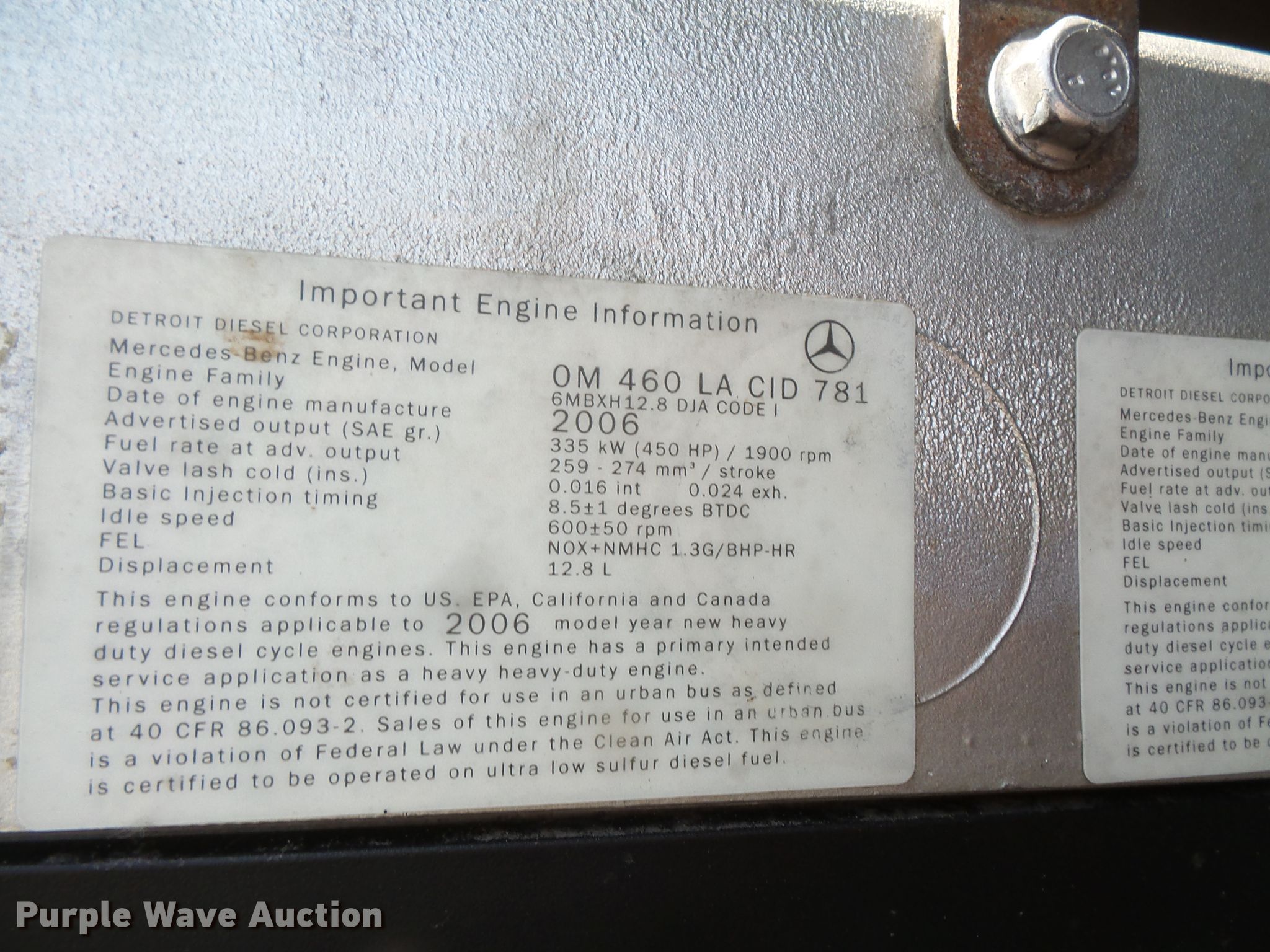 Purple Wave is selling a used Construction Dump Truck in Iowa. This item is a 2007 Freightliner Columbia semi truck with the following: 520,342 miles on odometer, 4,501 hours on meter, Mercedes-Benz MBE 4000 12.8L L6 diesel engine, 10 speed manual transmission, Tandem axle, Inter-axle differential lock, Heat, Cruise, Power windows and locks, Heated mirrors, Air ride cab, Dump valves, PTO, Aluminum deck plate, Fixed fifth wheel plate, Dual fuel tanks, Air suspension, Air brakes, 11R22.5 front tires, 295/75R22.5 rear tires, GVWR 52,000 lbs, Unit# 55007127