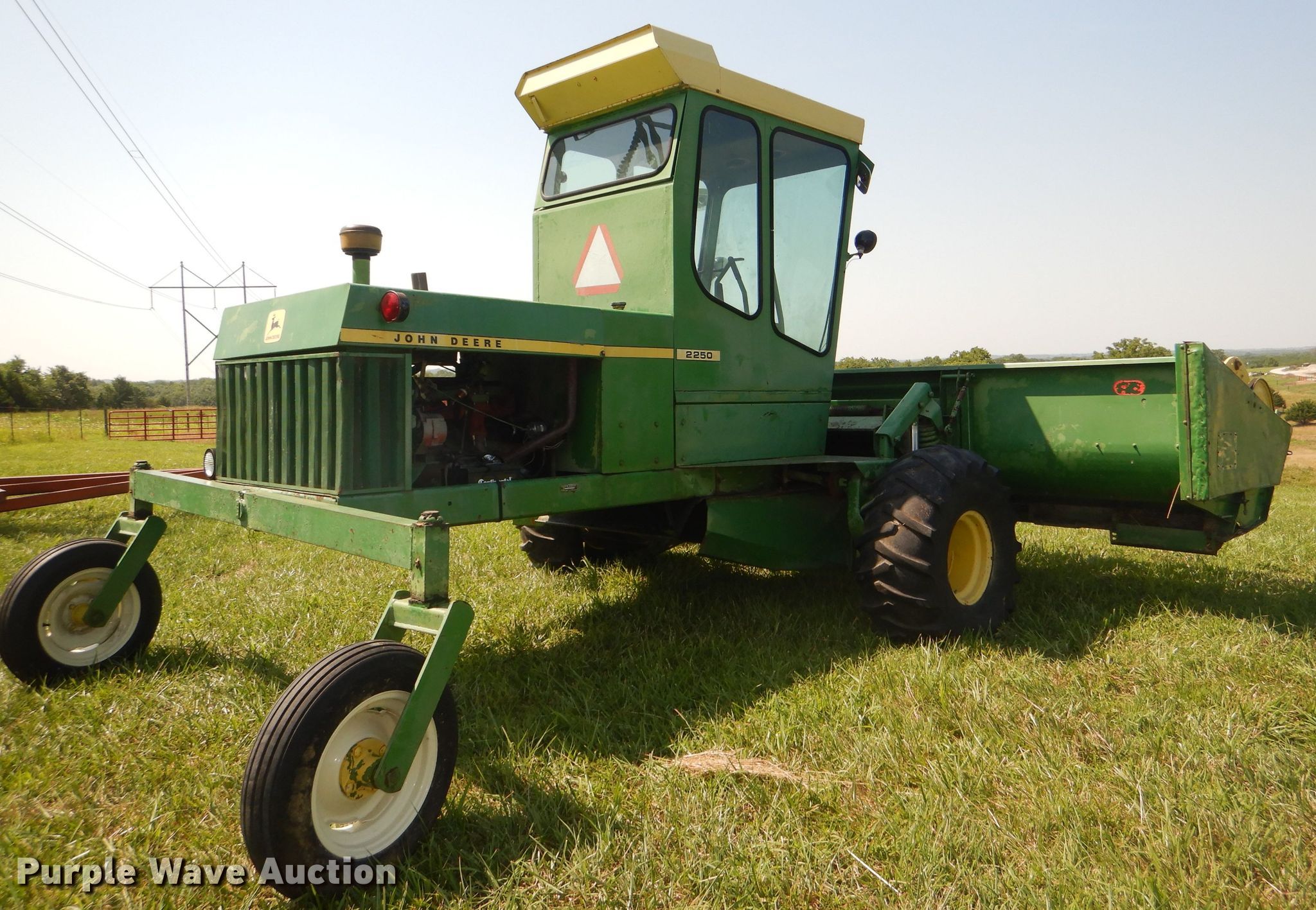 Purple Wave is selling a used Windrower Self Propelled in Kansas. This item is a 1975 John Deere 2250 windrower with the following: John Deere six cylinder gas engine, Hydrostatic transmission, AC, John Deere 14'W sickle head, Serial 266660E, 16.5-16.1 front tires, 5.90-15 rear tires, Serial 265173E