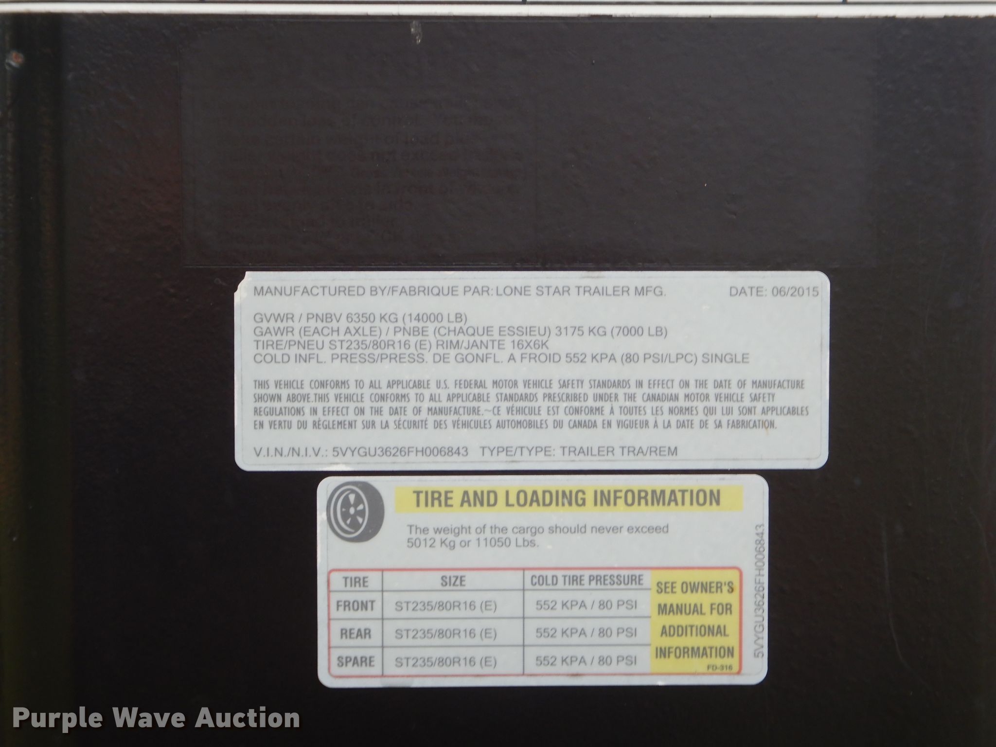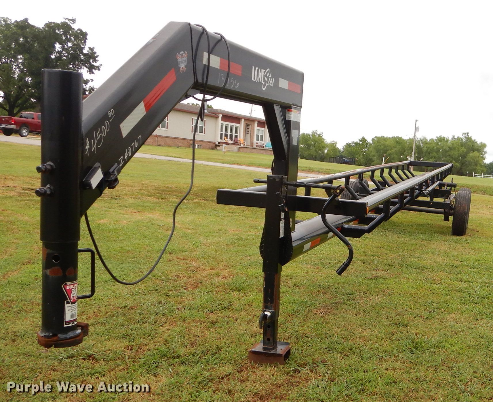 Purple Wave is selling a used Hay Handling in Oklahoma. This item is a 2015 Lone Star hay bale trailer with the following: 44' overall length, 36'L deck, 10,000 lbs max lift capacity, 12,000 lbs max static capacity, Jack stand, Spring suspension, Electric brakes, Tandem axle, 235/80R16 tires