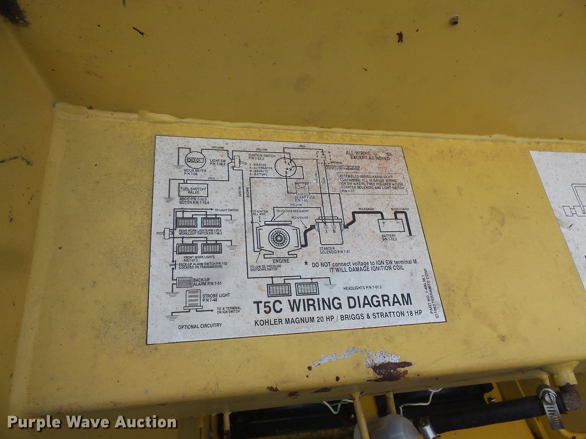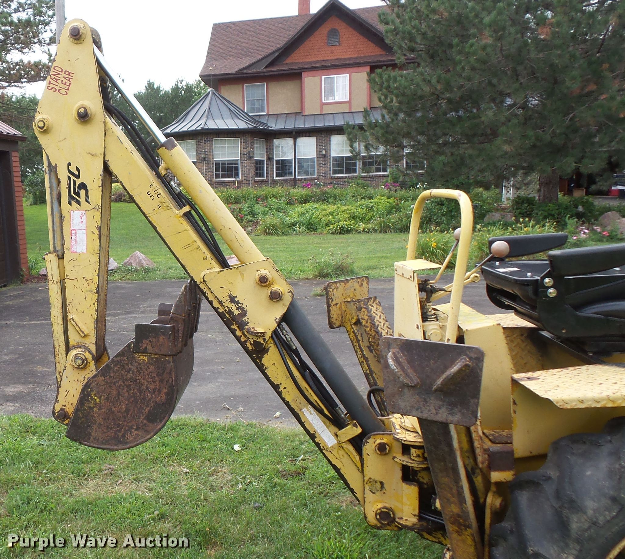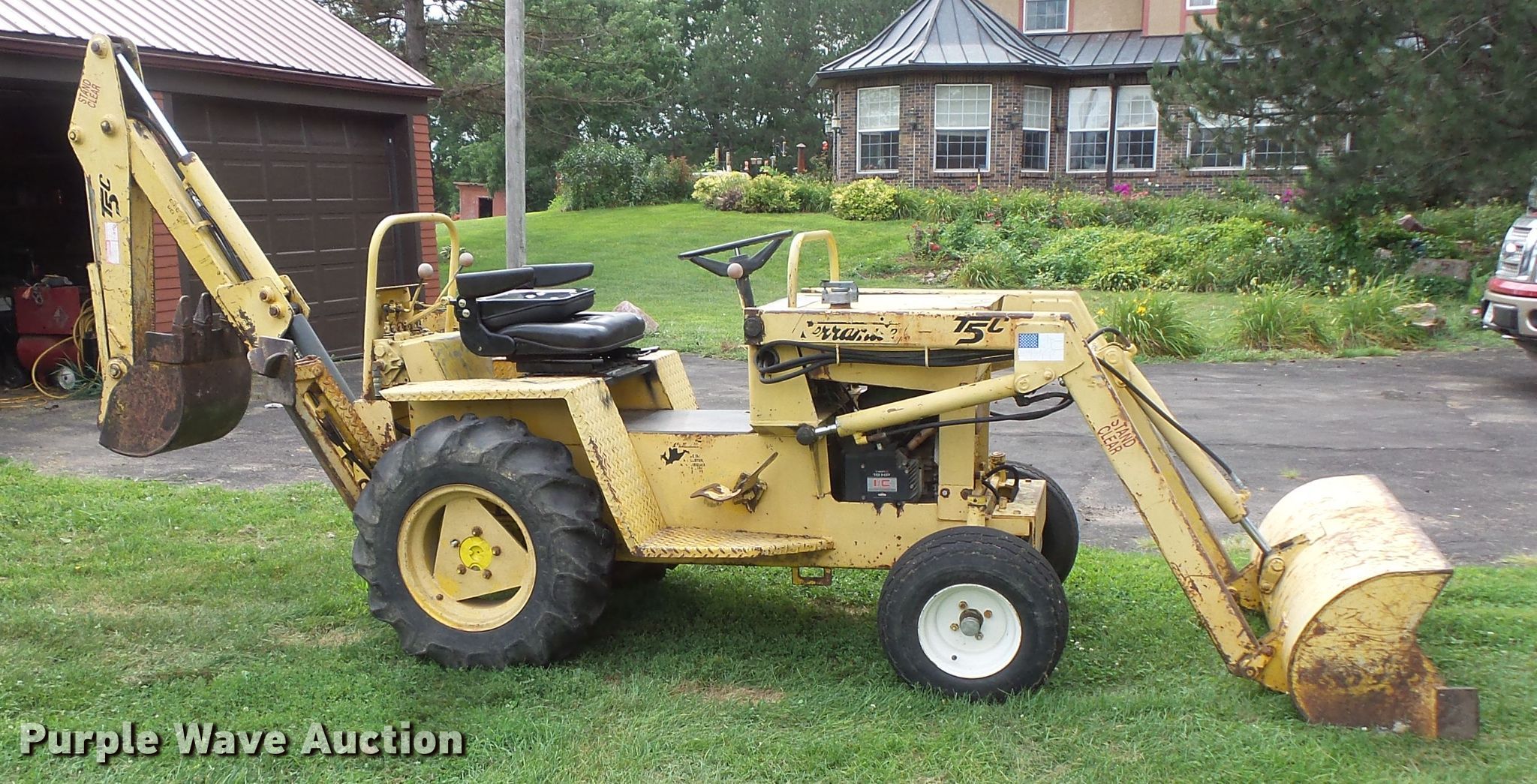 Purple Wave is selling a used Tractor Loader Backhoe in Iowa. This item is a Terramite T5C backhoe with the following: 2,648 hours on meter, Briggs & Stratton two cylinder gas engine, Hydrostatic transmission, Two stick backhoe controls, 48"W loader bucket, Weld-on cutting edge, 33" stick length, 16"W backhoe bucket, Weld-on cutting edge, 20x5x8.00-10 front tires, 9.5-16 rear tires
