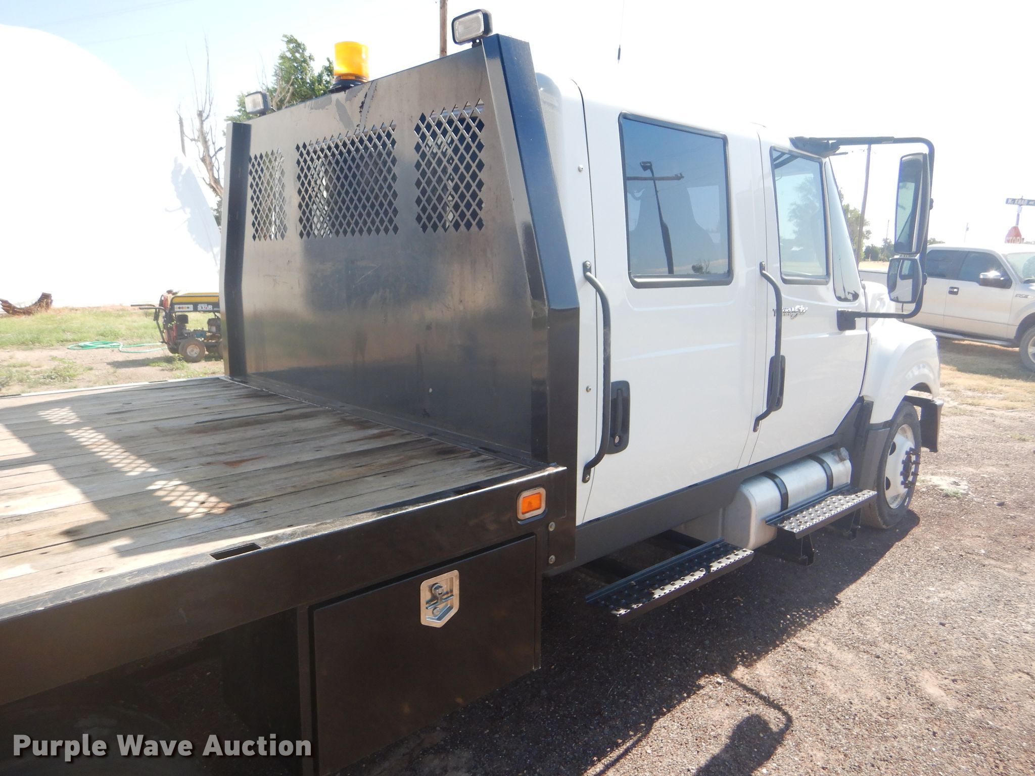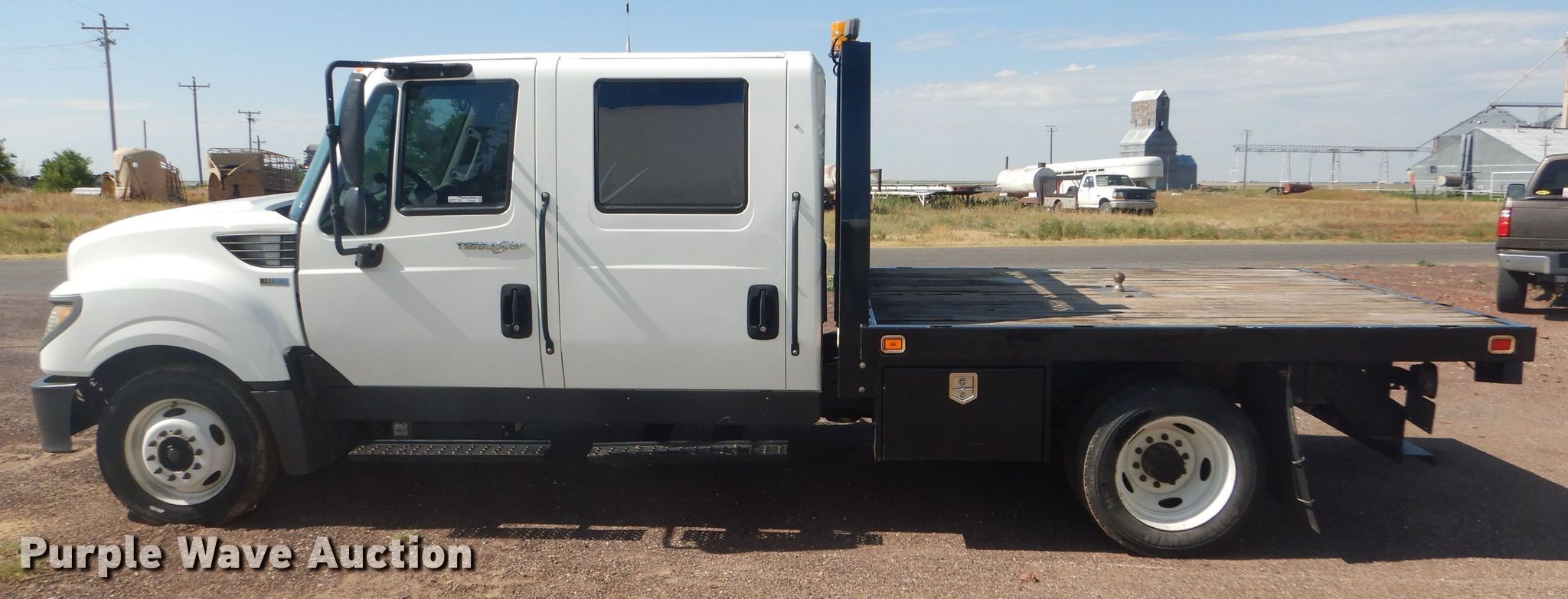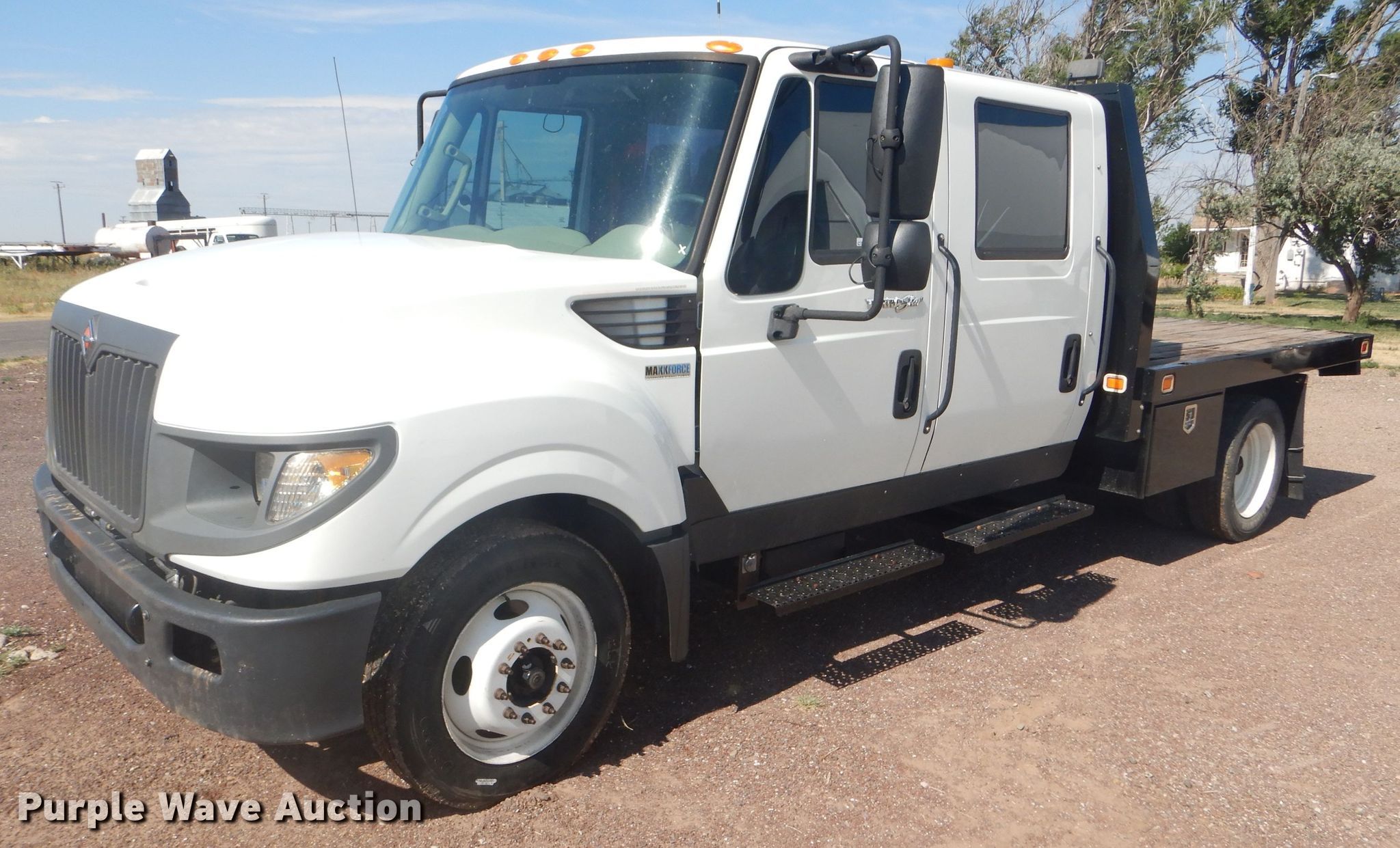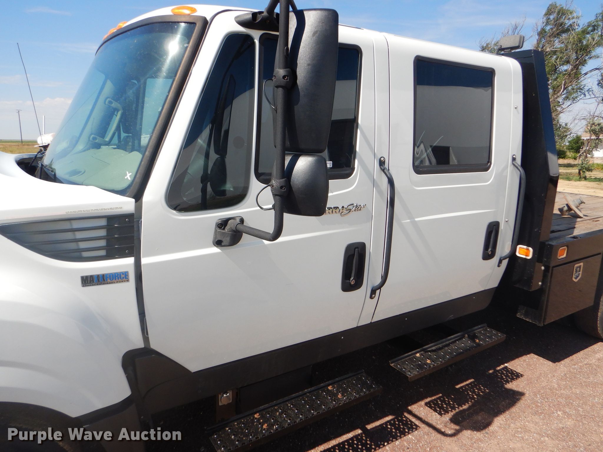 Purple Wave is selling a used Flat Bed Truck in Oklahoma. This item is a 2012 International TerraStar Crew Cab flatbed truck with the following: 55,464 miles on odometer, International MaxxForce 7 6.4L V8 diesel engine, Automatic transmission, Single axle, AC and heat, Power windows and locks, Brake controller, 9'3"L x 96"W flatbed, Gooseneck ball, Spring suspension, Hydraulic brakes, 225/70R19.5 tires, GVWR 19,500 lbs, Two-way radio not included