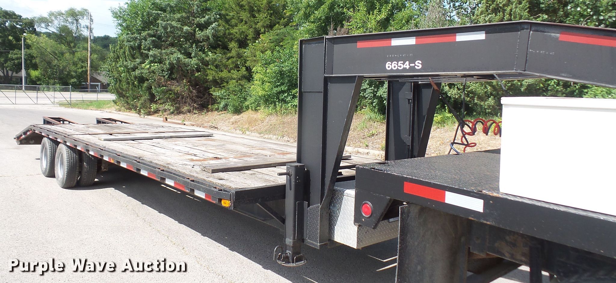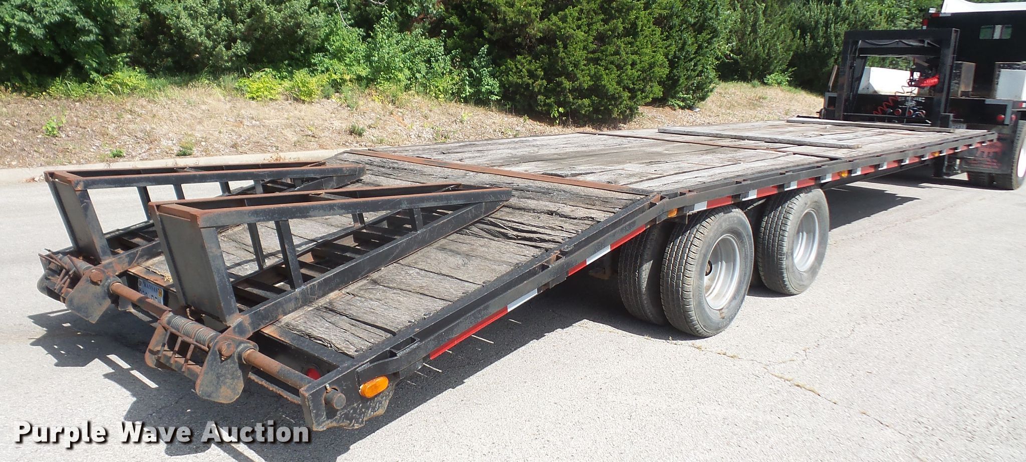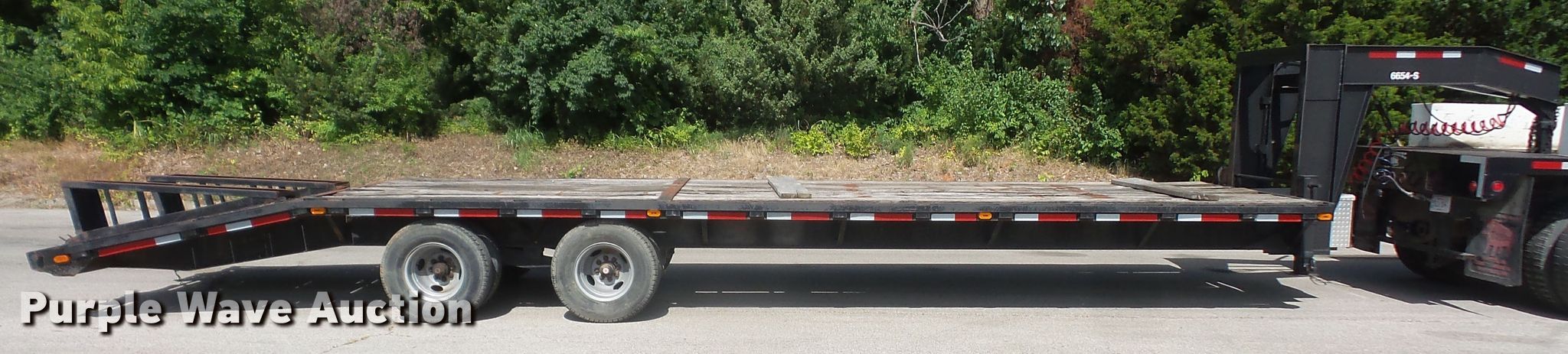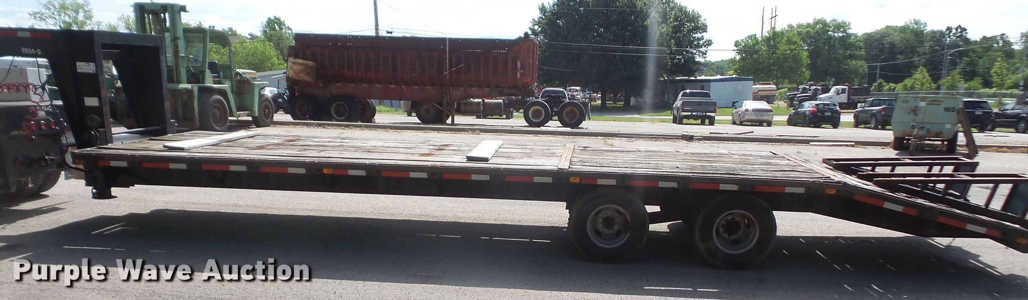 Purple Wave is selling a used Equip. Trailer in Kansas. This item is a 1996 Starlite equipment trailer with the following: 31'L overall length, 25'L x 101.5"W wood deck, 6' tail length, 5'L ramps, Dual leg landing gear, Spring suspension, Air brakes, Tandem axle, 235/85R16 tires