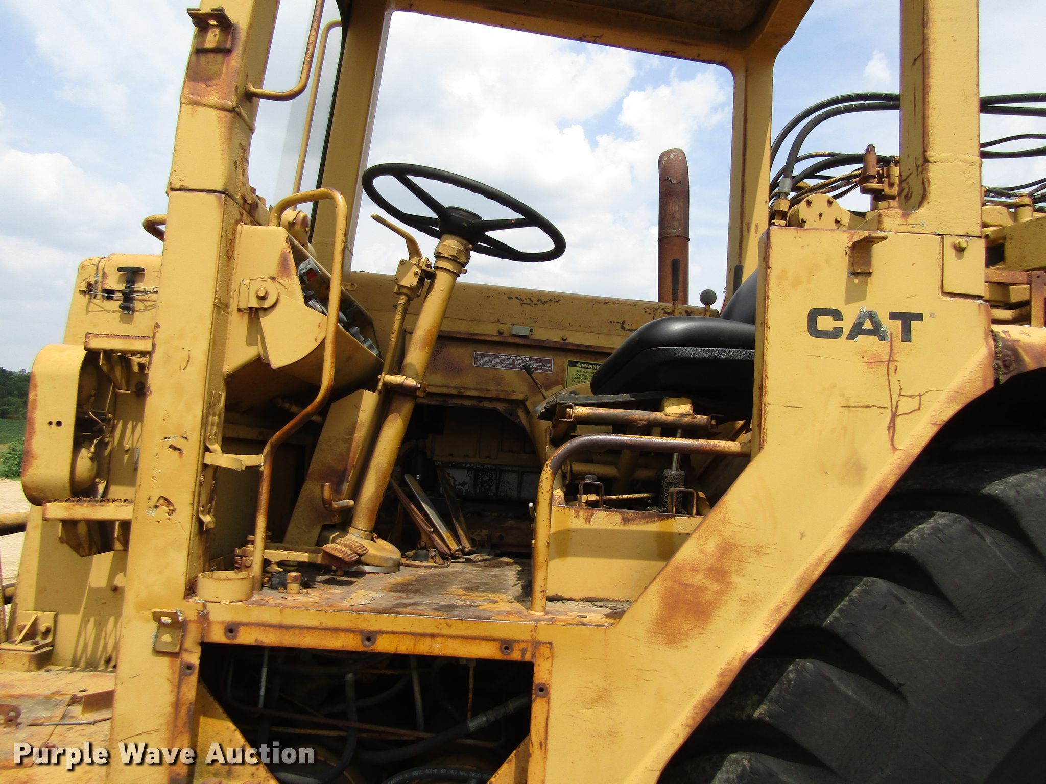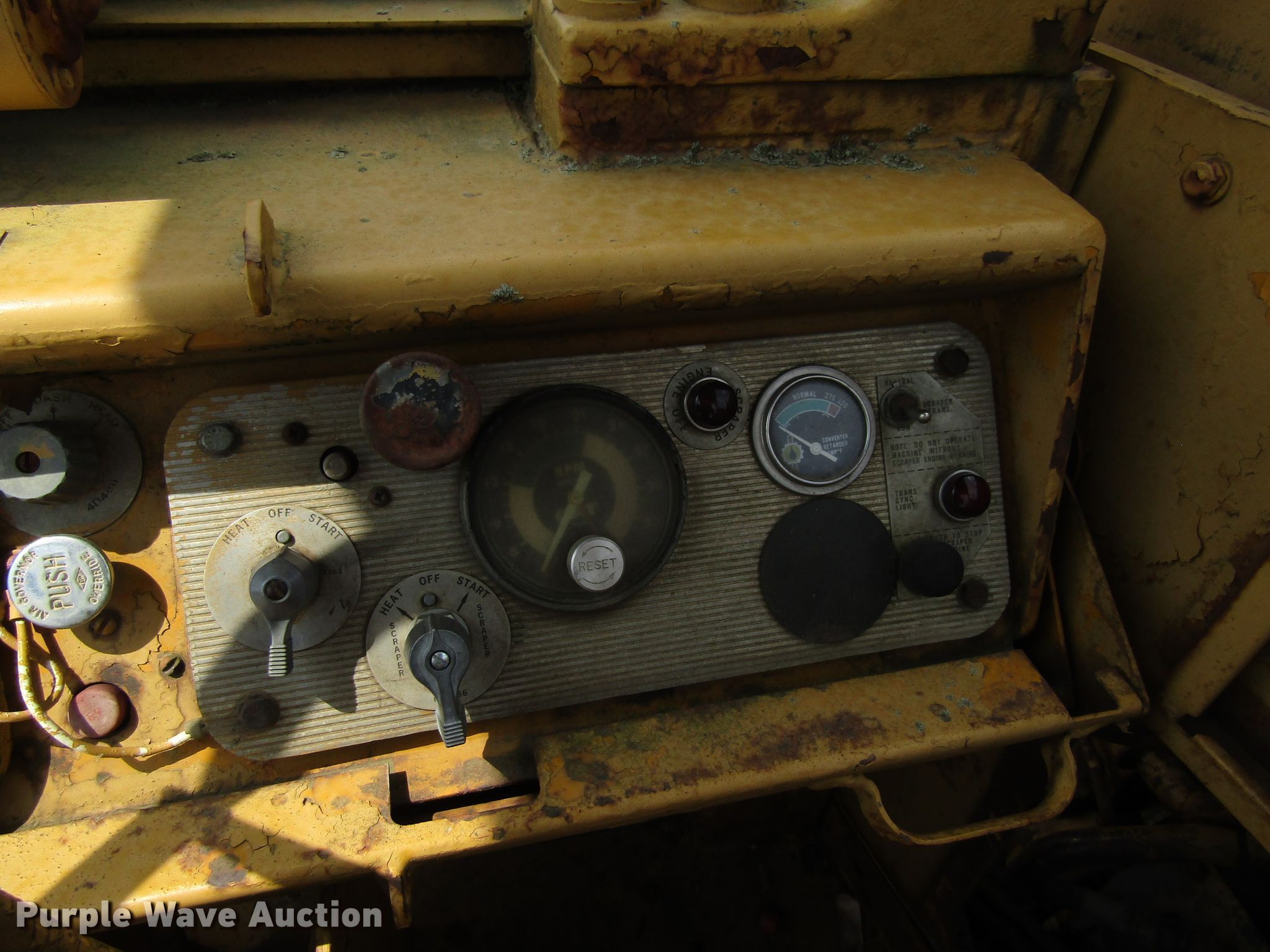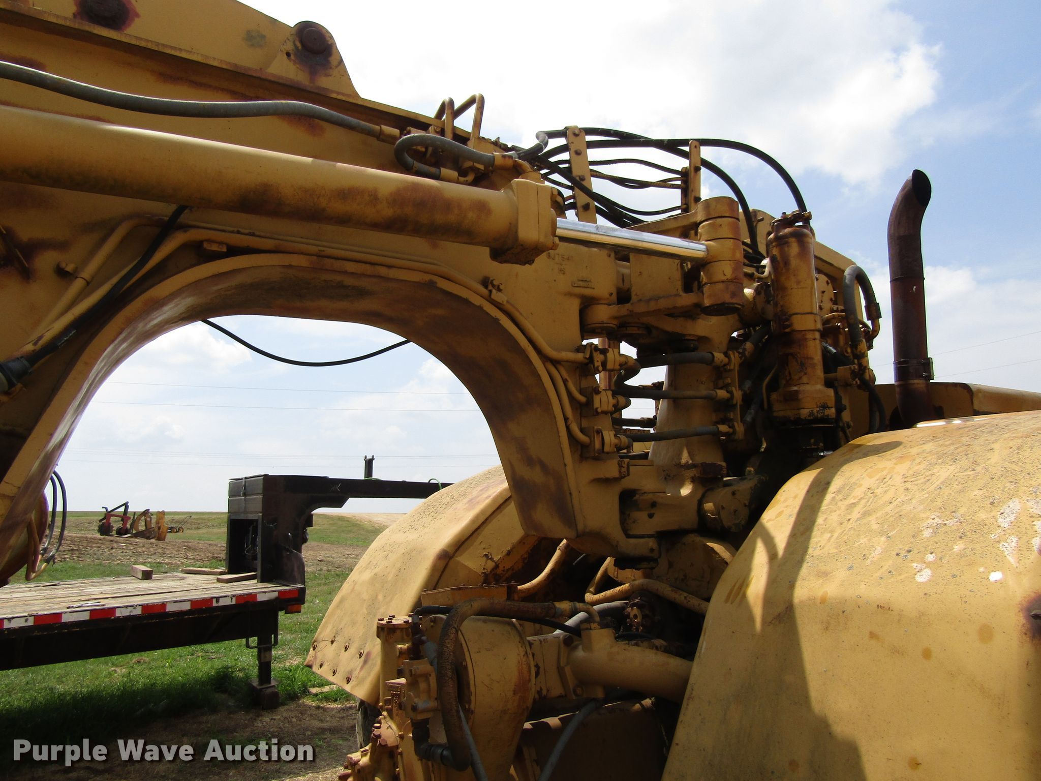 Purple Wave is selling a used Conventional Scraper in Iowa. This item is a 1974 Caterpillar 627B conventional scraper with the following: 12,188 hours on meter, Caterpillar 3306 six cylinder diesel engines, Powershift transmission, 8F-1R gears, OROPS, 21 cu.yd. bowl capacity, Reversible cutting edge, Hydraulic lift, Three lever controls, Cushion hitch, 29.5-35 tires, Serial 14S50