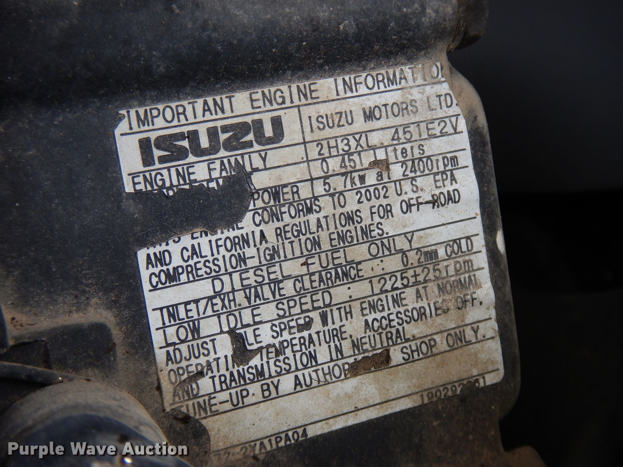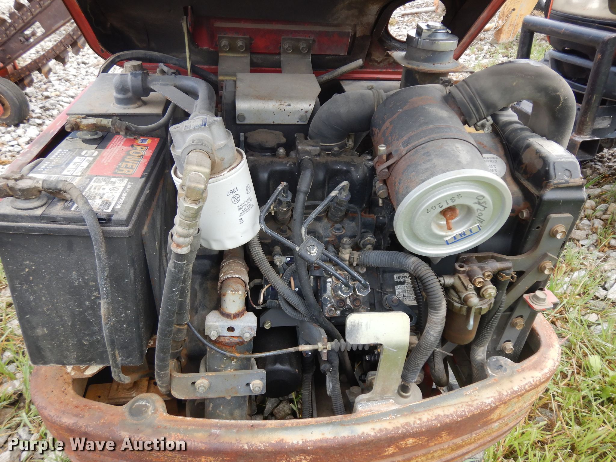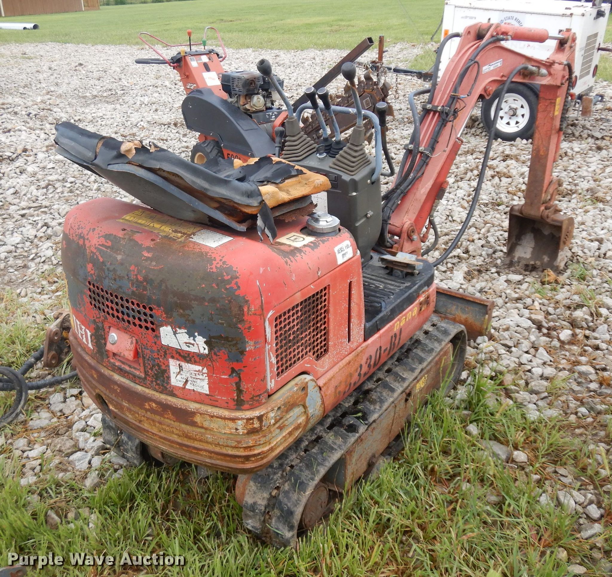 Purple Wave is selling a used Mini Excavator in Kansas. This item is a IHI mini excavator with the following: 1,947 hours on meter, Isuzu two cylinder diesel engine, Serail 506248, Hydrostatic transmission, 31"W backfill blade, Weing boom, 28" stick length, 12"W bucket, Weld-on cutting edge, (4) teeth, Breaker, Auxiliary hydraulics, 7"W rubber tracks, Serial BR001425