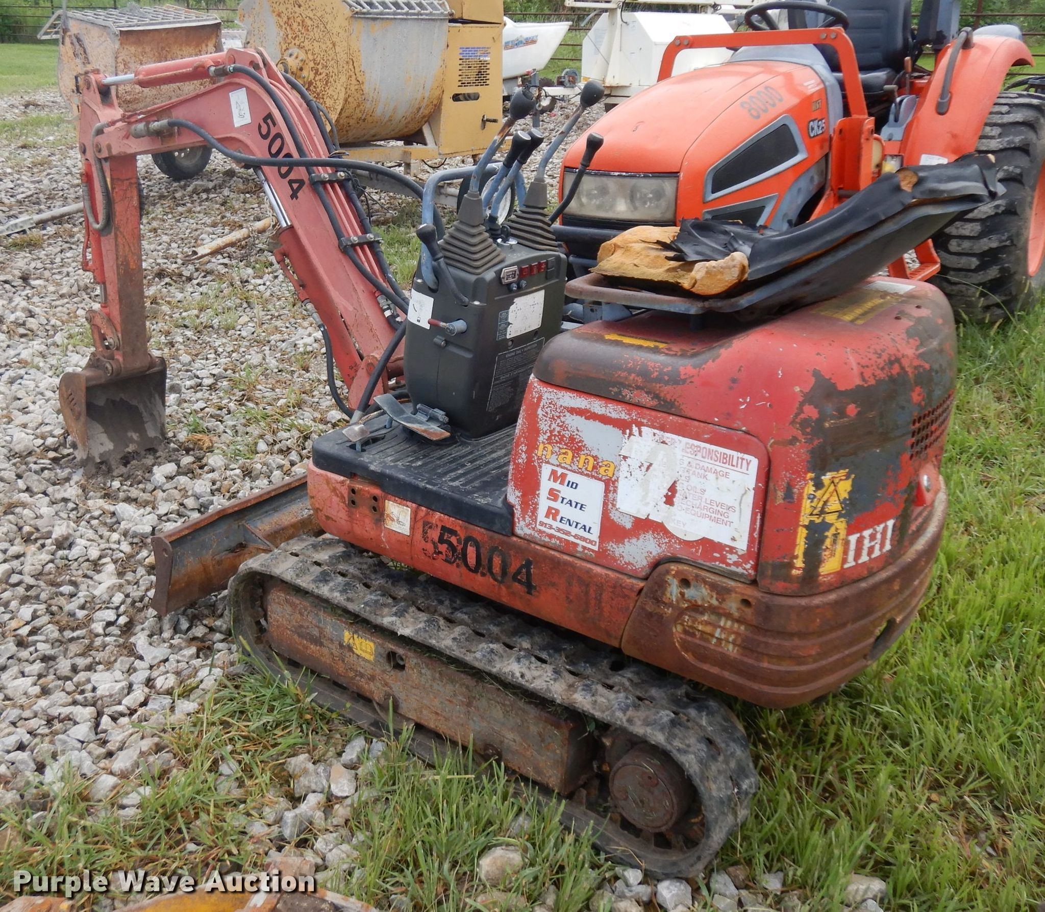 IHI mini excavator. 1,947 hours on meter, Isuzu two cylinder diesel engine Serail 506248, Hydrostatic transmission, 31"W backfill blade, Weing boom, 28" stick length, 12"W bucket Weld-on cutting edge, (4) teeth, Breaker, Auxiliary hydraulics, 7"W rubber tracks, Serial BR001425. Mid-State Rental. 11231 Tucker Rd. Pleasanton, KS 66075