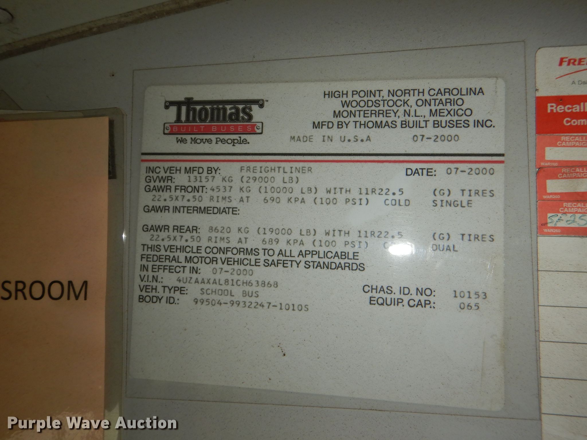 Purple Wave is selling a used Bus in Kansas. This item is a 2001 Freightliner FS65 school bus with the following: 164,275 miles on odometer, 7,517 hours on meter, Caterpillar 3126 7.2L L6 diesel engine, Serial 8YL70127, Automatic transmission, Single axle, Heat, Heated mirrors, 65 passenger capacity, Spring suspension, Hydraulic brakes, 254" wheelbase, Firestone 11R22.5 tires, GVWR 29,000 lbs, Maintenance records available upon request, Unit# 19