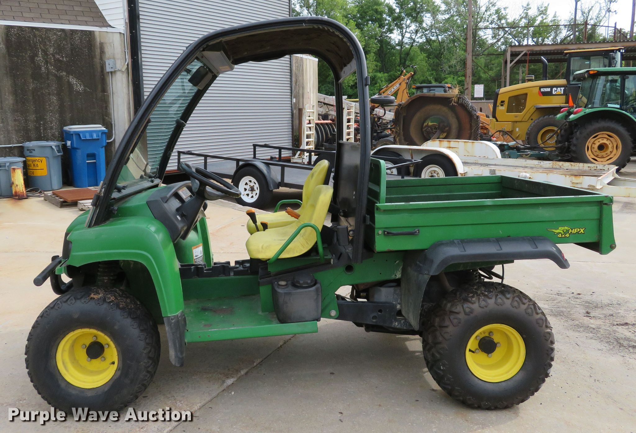 Purple Wave is selling a used Utility Vehicle in Missouri. This item is a John Deere Gator HPX utility vehicle with the following: 2,972 hours on meter, Kawasaki gas engine, CVT transmission, Four wheel drive, OROPS, Two passenger capacity, 42"L x 49"W electric over hydraulic dump bed, Receiver hitch, 24 x 9.5-10 tires, Non-operational transmission