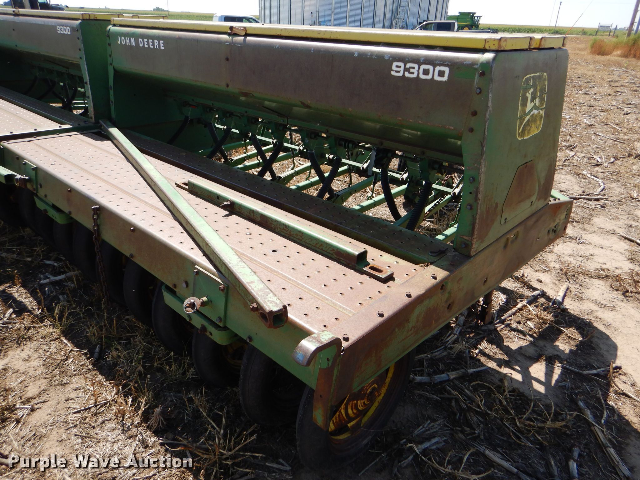 Purple Wave is selling a used Grain Drill or Seeder in Kansas. This item is a (4) John Deere 9300 hoe grain drill with the following: 40'W overall, 12" row spacing, Bulk fill system, (4) 10' boxes, Hydraulic lift, Rubber press wheels, 11L-14SL tires, Serial 011825N, 011816N, 011824N, 011812N