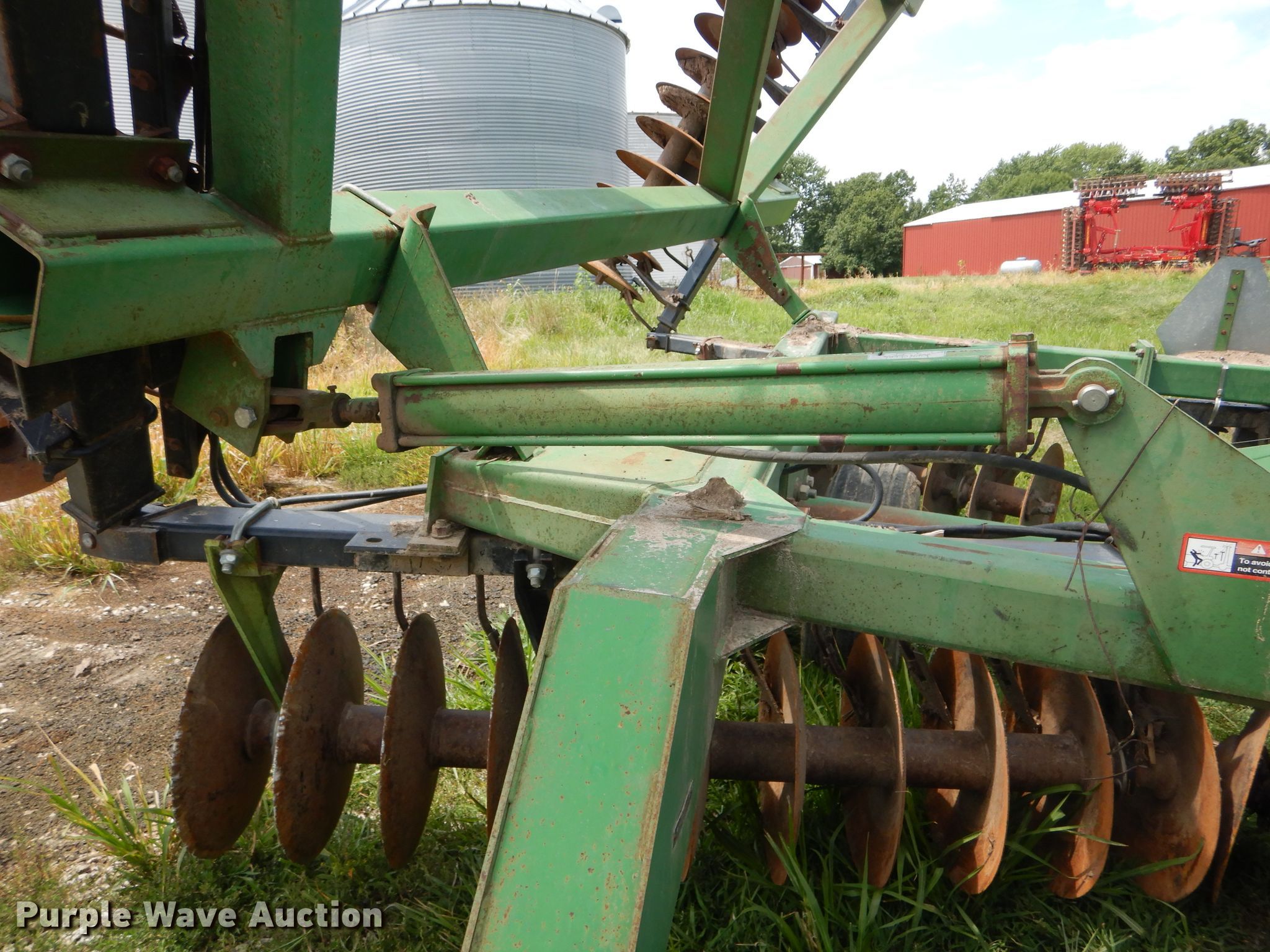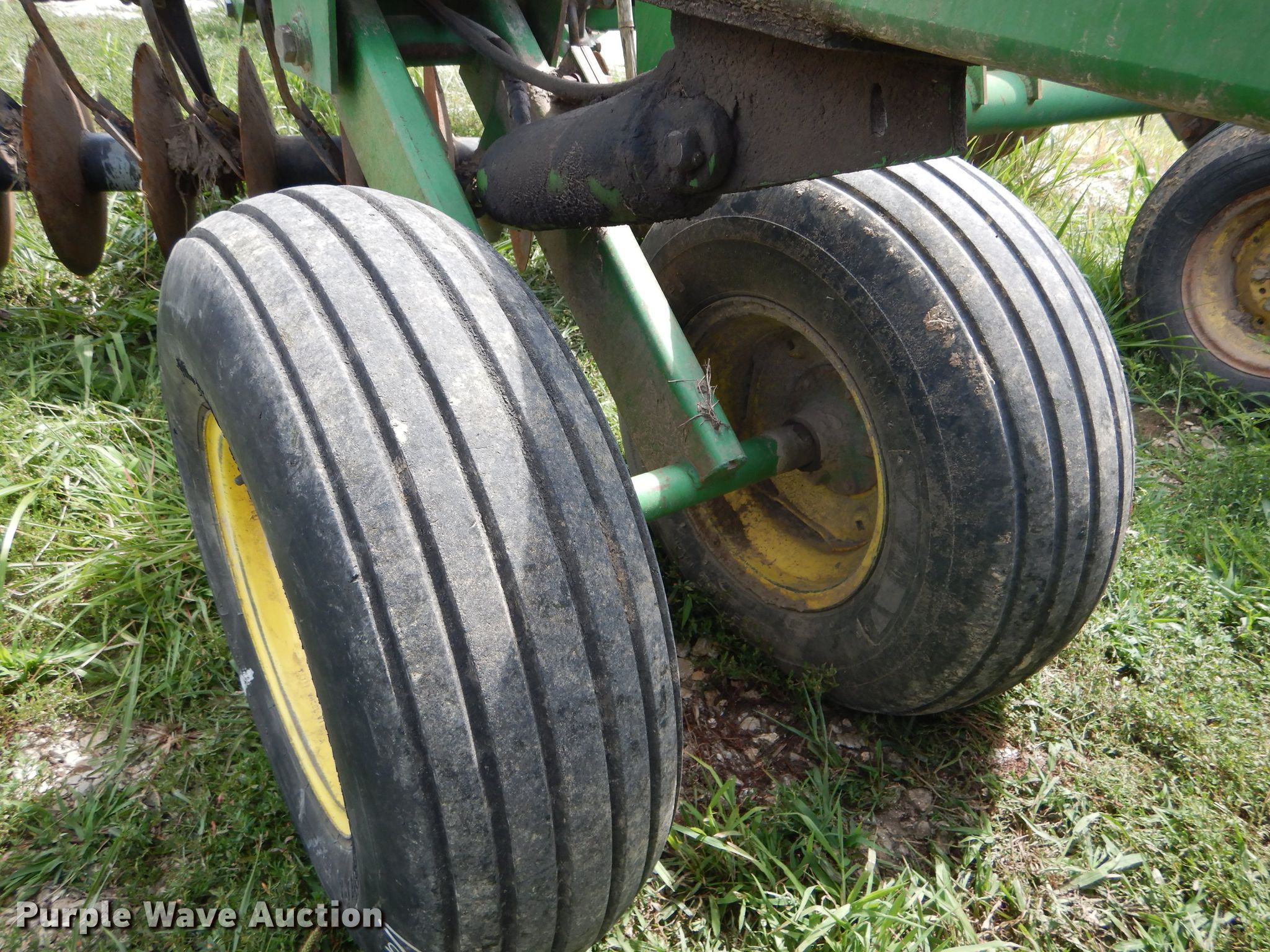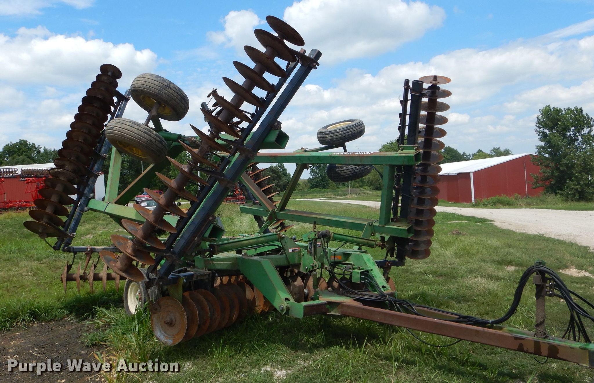 Purple Wave is selling a used Disk in Missouri. This item is a John Deere 630 double off-set disk with the following: 30'W, 17" diameter front disks, 18" diameter rear disks, 8" spacing, Disk scrapers, Hydraulic leveler, Hydraulic lift and fold, Transport lights, Walking tandem axle, 11L-15SL tires, Serial N00630X010754