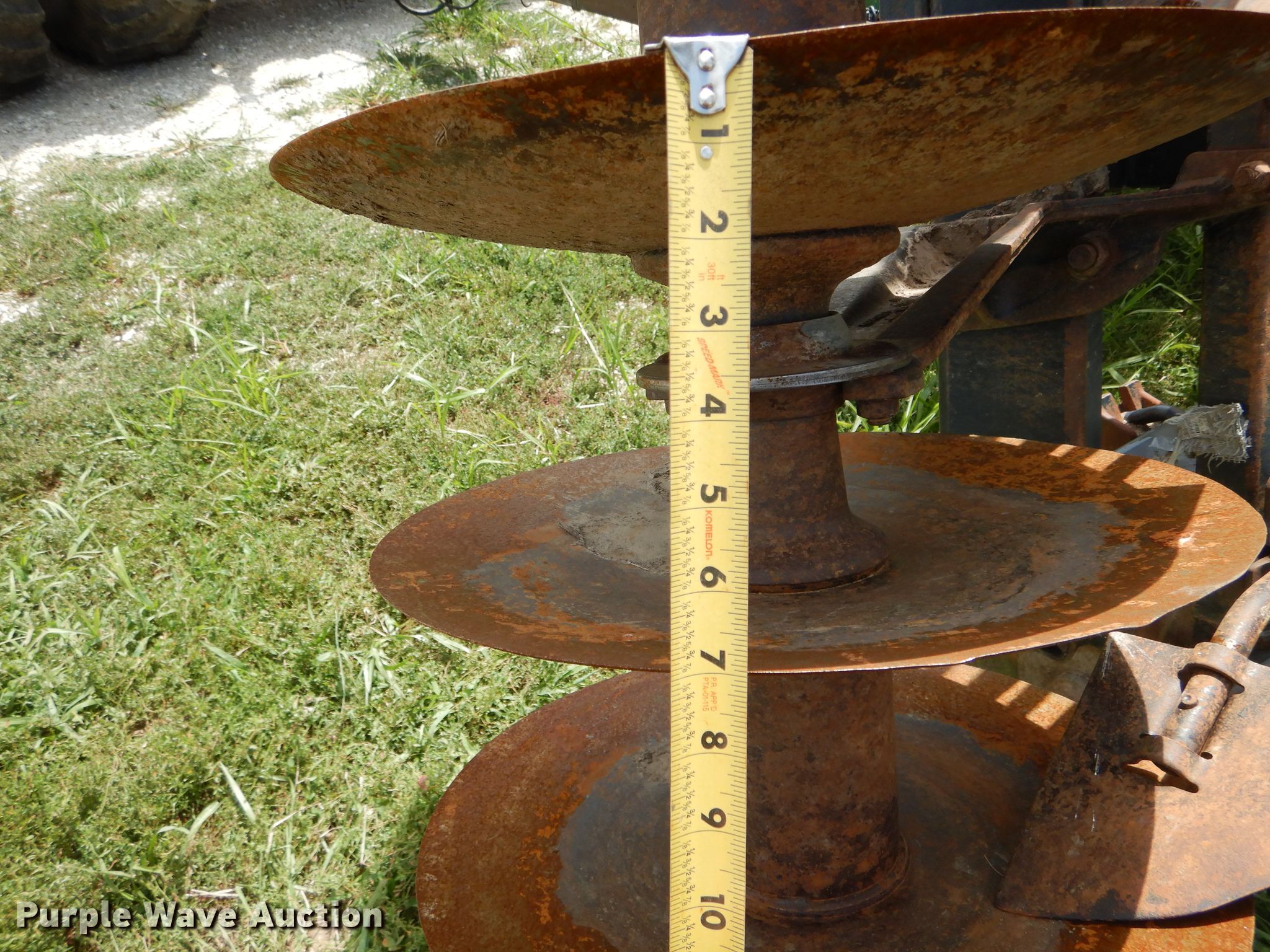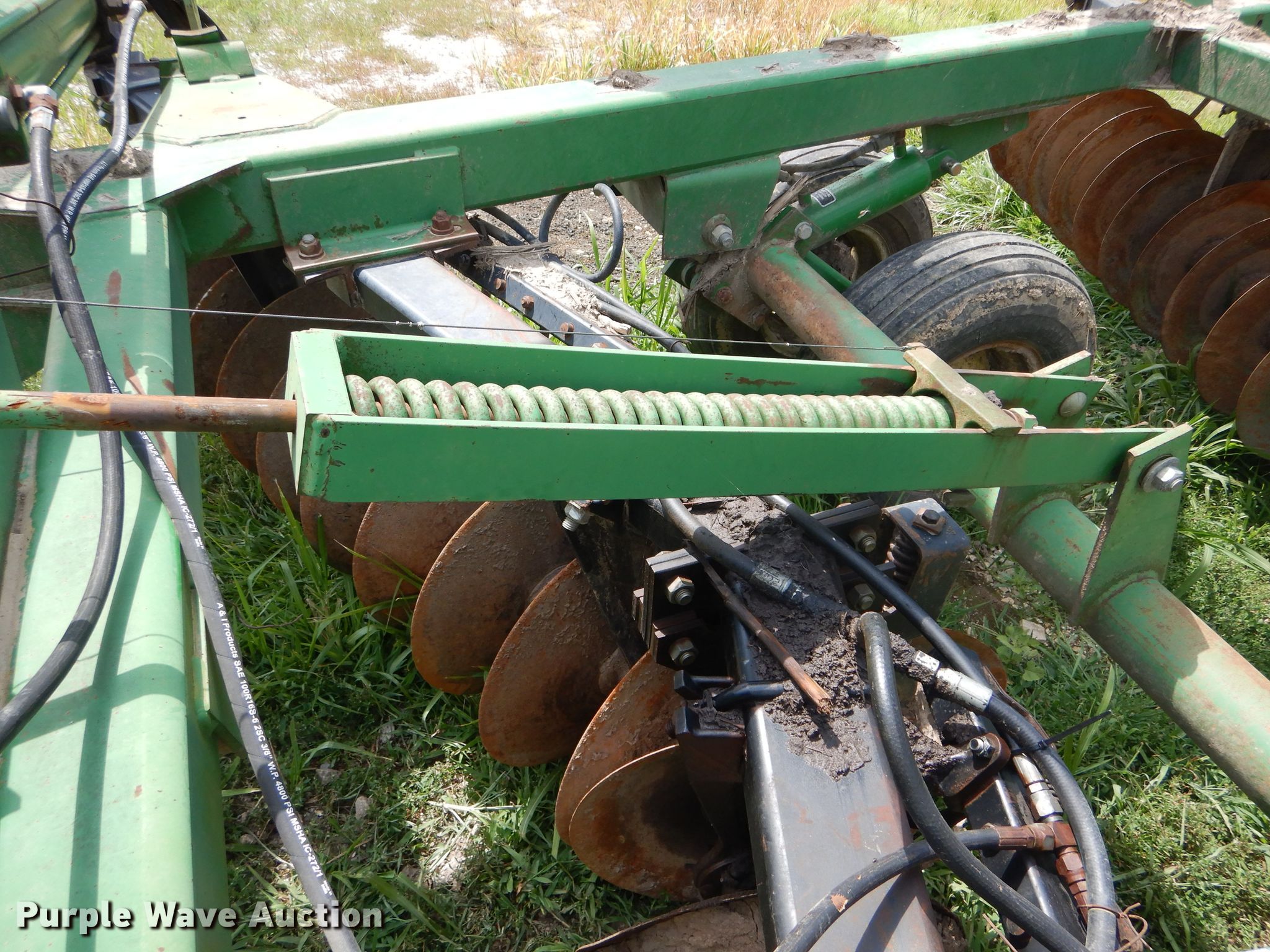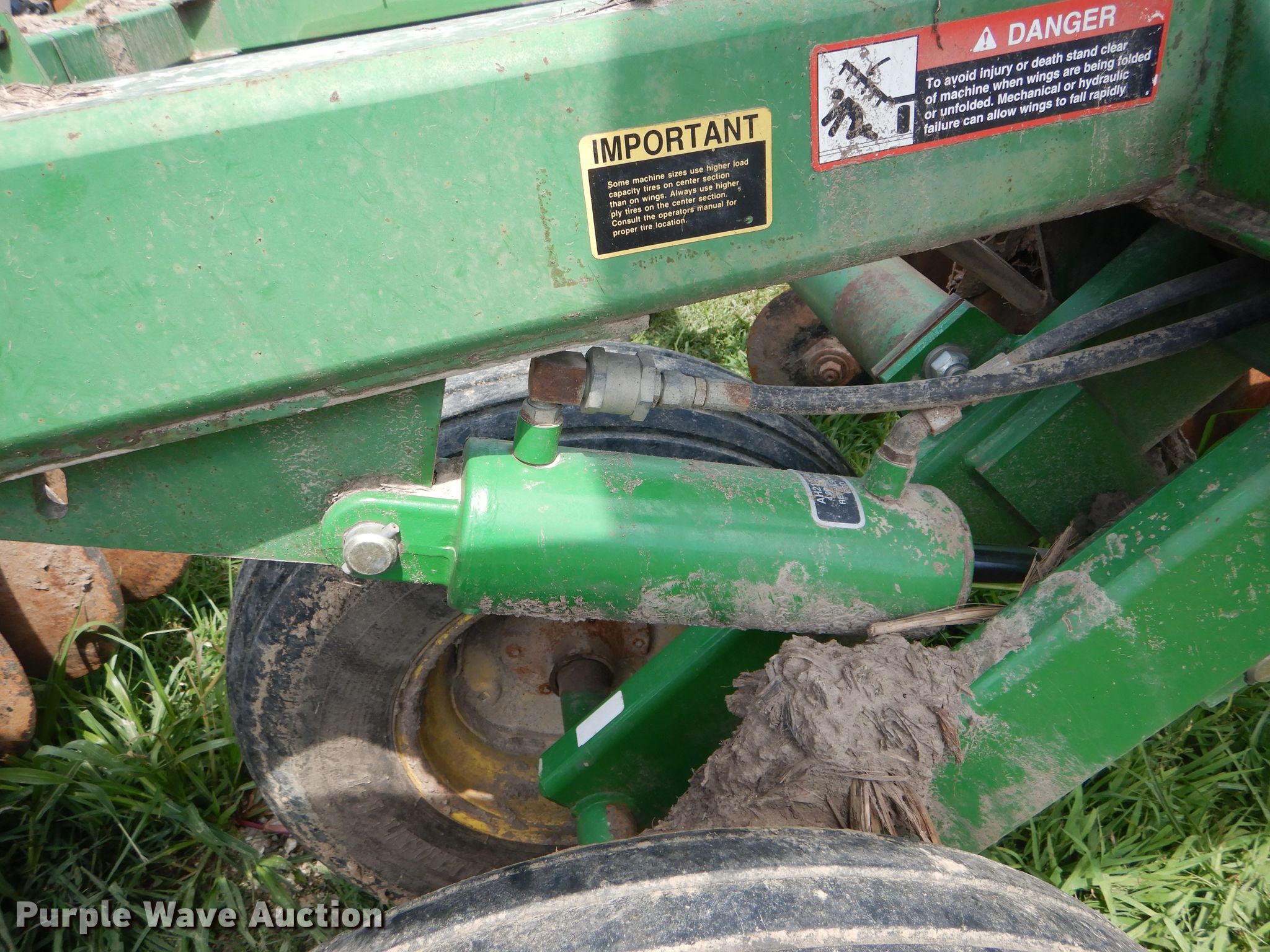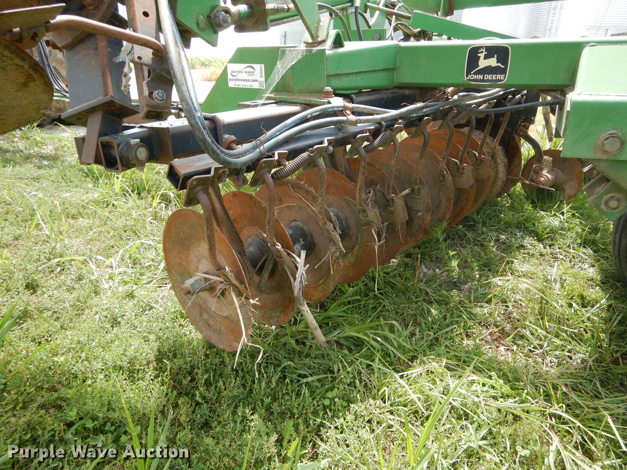 Purple Wave is selling a used Disk in Missouri. This item is a John Deere 630 double off-set disk with the following: 30'W, 17" diameter front disks, 18" diameter rear disks, 8" spacing, Disk scrapers, Hydraulic leveler, Hydraulic lift and fold, Transport lights, Walking tandem axle, 11L-15SL tires, Serial N00630X010754