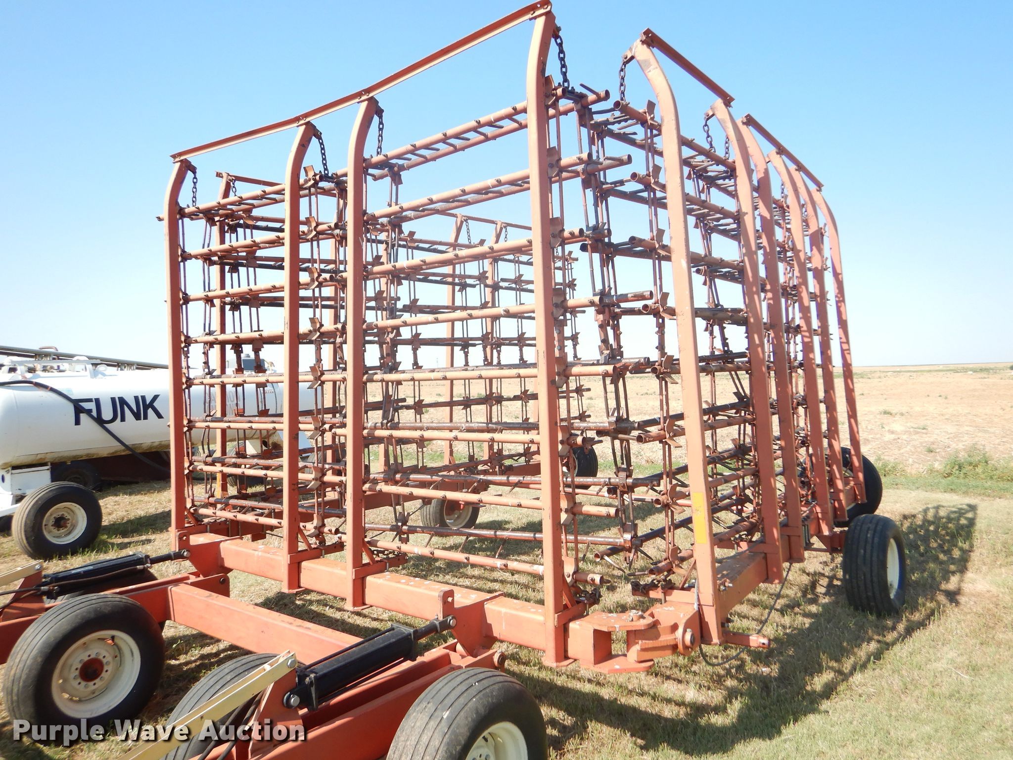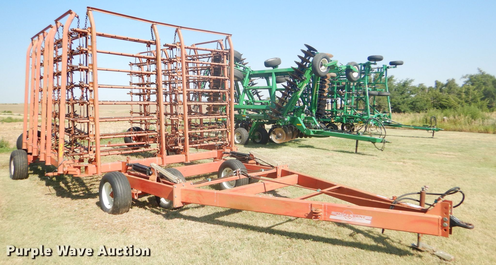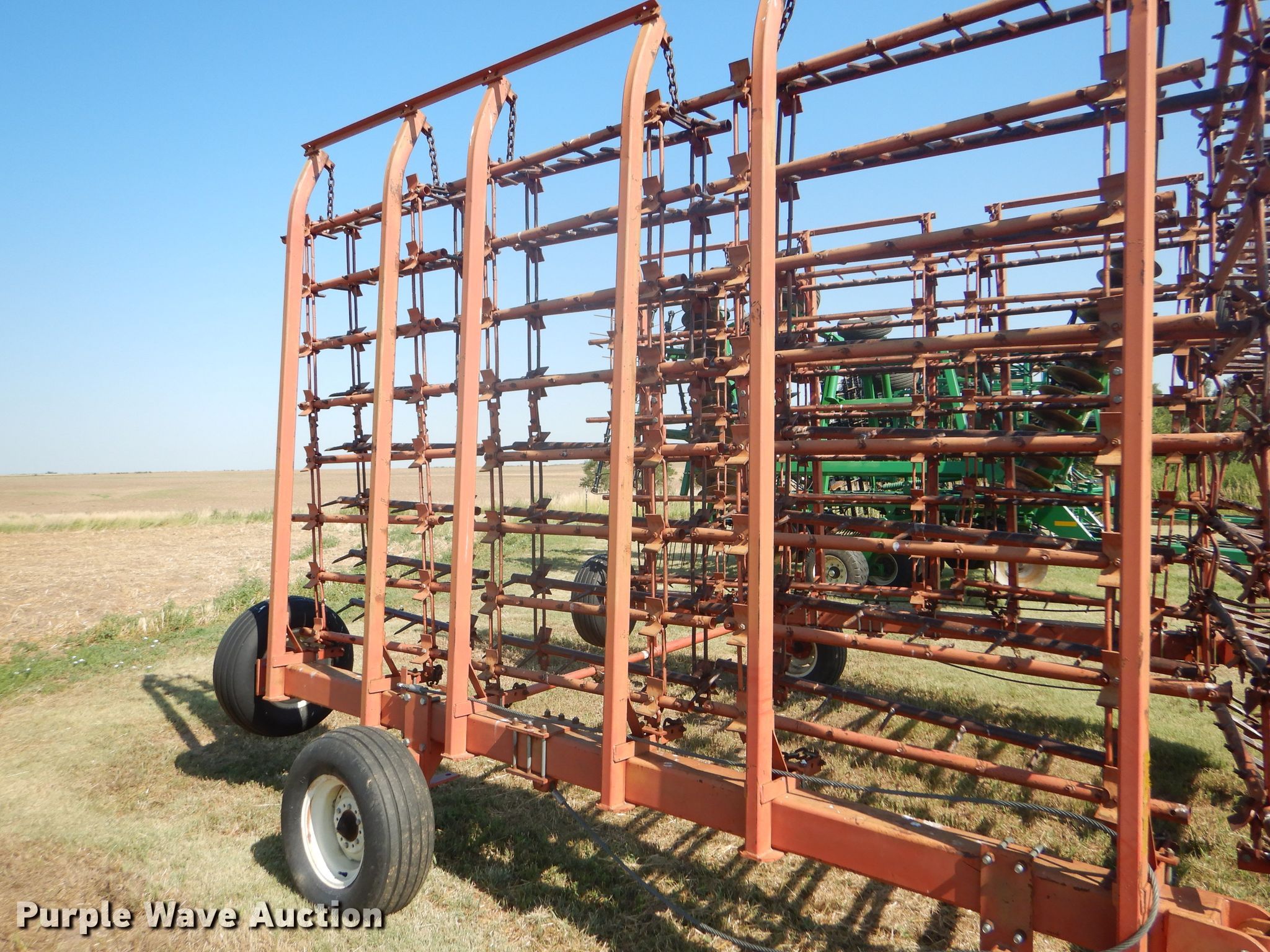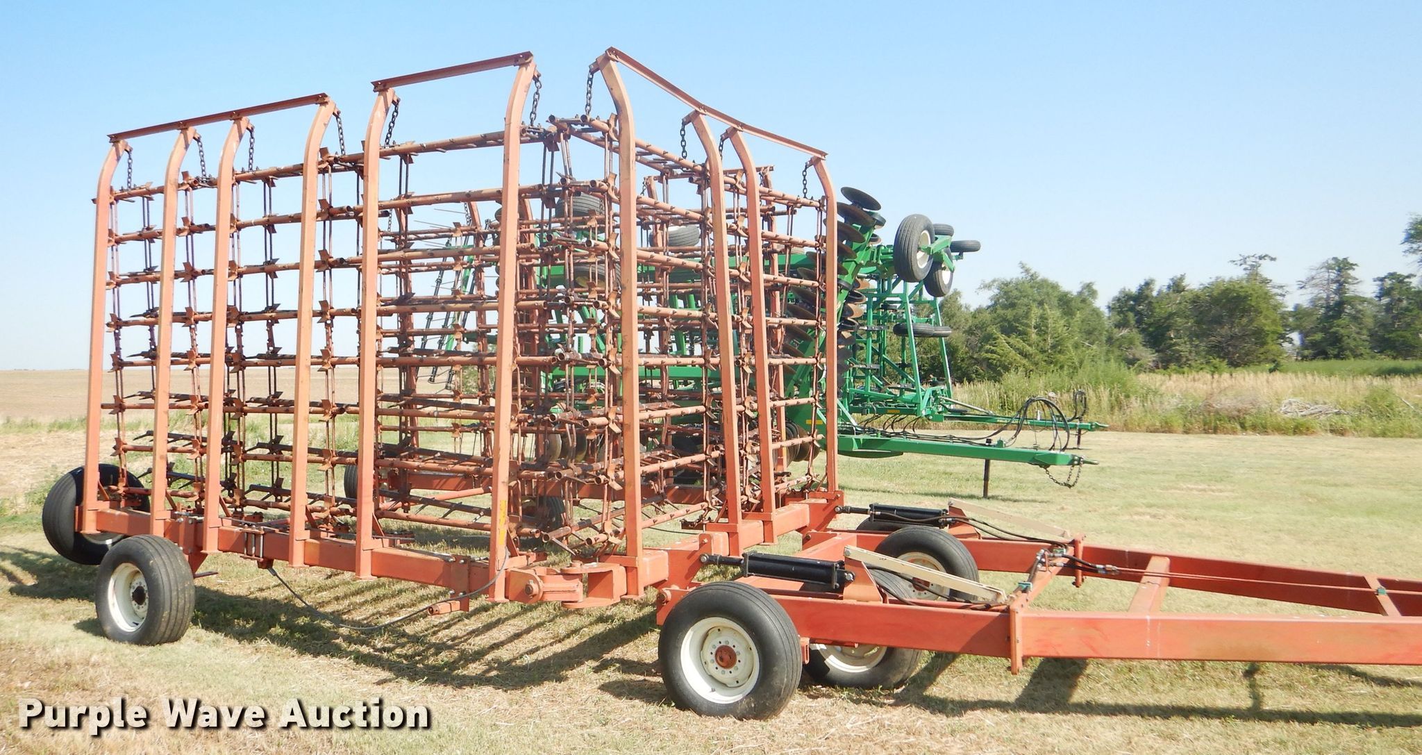 Purple Wave is selling a used Tillage Other in Kansas. This item is a McFarlane drag harrow with the following: 35'W, (16) spike tooth drag bars, Approx. 5" spike teeth, Hydraulic lift, 11L-15 tires