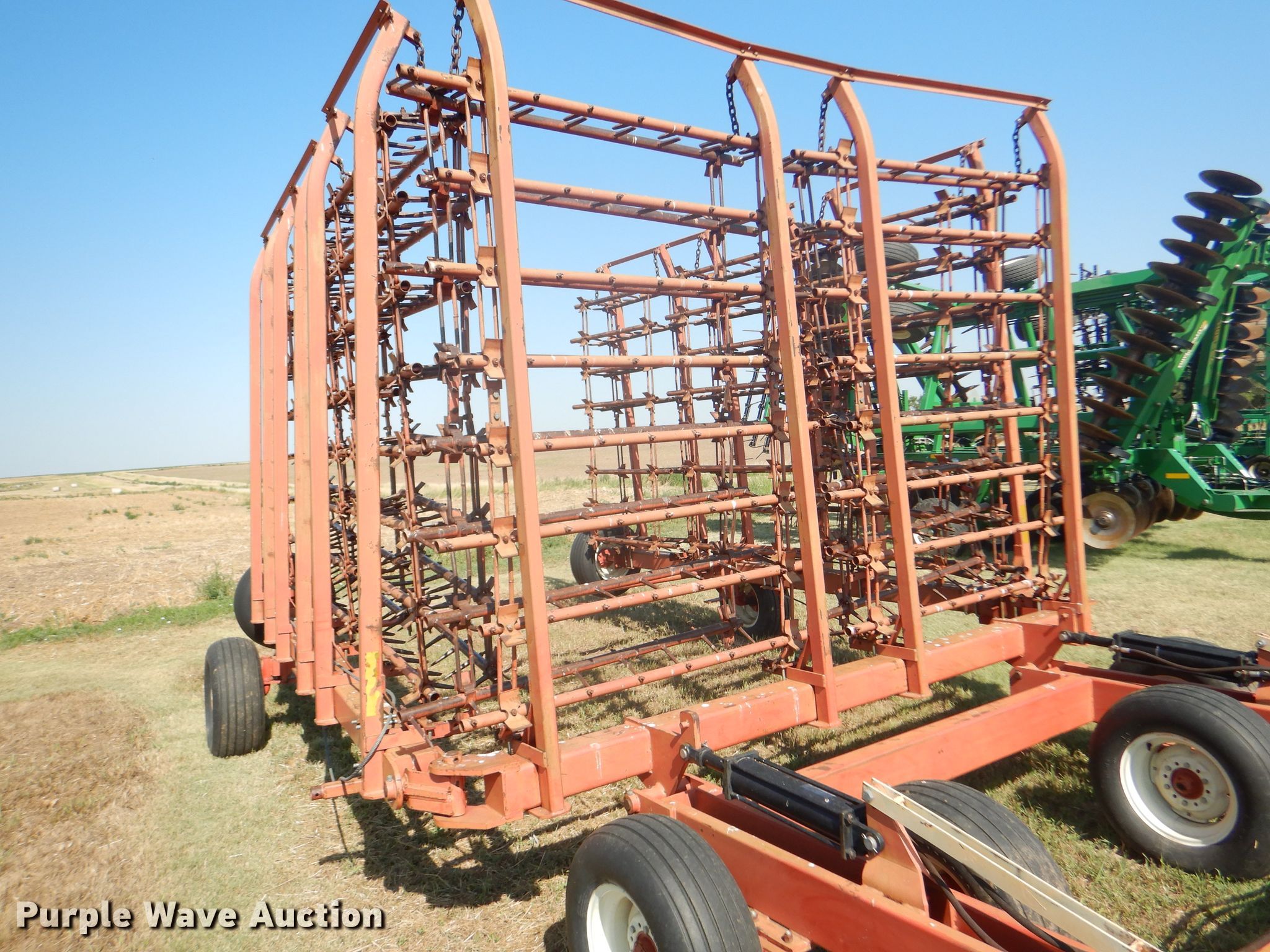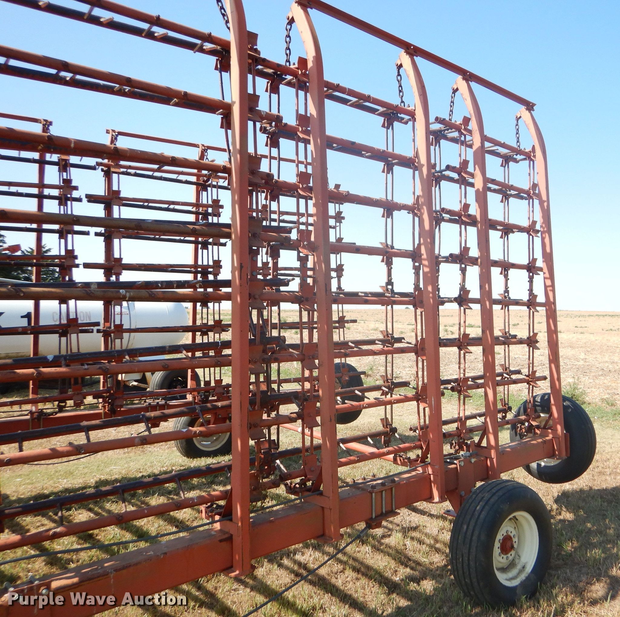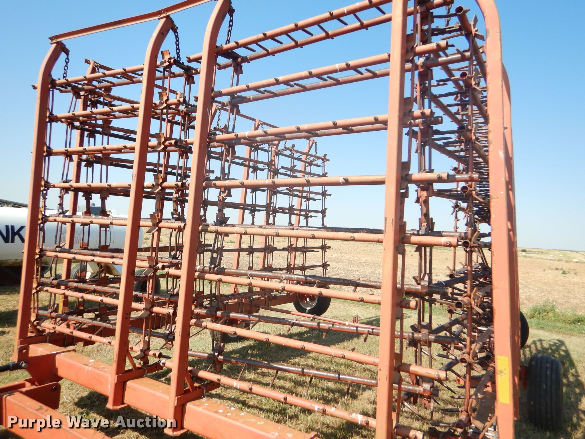 McFarlane drag harrow. 35'W, (16) spike tooth drag bars, Approx. 5" spike teeth, Hydraulic lift, 11L-15 tires. 1067 NW 210 Rd. Galatia, KS 67565