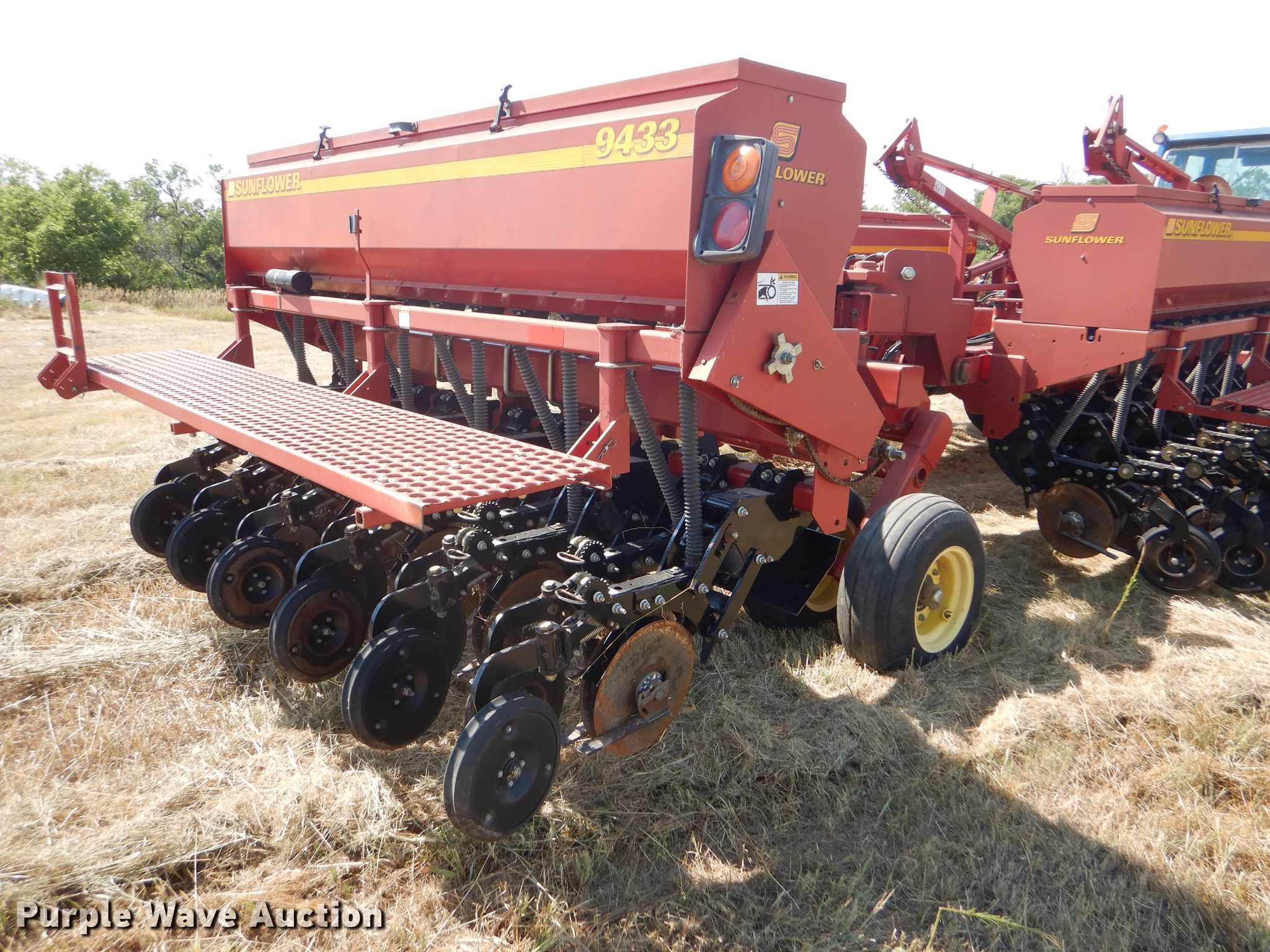 Purple Wave is selling a used Grain Drill or Seeder in Kansas. This item is a 2004 Sunflower 9433-30 grain drill with the following: 10,237 acres, 30'W, 36 row units, 10" row spacing, Marker arms, Hydraulic front fold, Bulk fill system, Ground meter drive, HD spring down pressure, Double disk openers, Seed firmers, Single rubber closing system, Shaft monitor, (4) 11L-15 transport tires, (7) 9.5L-15SL drive/outside tires